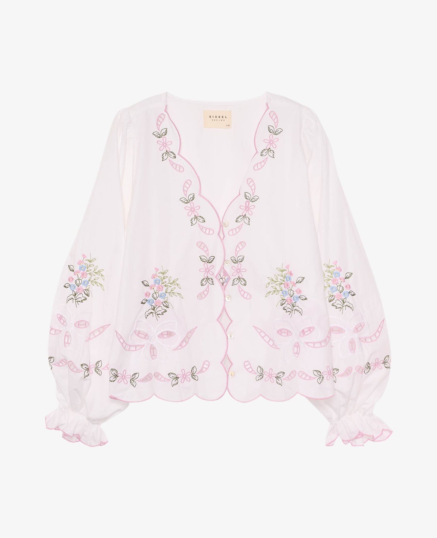 Valkoinen paita Sissel Edelbolta, jossa pastellinsävyinen kukkakirjonta edessä ja hihoissa. Paidassa on väljä istuvuus ja pitkät hihat.