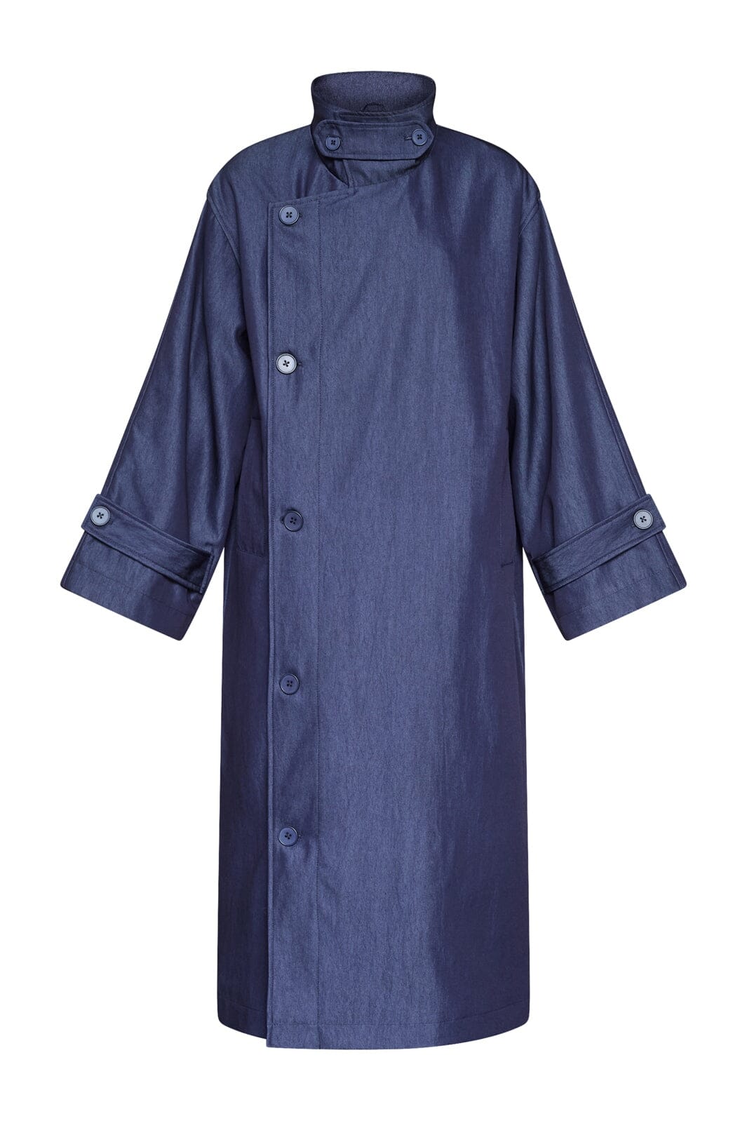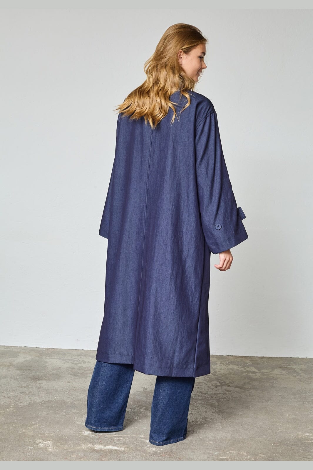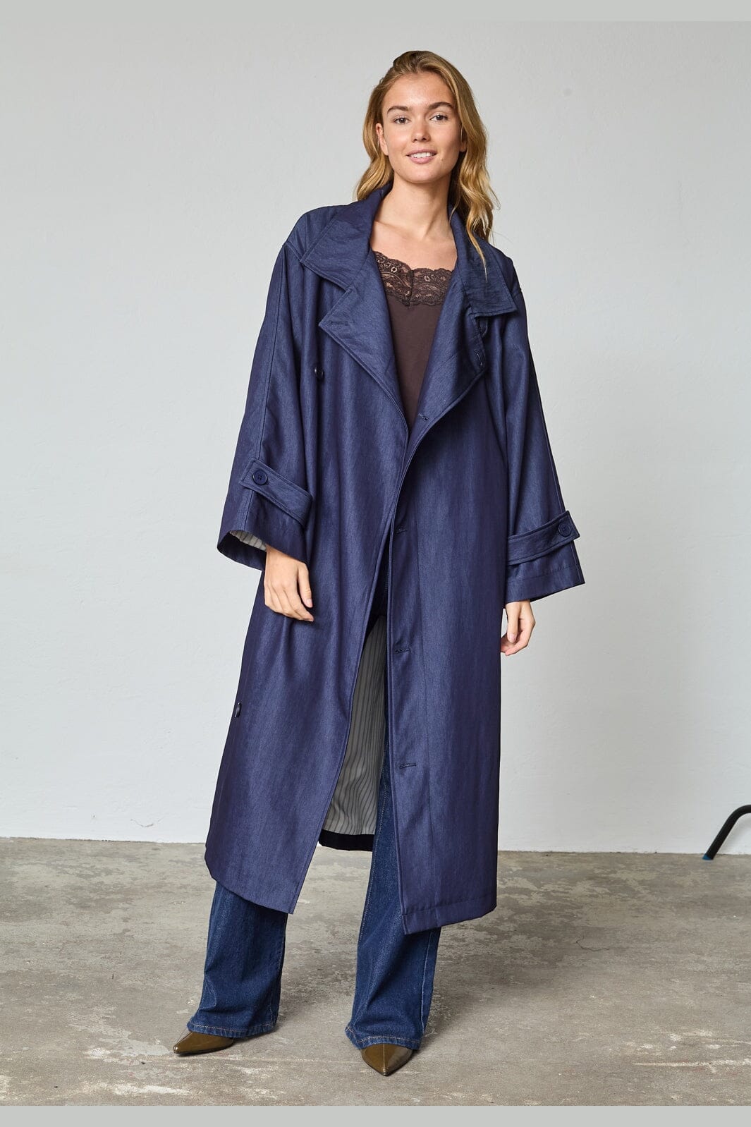 Pitkä tummansininen trenchcoat Sisters Pointilta. Takissa on oversize-mitoitus, leveä kaulus ja kaksirivinen napitus.