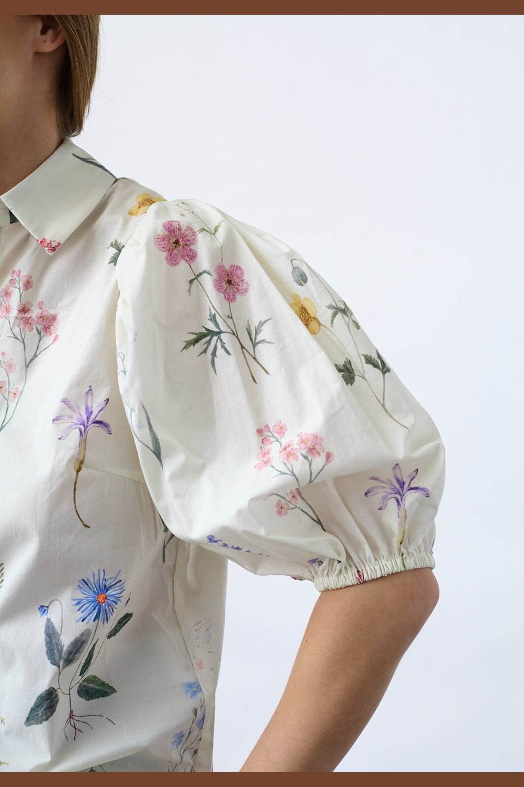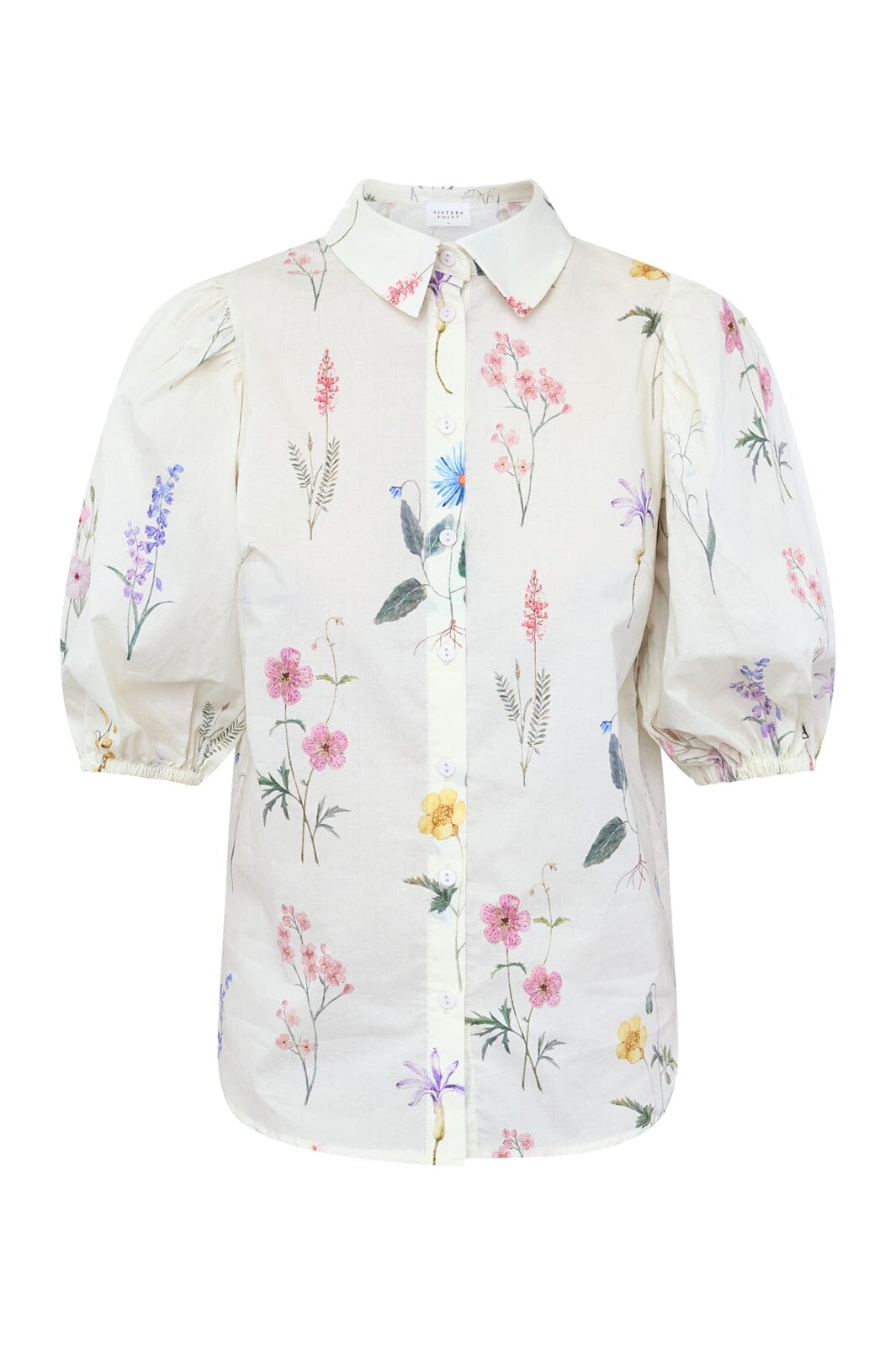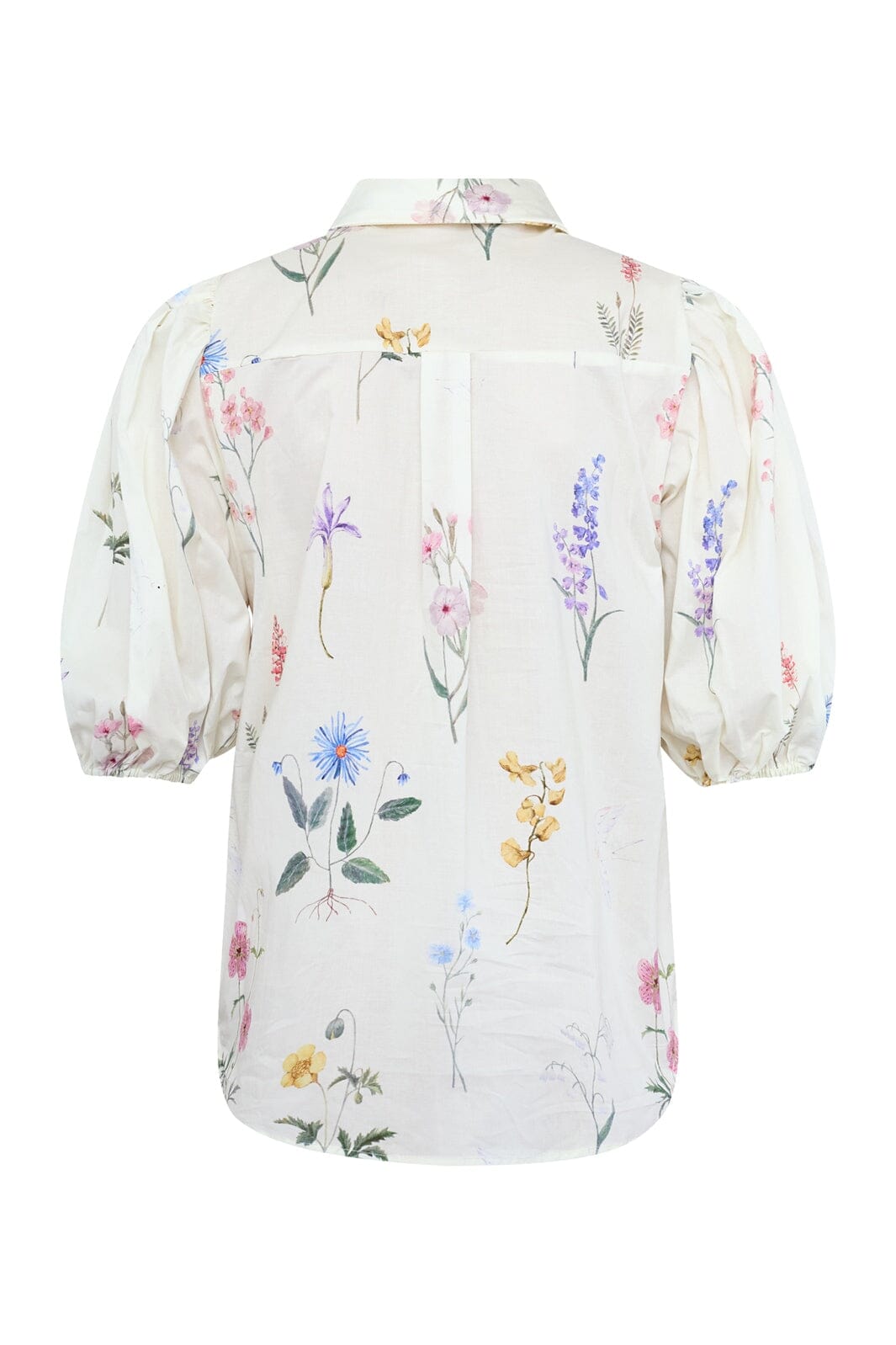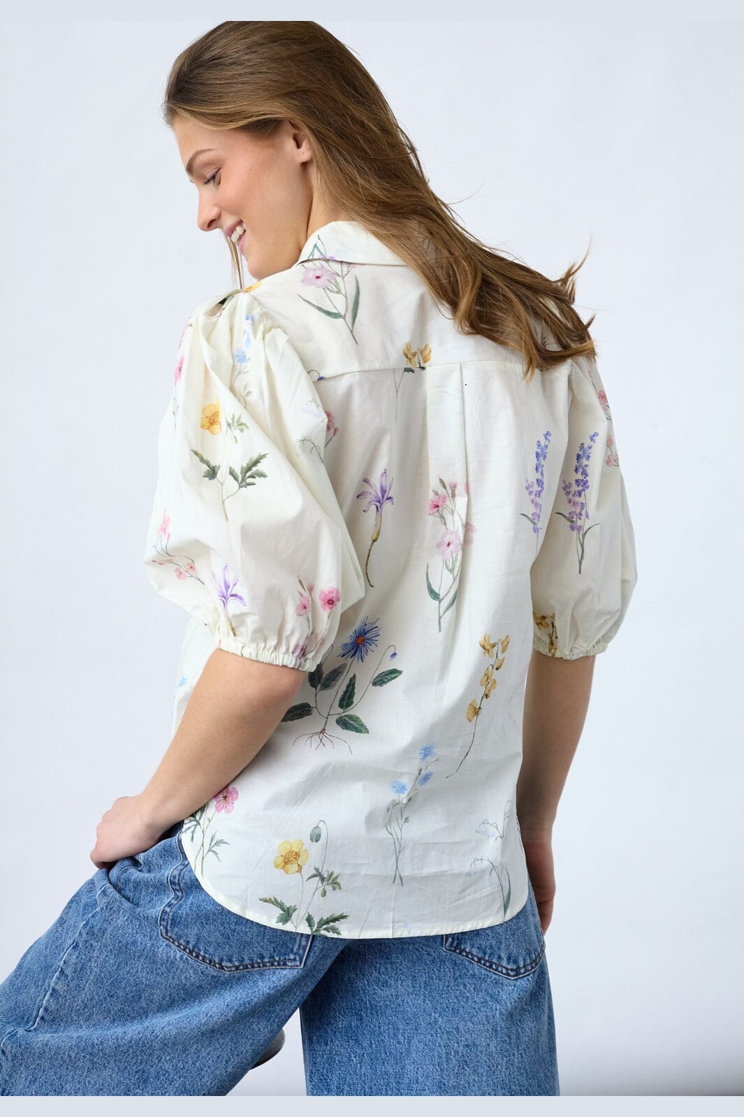Paita Sisters Pointilta vaaleassa kerman sävyssä, jossa on monivärinen kukkakuvio. Paidassa on lyhyet pussihihat ja klassinen paitakaulus nappikiinnityksellä.