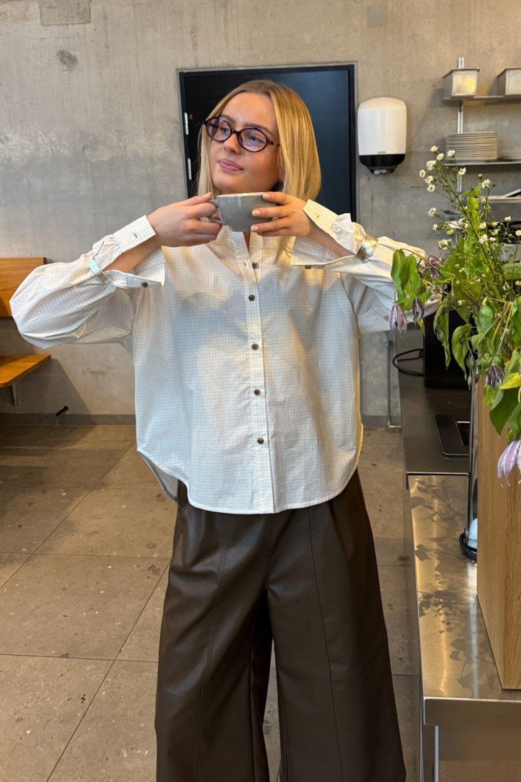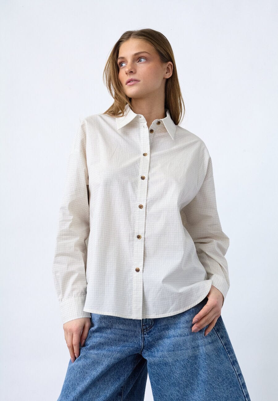 Ruudullinen paita Sisters Pointilta kermanvärisenä. Paidassa on hillitty ruutukuvio, oversize-istuvuus ja klassinen paitakaulus.