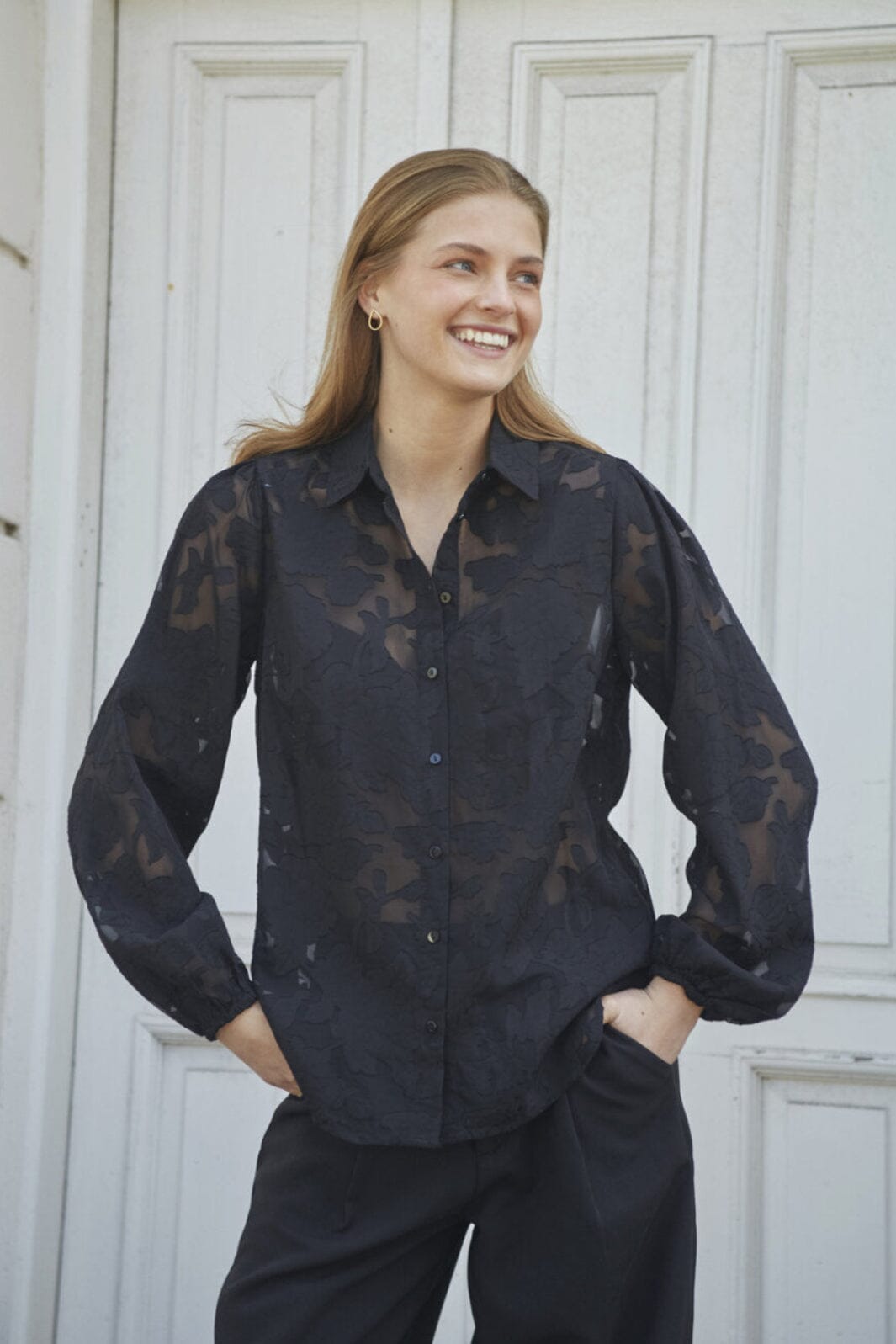 Musta paita Sisters Pointilta, jossa on läpinäkyvä kukkakuosi pitsistä. Paidassa on rento malli, klassinen kaulus ja nappilukitus edessä. Pitkät hihat päättyvät mansetteihin.