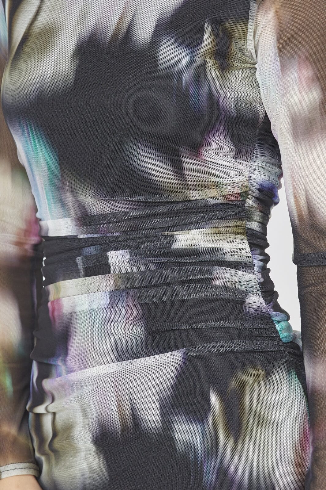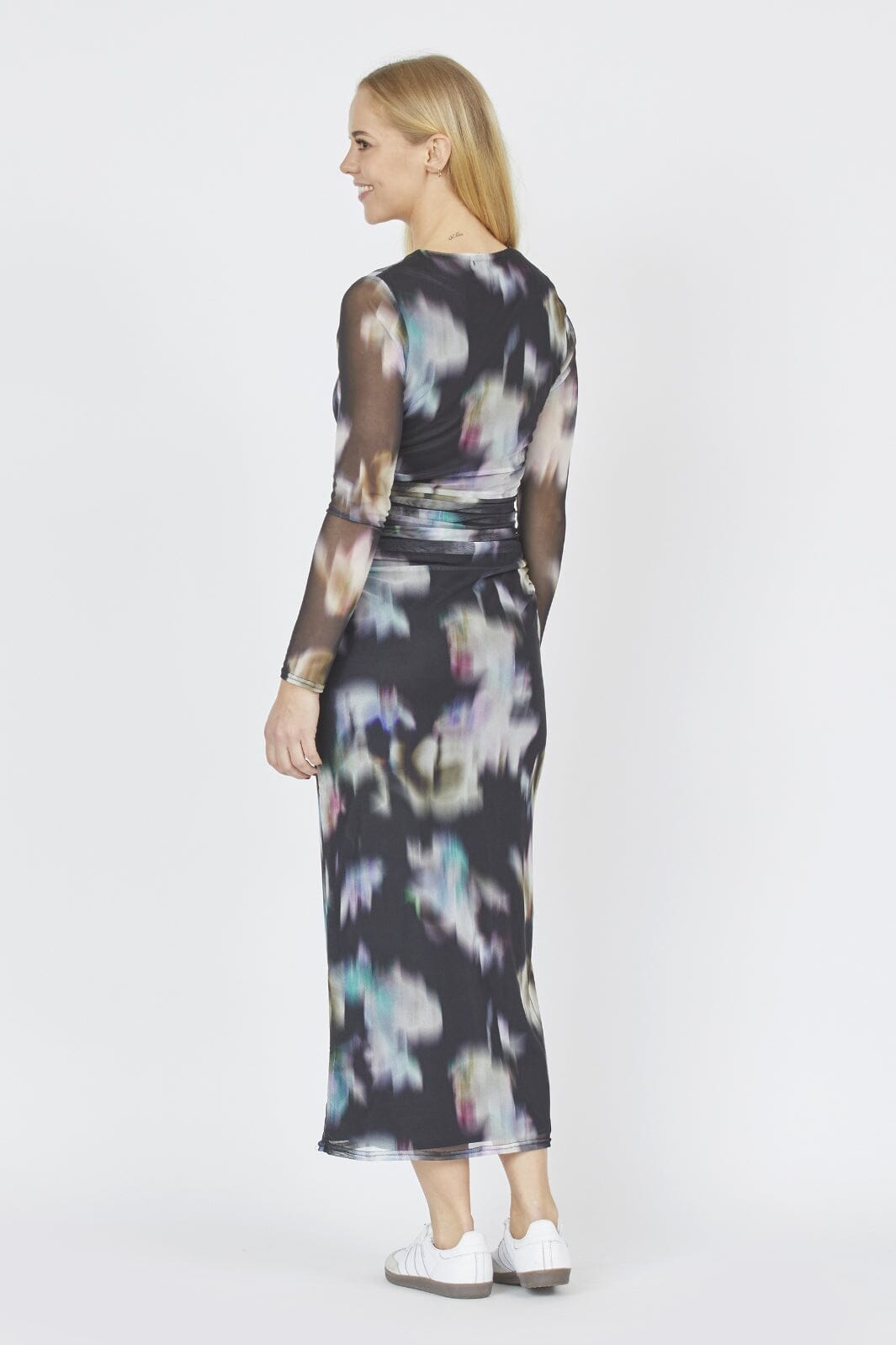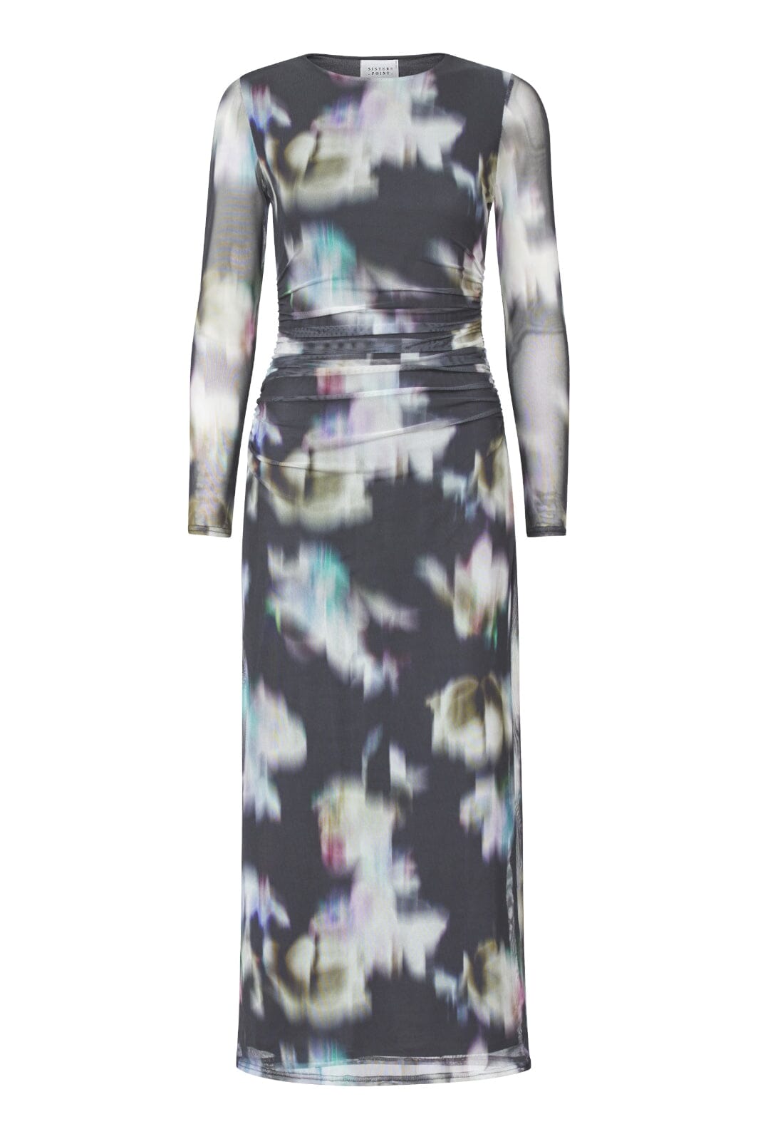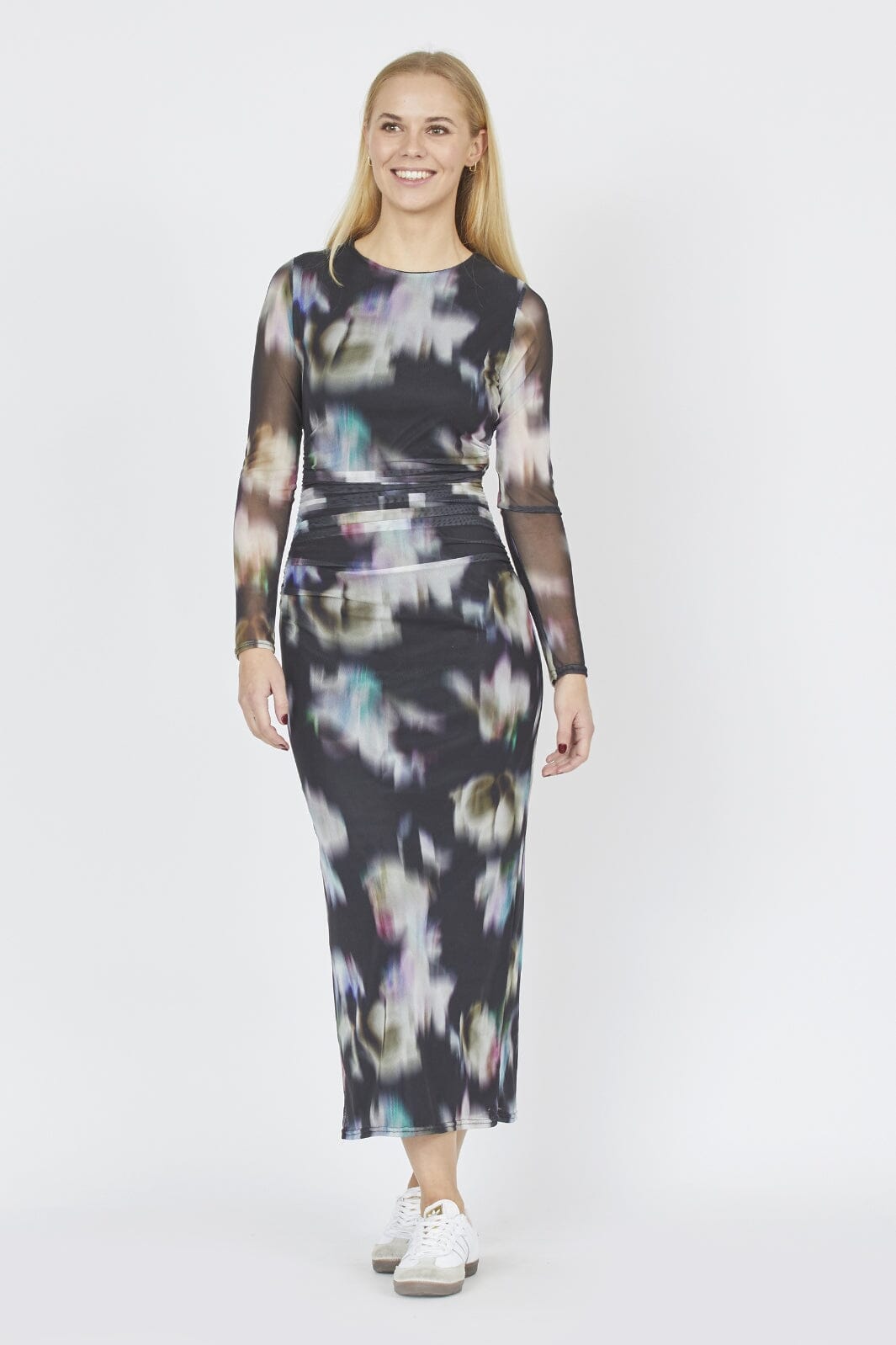 Pitkähihaista mekkoa Sisters Pointilta, jossa on digitaalinen painatus hillityissä väreissä ja kukkakuoseissa. Mekossa on rypytys yksityiskohtia vyötäröllä ja se ulottuu polven keskelle.