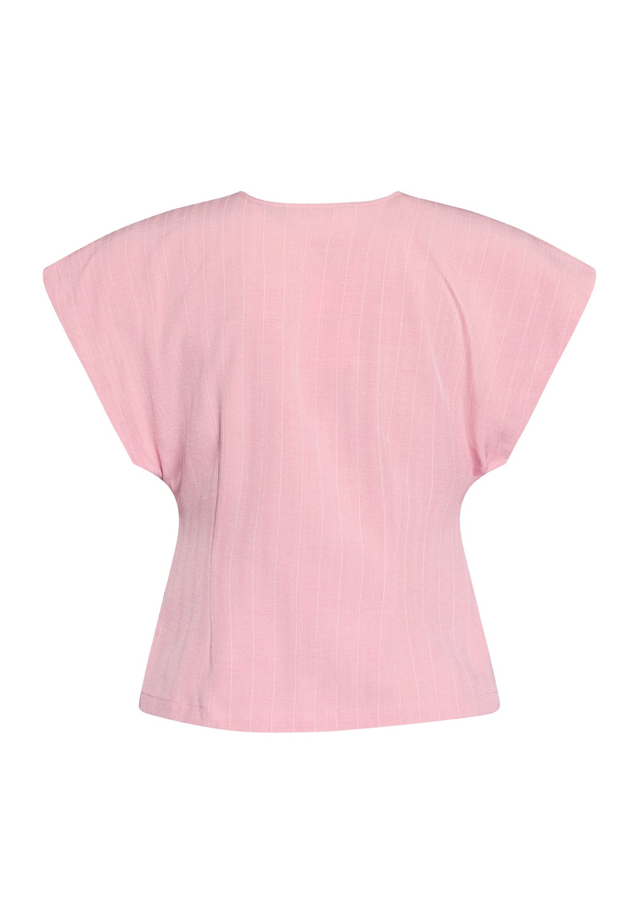 Vaaleanpunainen liivi Sisters Pointilta, jossa on liituraitakuvio. Liivi on valmistettu 90 % polyesteristä, 7 % viskoosista ja 3 % elastaanista, ja se sopii sekä muodollisiin tilaisuuksiin, arkeen että juhlaan.