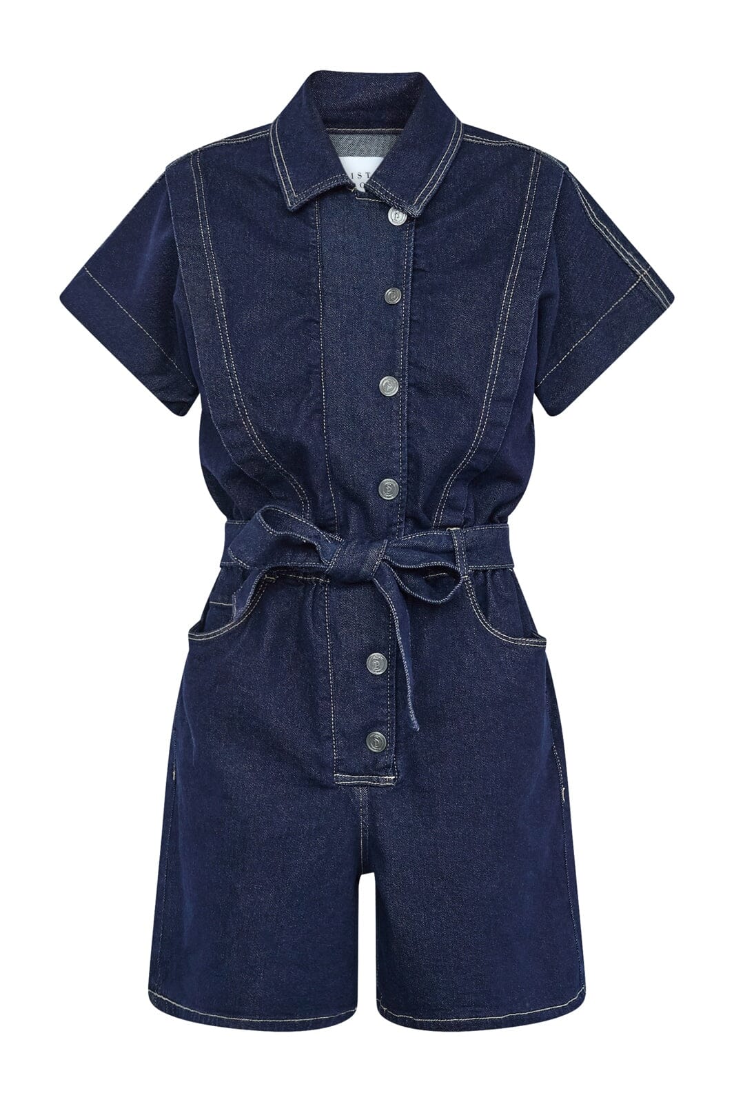 Haalariasu Sisters Pointilta tummansinisestä denimistä. Asussa on paitakaulus, lyhyet hihat ja pituus ulottuu reiden puoliväliin.
