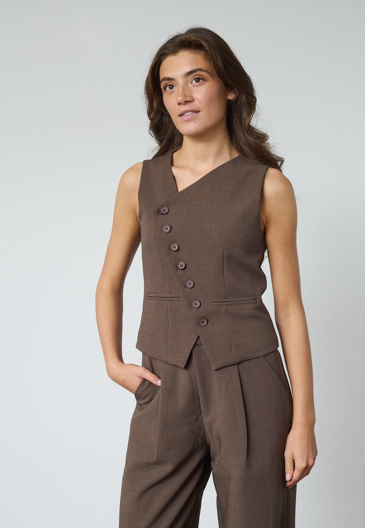 Ruskea liivi Sisters Pointilta, valmistettu polyesteristä ja elastaanista. Liivissä on V-pääntie ja slim fit -mitoitus, jossa on epäsymmetrinen nappikiinnitys.
