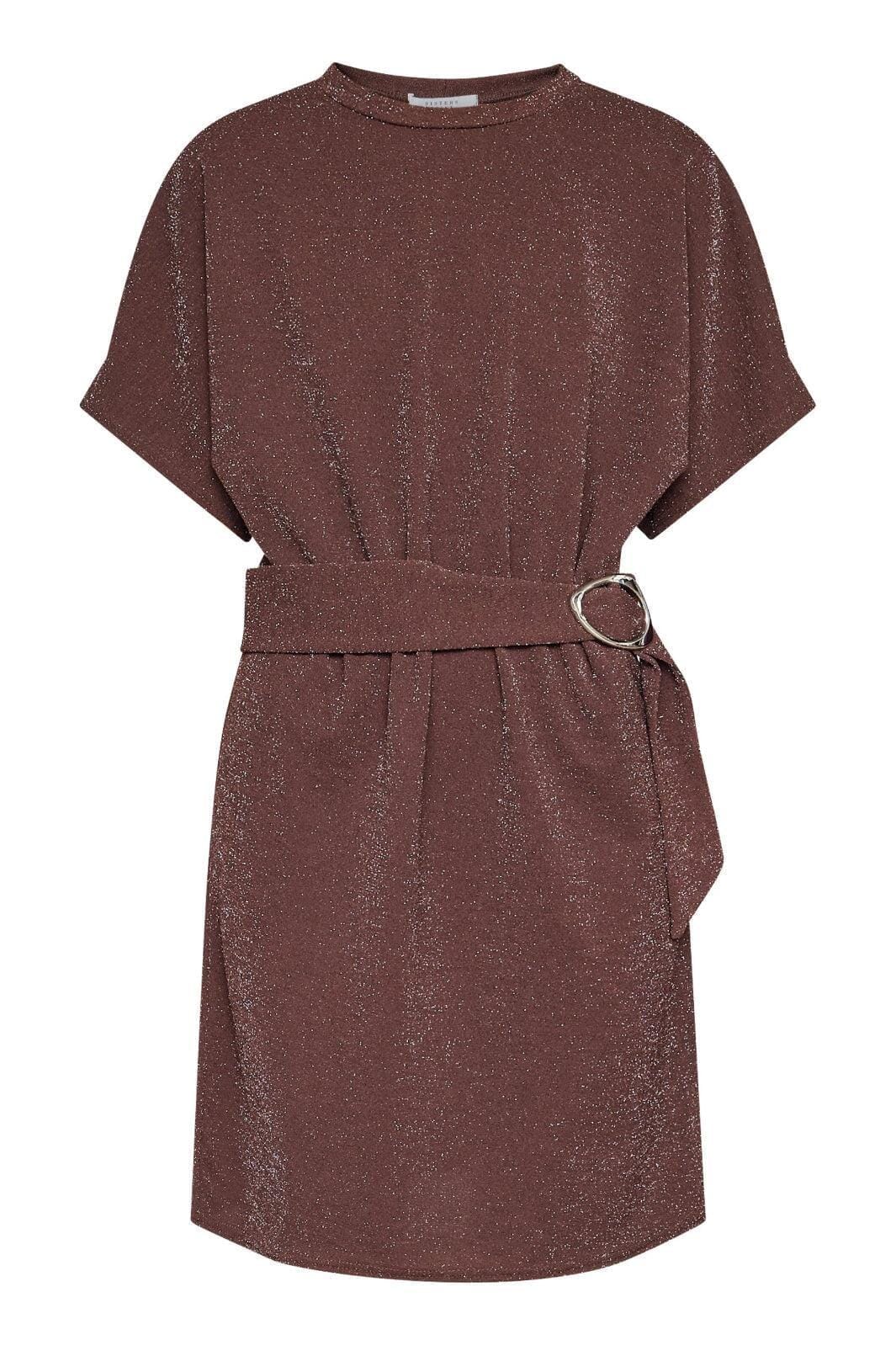 Ruskea mekko Sisters Pointilta, jossa on strukturoitu pinta ja kiiltävät hopeansävyiset langat, jotka antavat mekolle juhlavan ilmeen.