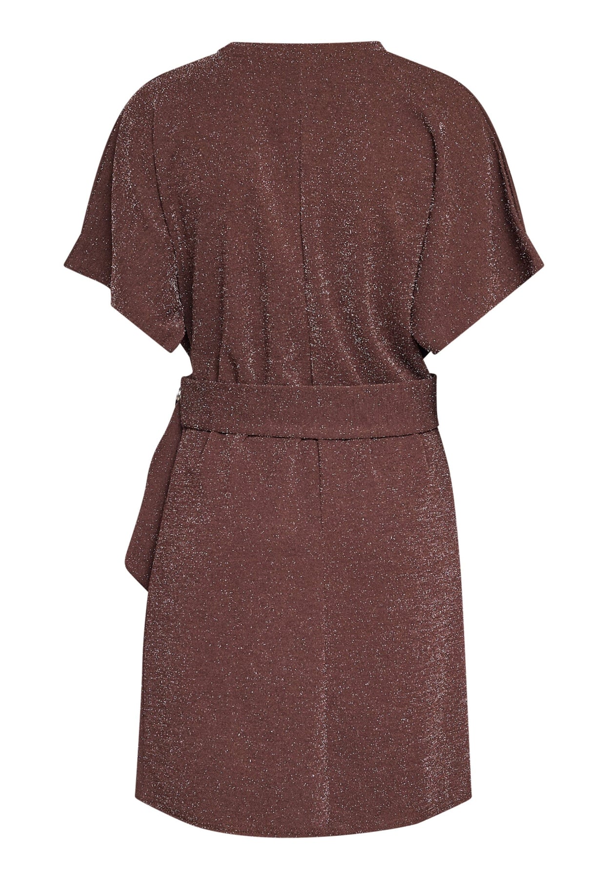 Ruskea mekko Sisters Pointilta, jossa on strukturoitu pinta ja kiiltävät hopeansävyiset langat, jotka antavat mekolle juhlavan ilmeen.