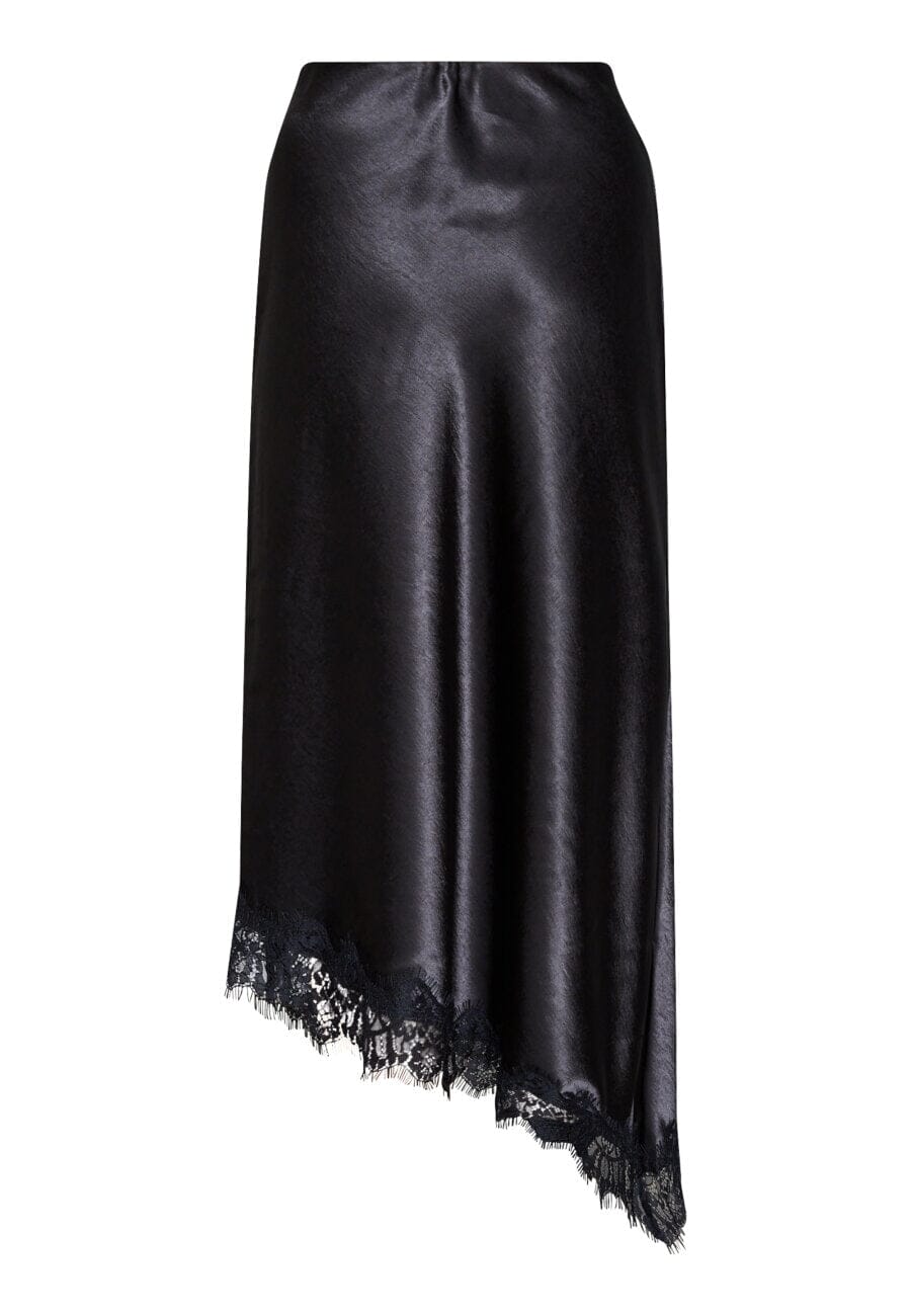 Musta Sisters Point -hame, jossa on kiiltävä satiinimainen ilme kudotusta polyesteristä. Hameessa on epäsymmetrinen leikkaus ja vinosti kulkeva pitsillä koristeltu helma.