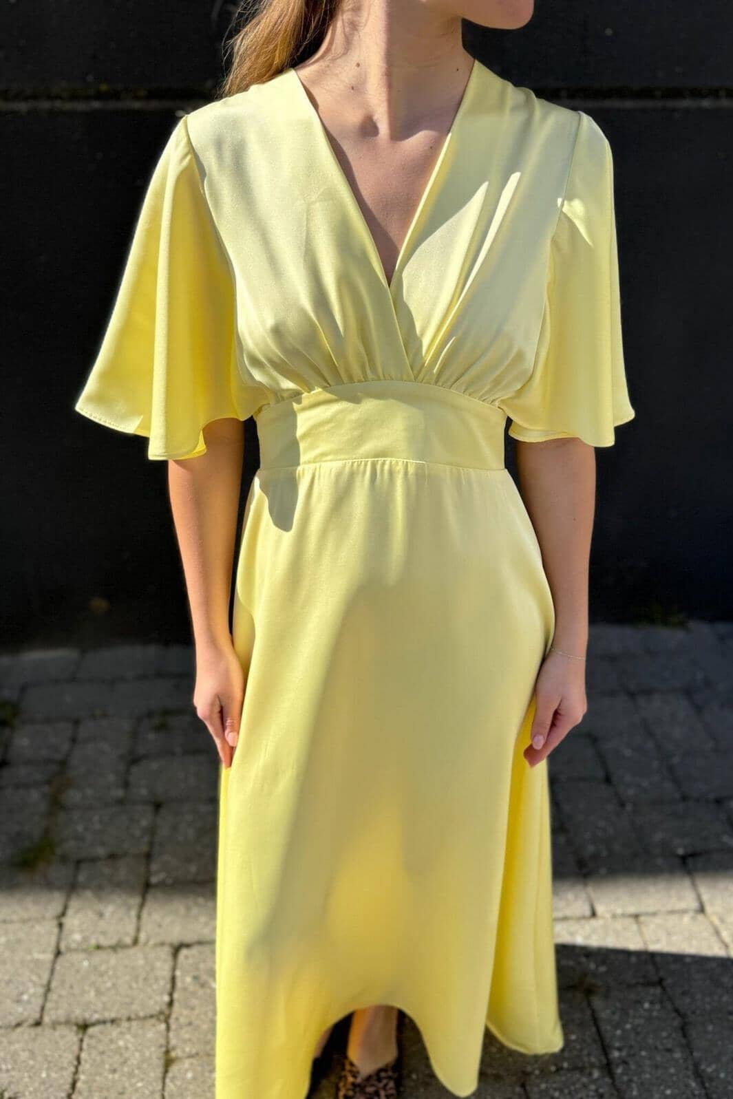 Vaaleankeltainen mekko Sisters Pointilta, jossa on smock-yksityiskohtia selässä. Mekossa on syvä V-pääntie ja löysät frillahihat. Smock-yksityiskohdat antavat hyvän istuvuuden vyötäröllä.
