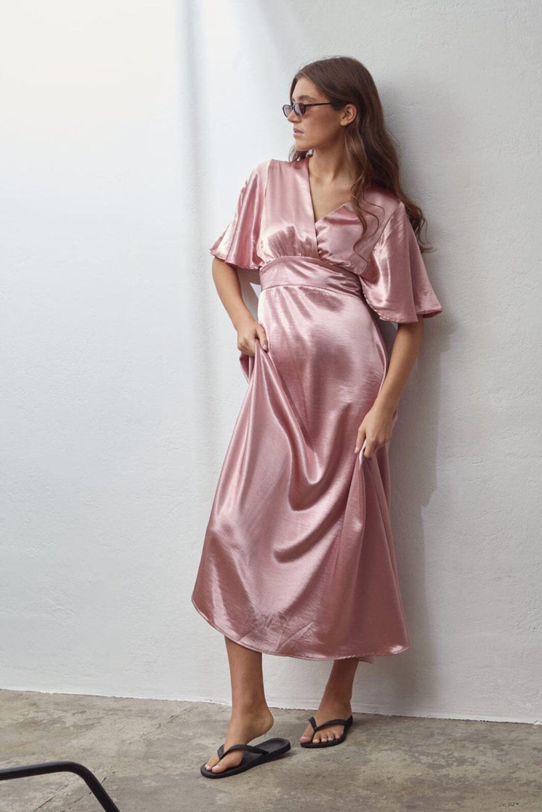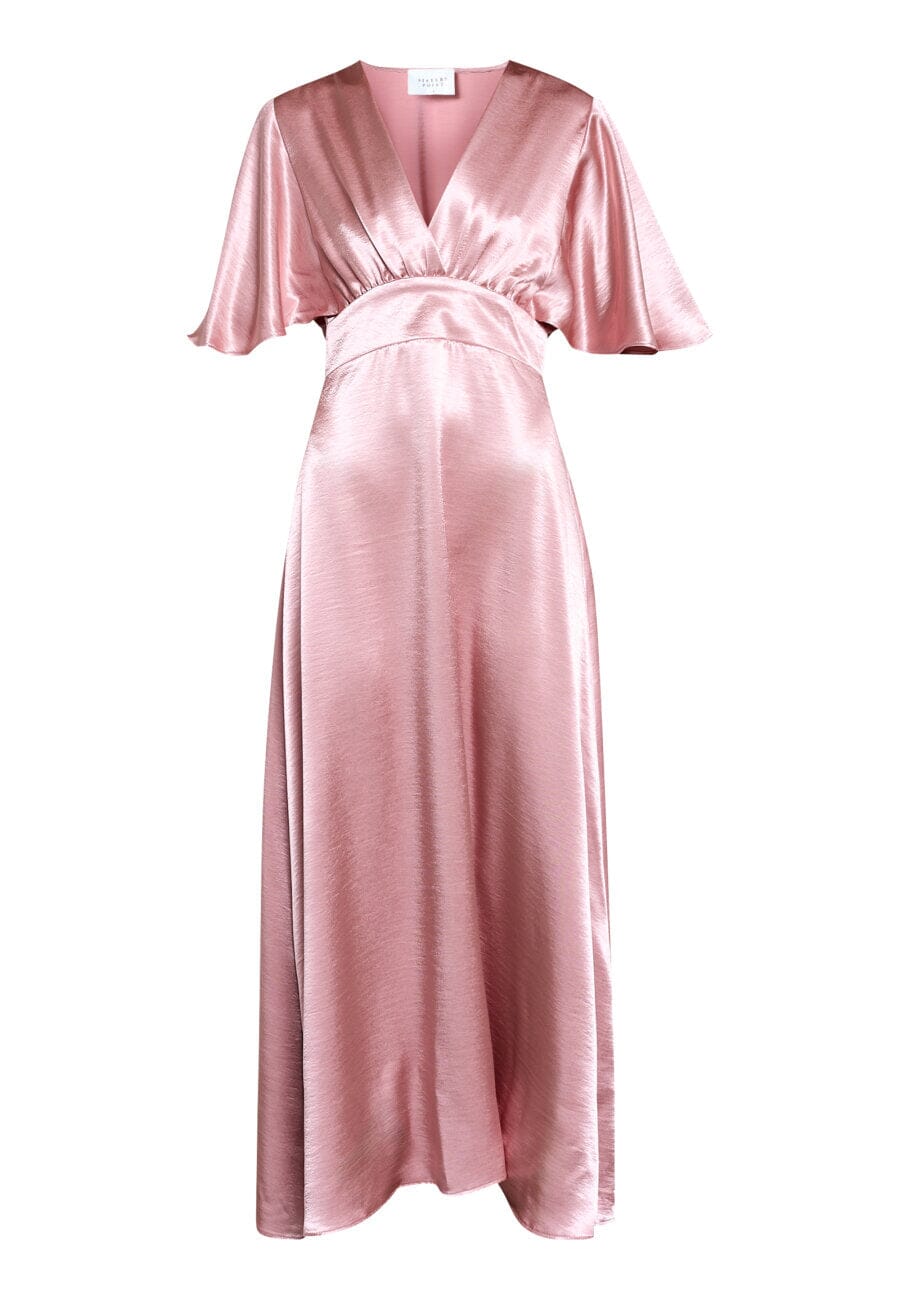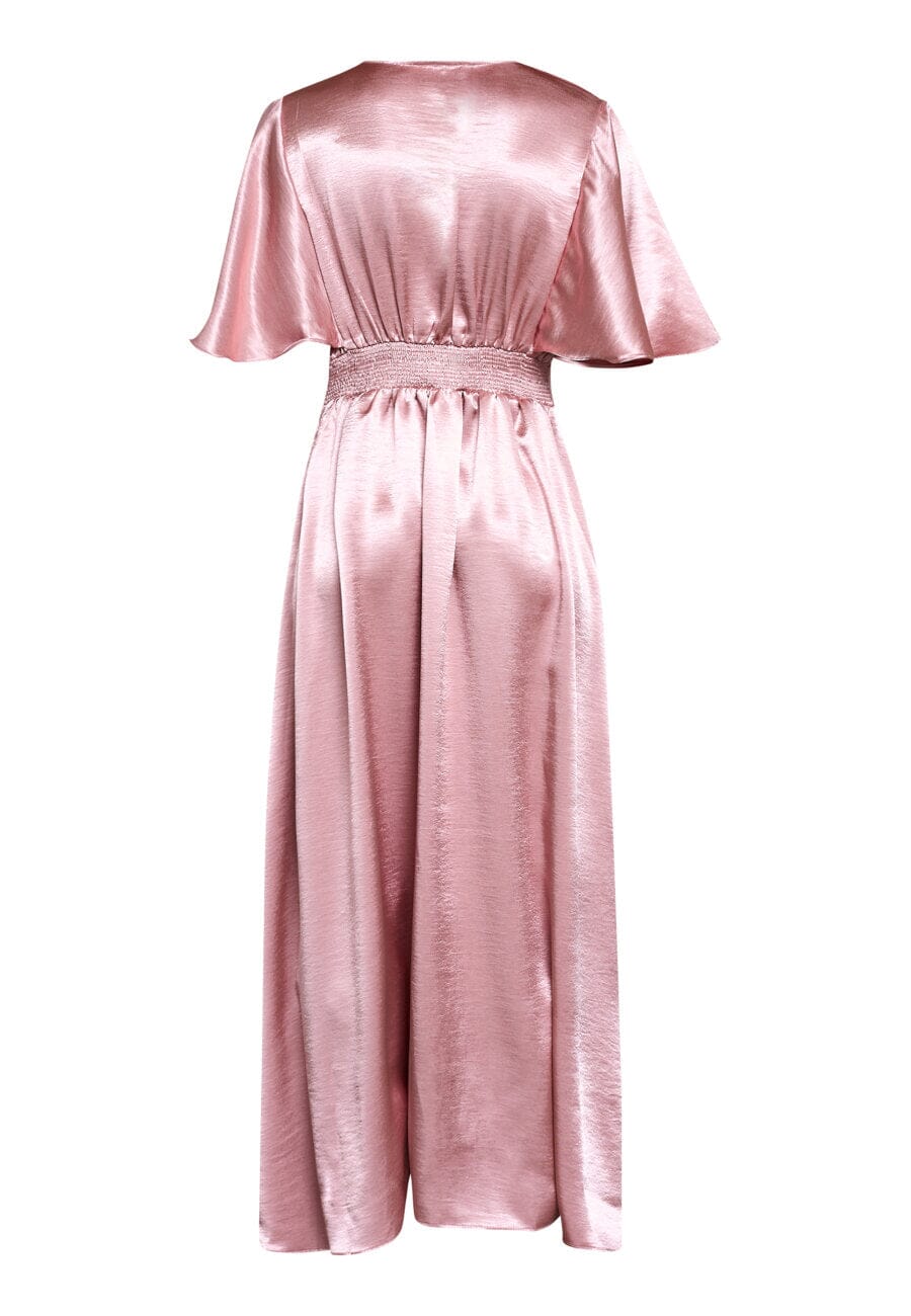 Pitkä mekko Sisters Pointilta, violetin värinen ja kiiltäväpintainen. Mekossa on V-pääntie kietaisuvaikutelmalla ja lyhyet lepakkohihat.