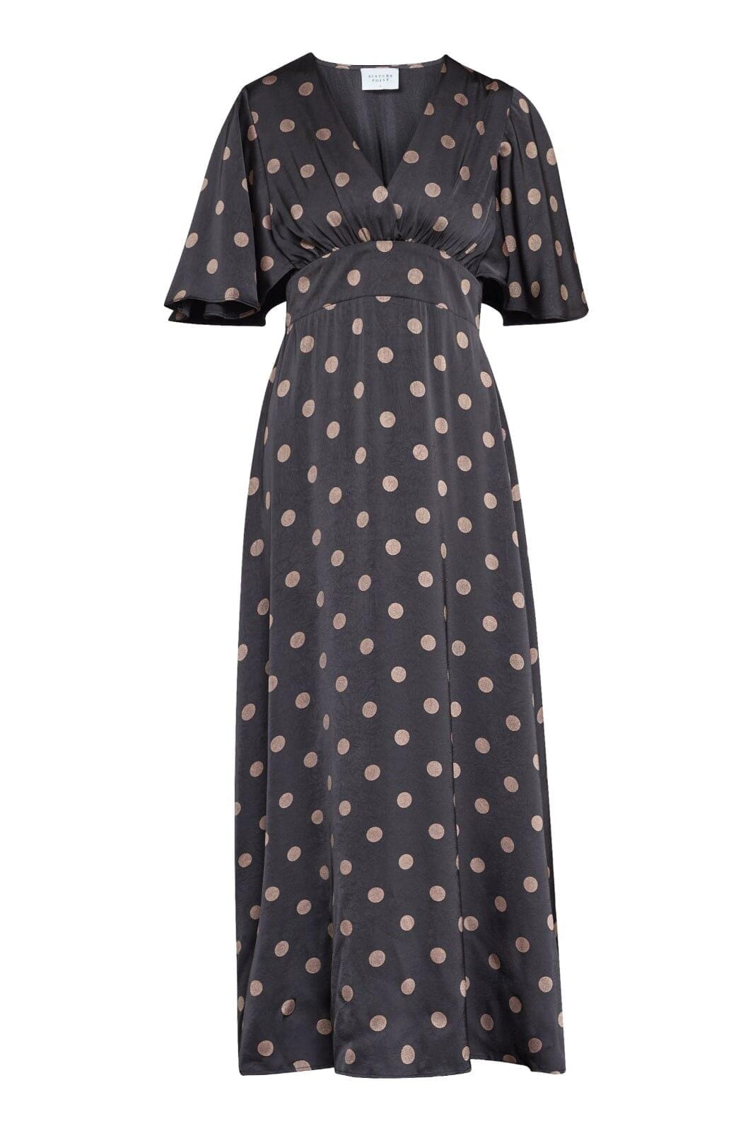Musta mekko Sisters Pointilta, jossa on pilkkukuvio vaaleissa sävyissä. Mekko sopii arkeen, juhlatilaisuuksiin ja häihin.