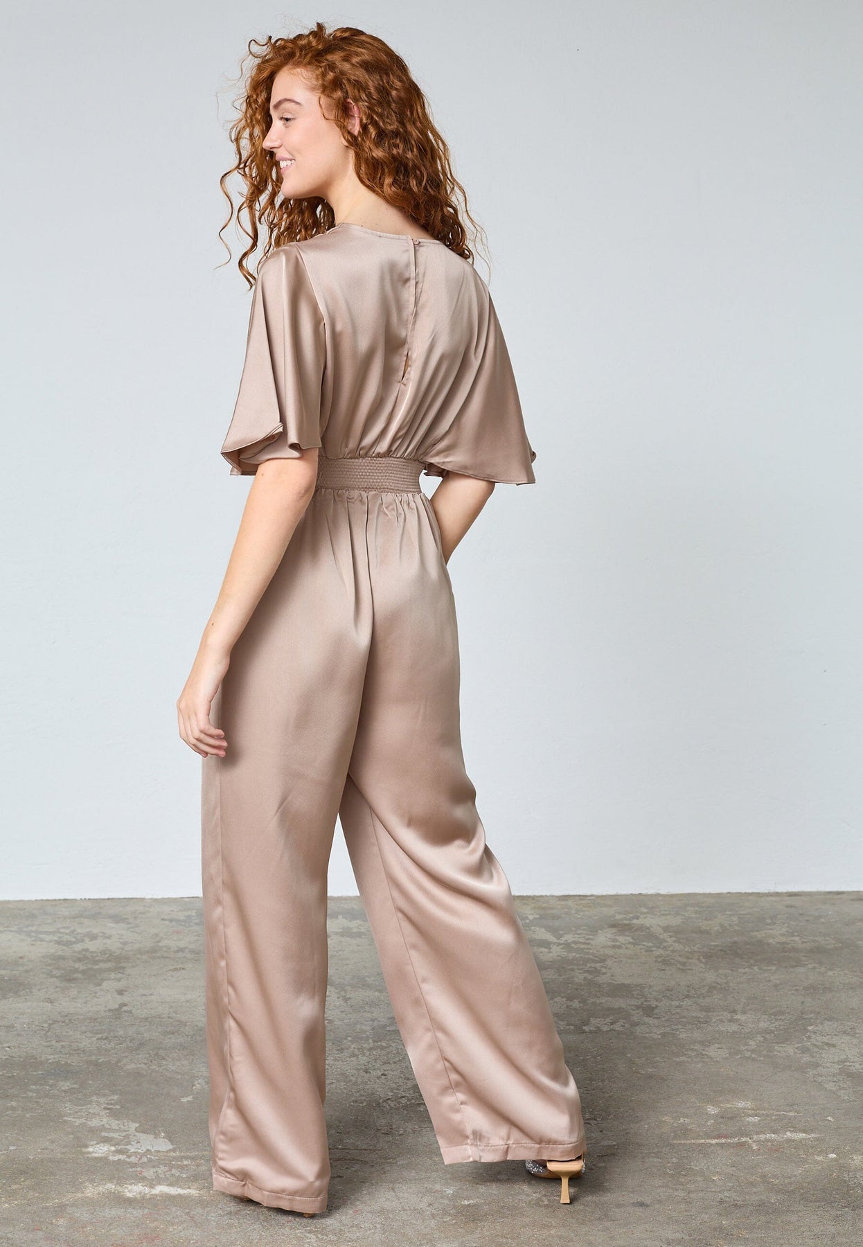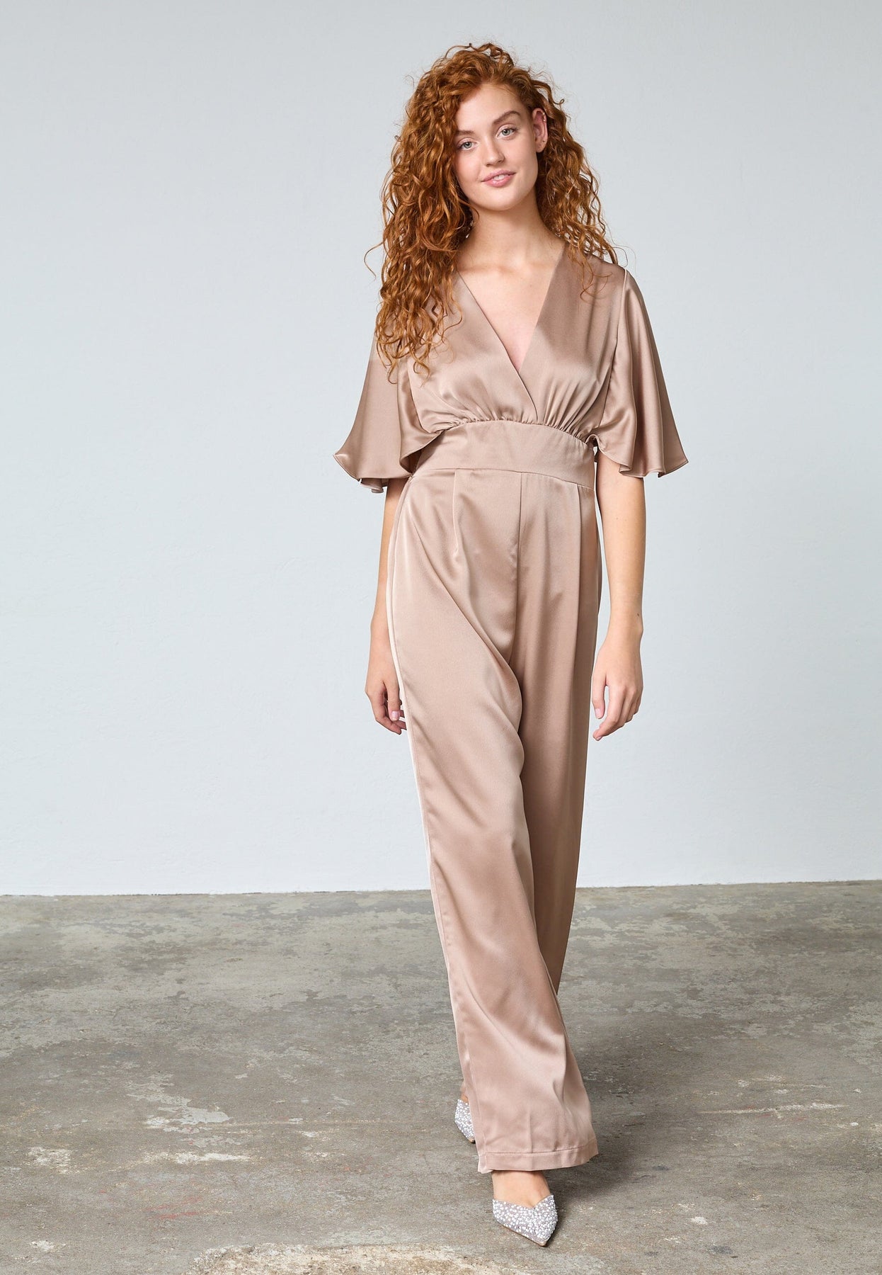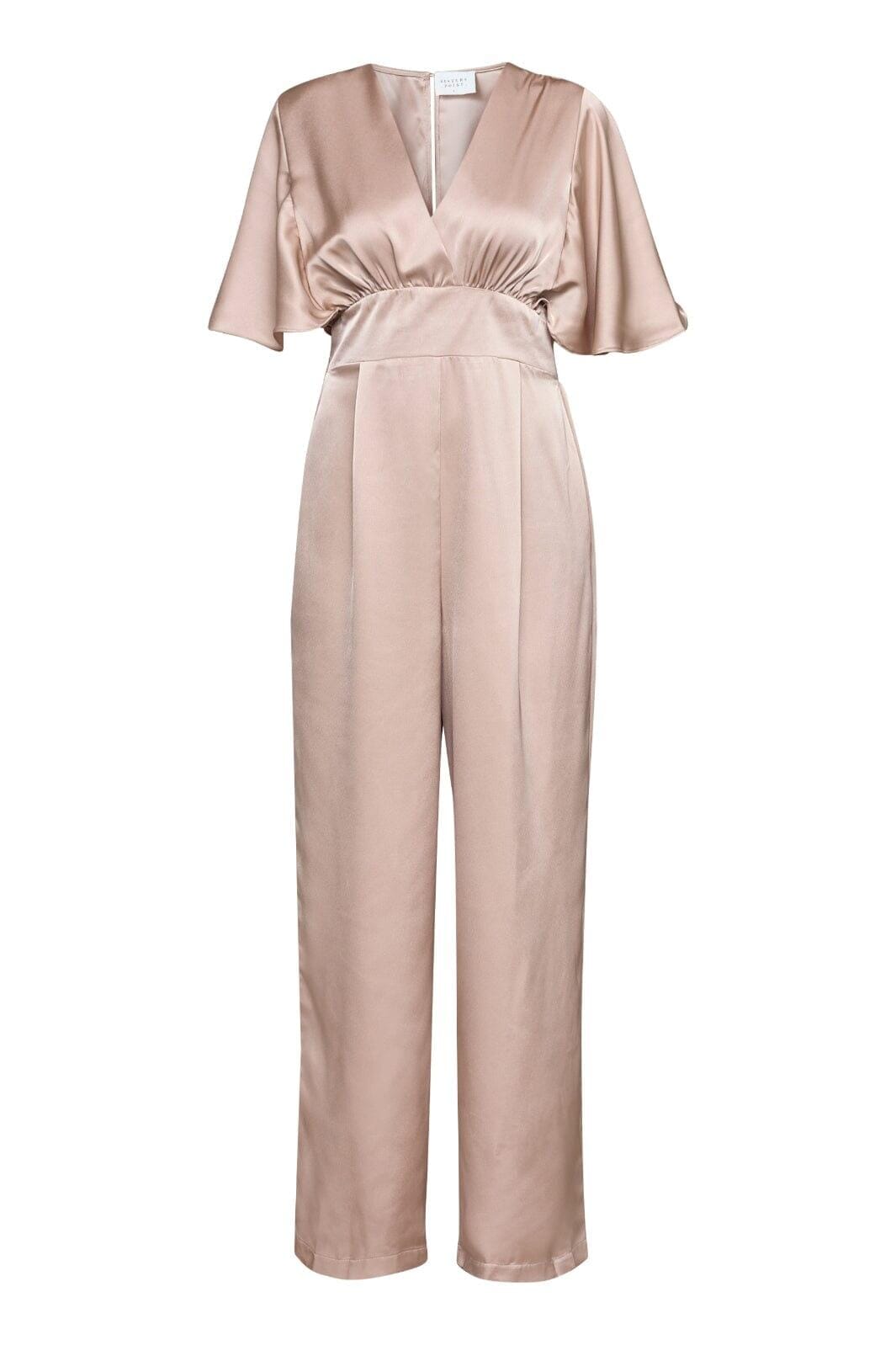 Jumpsuit Sisters Pointilta vaalean beigeissä samppanjansävyssä. Valmistettu 100 % polyesterisatiinista, jossa on sileä pinta ja leveät lahkeet.