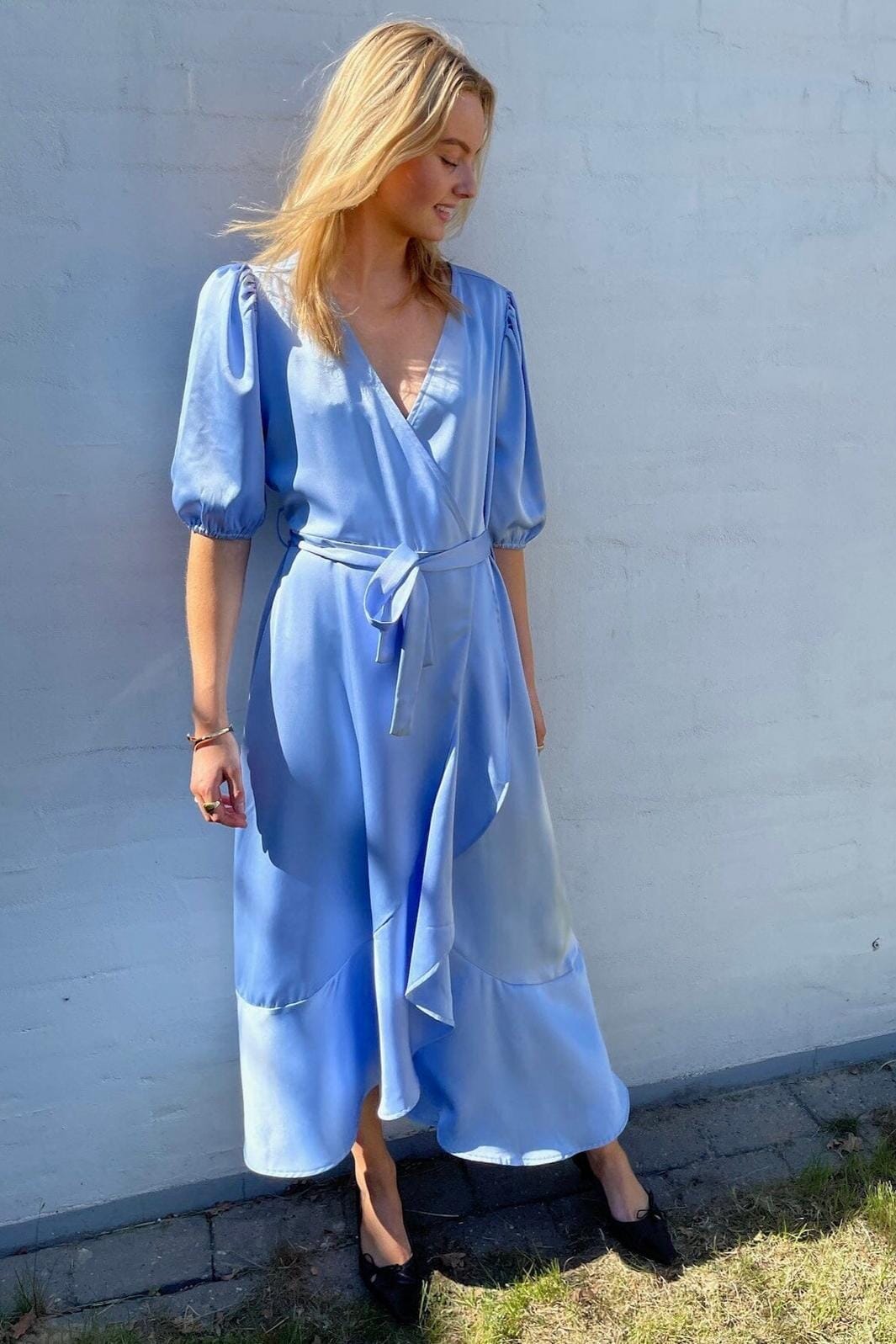 Vaaleansininen mekko Sisters Pointilta pehmeästä materiaalista. Mekossa on kietaisusuunnittelu vyöllä ja puffihihat, jotka antavat kauniin siluetin. Kerroksellinen helma lisää ylimääräisen kerroksen suunnitteluun.