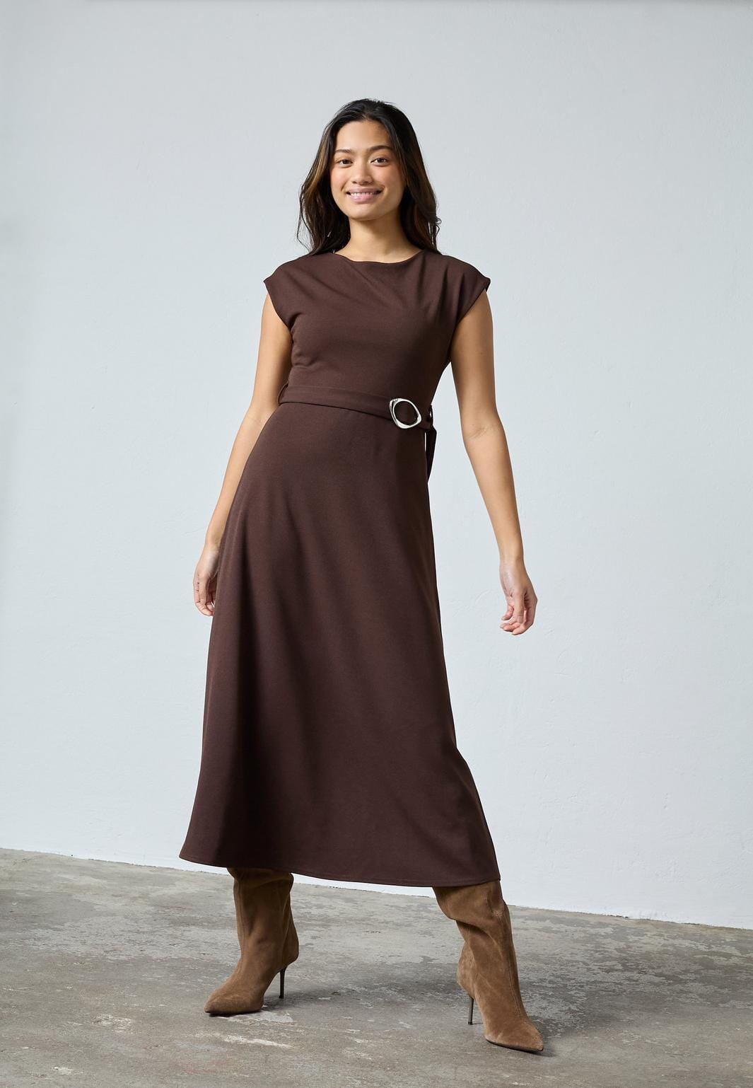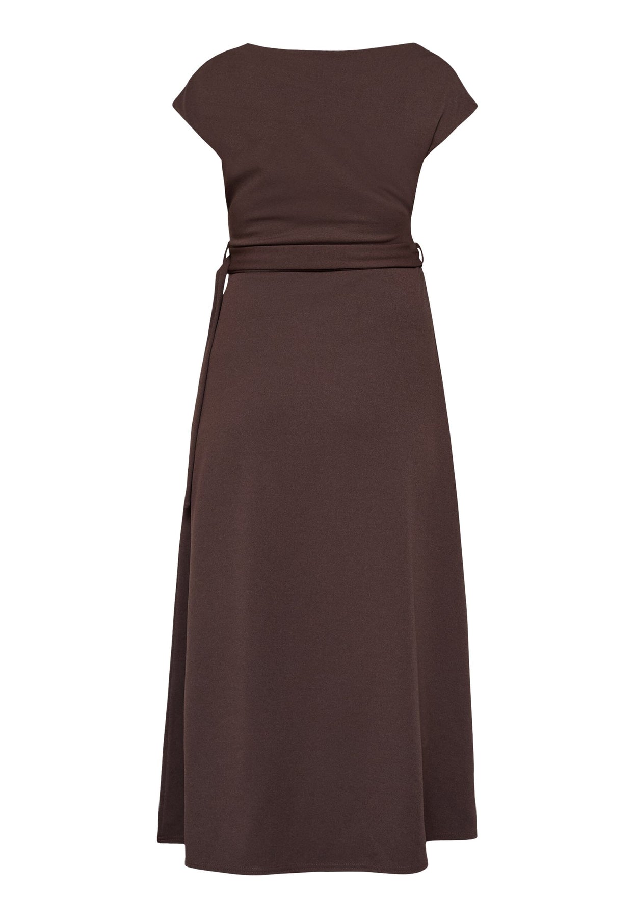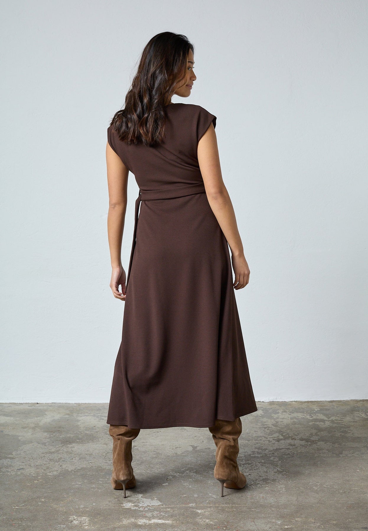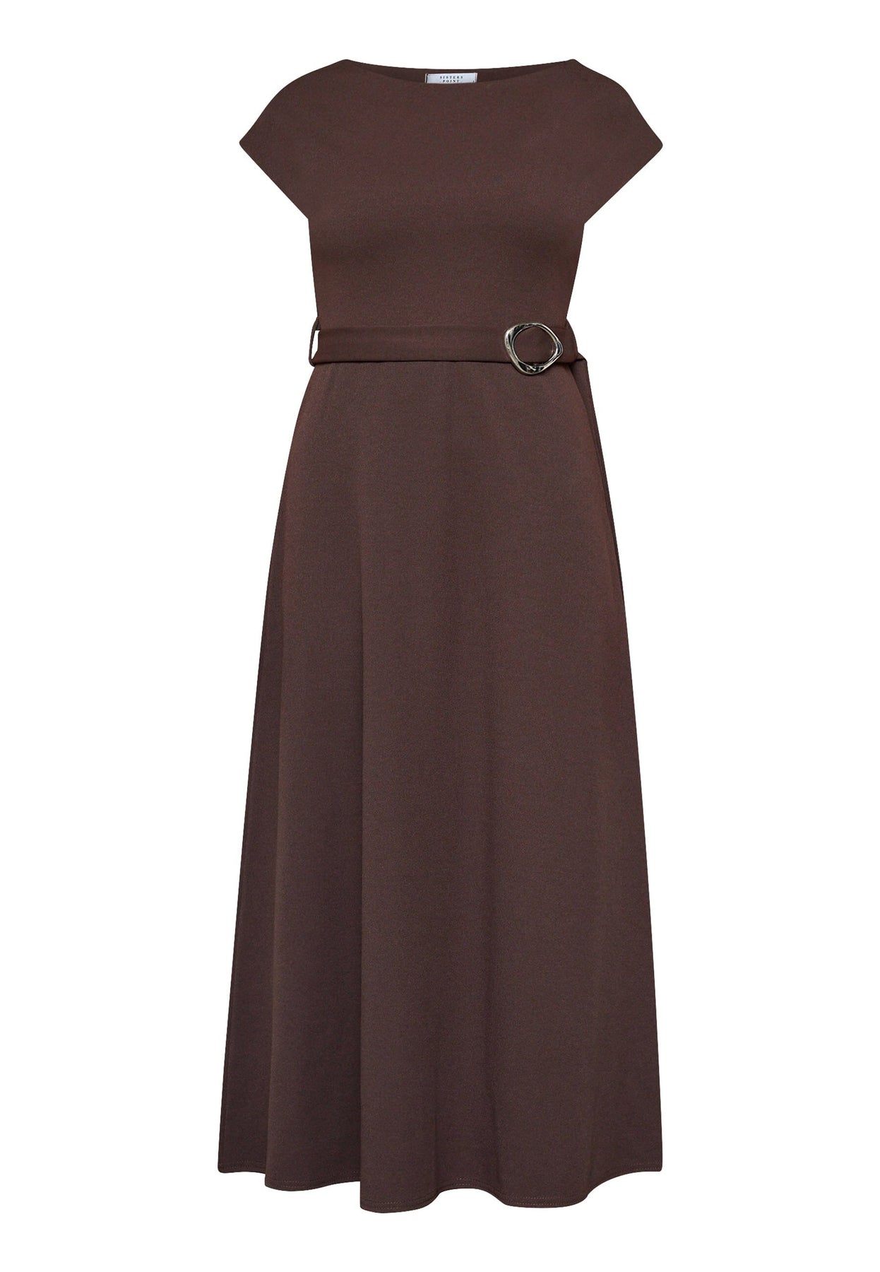 Polvipituinen mekko Sisters Pointilta syvän suklaanruskeassa värissä. Mekko on valmistettu sileästä polyesteristä, joka laskeutuu raskaasti ja luo jäsennellyn siluetin.