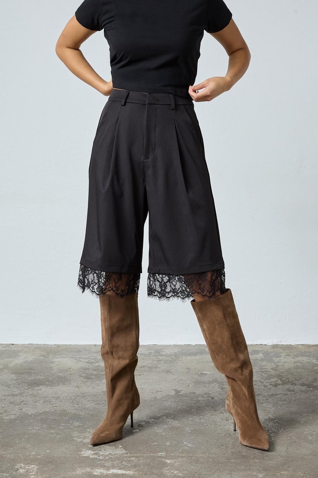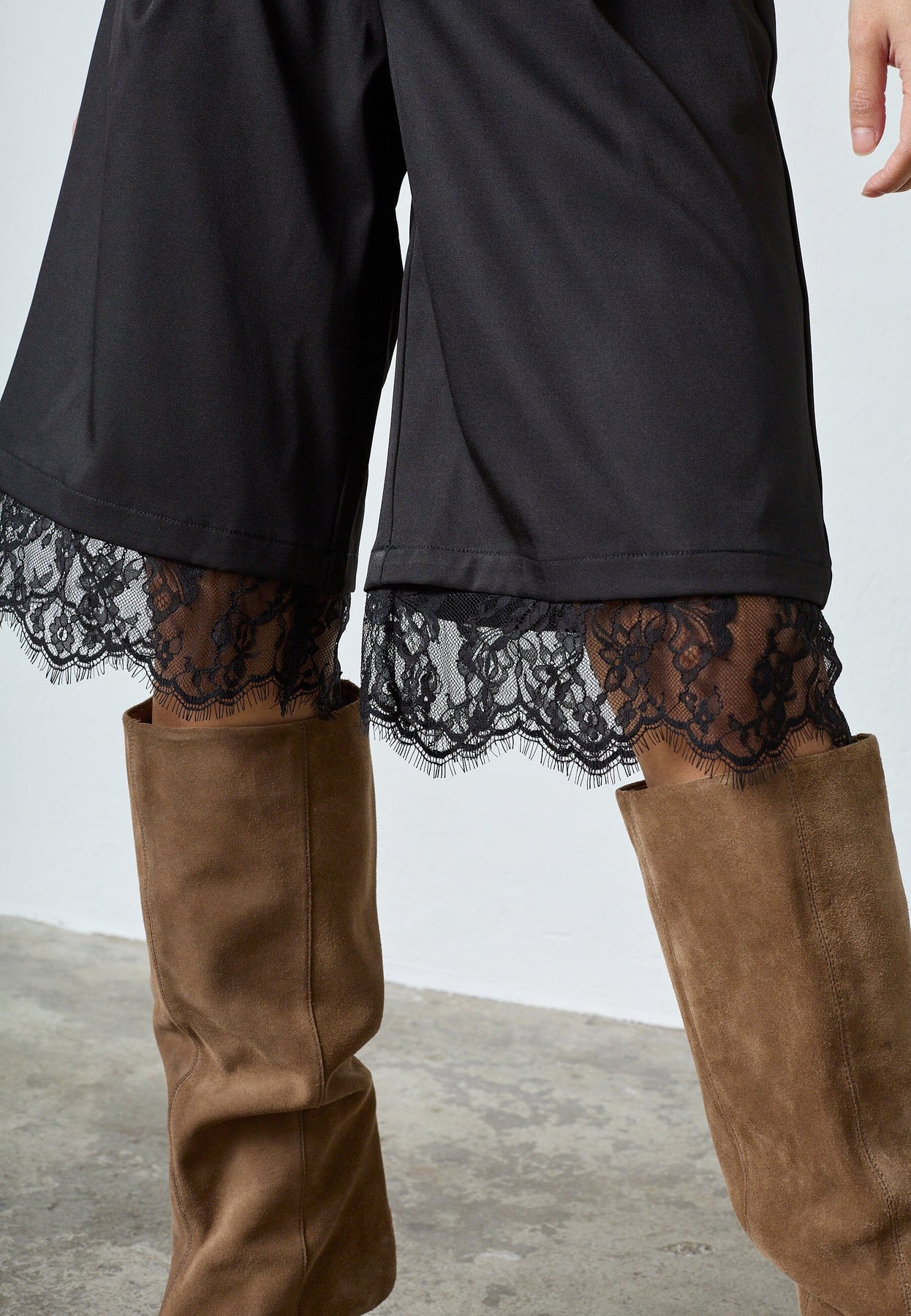 Mustat Sisters Point -shortsit, joissa on pitsiyksityiskohdat lahkeensuissa. Shortseissa on väljä istuvuus ja pituus ulottuu hieman polven yläpuolelle.
