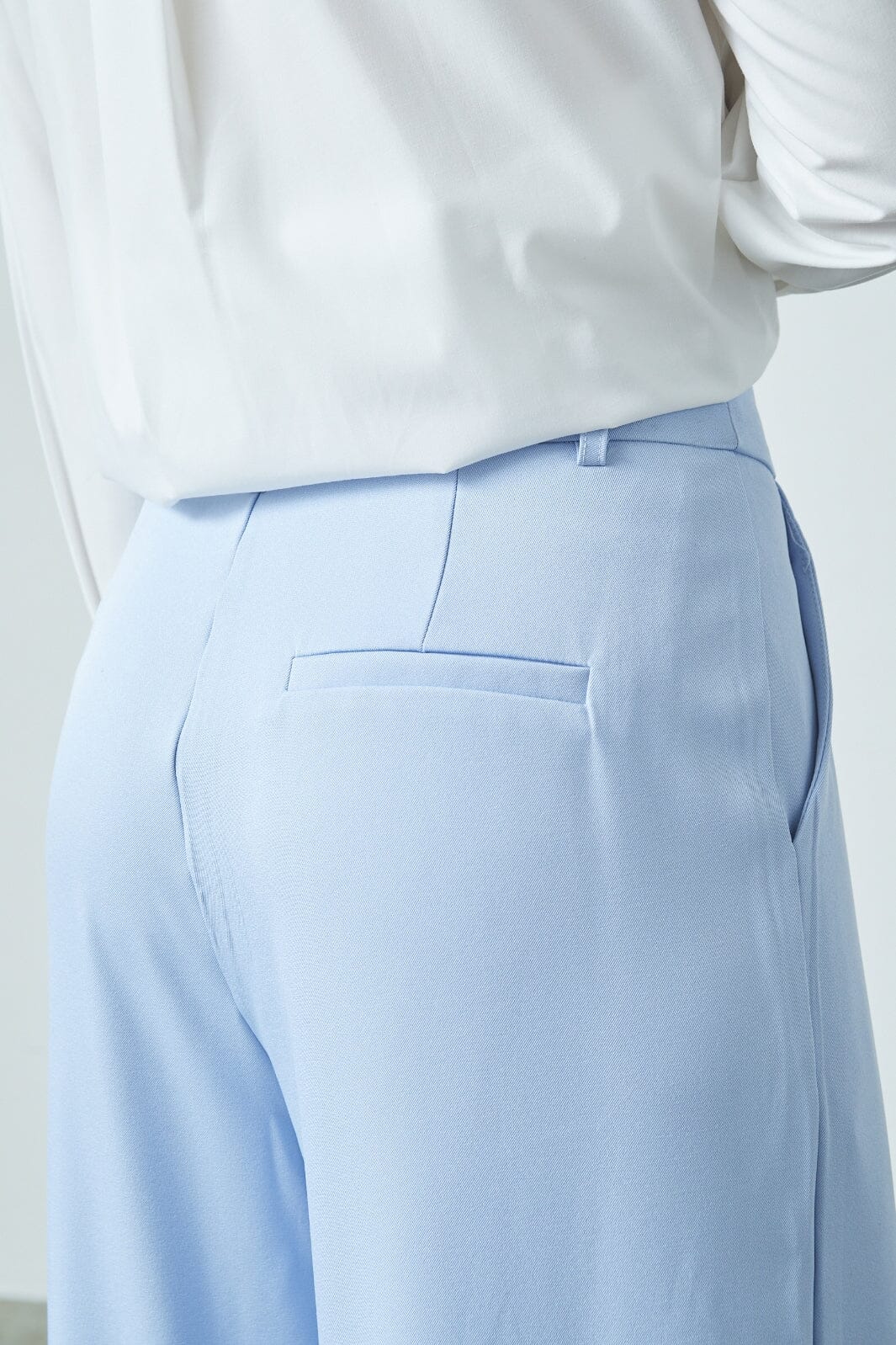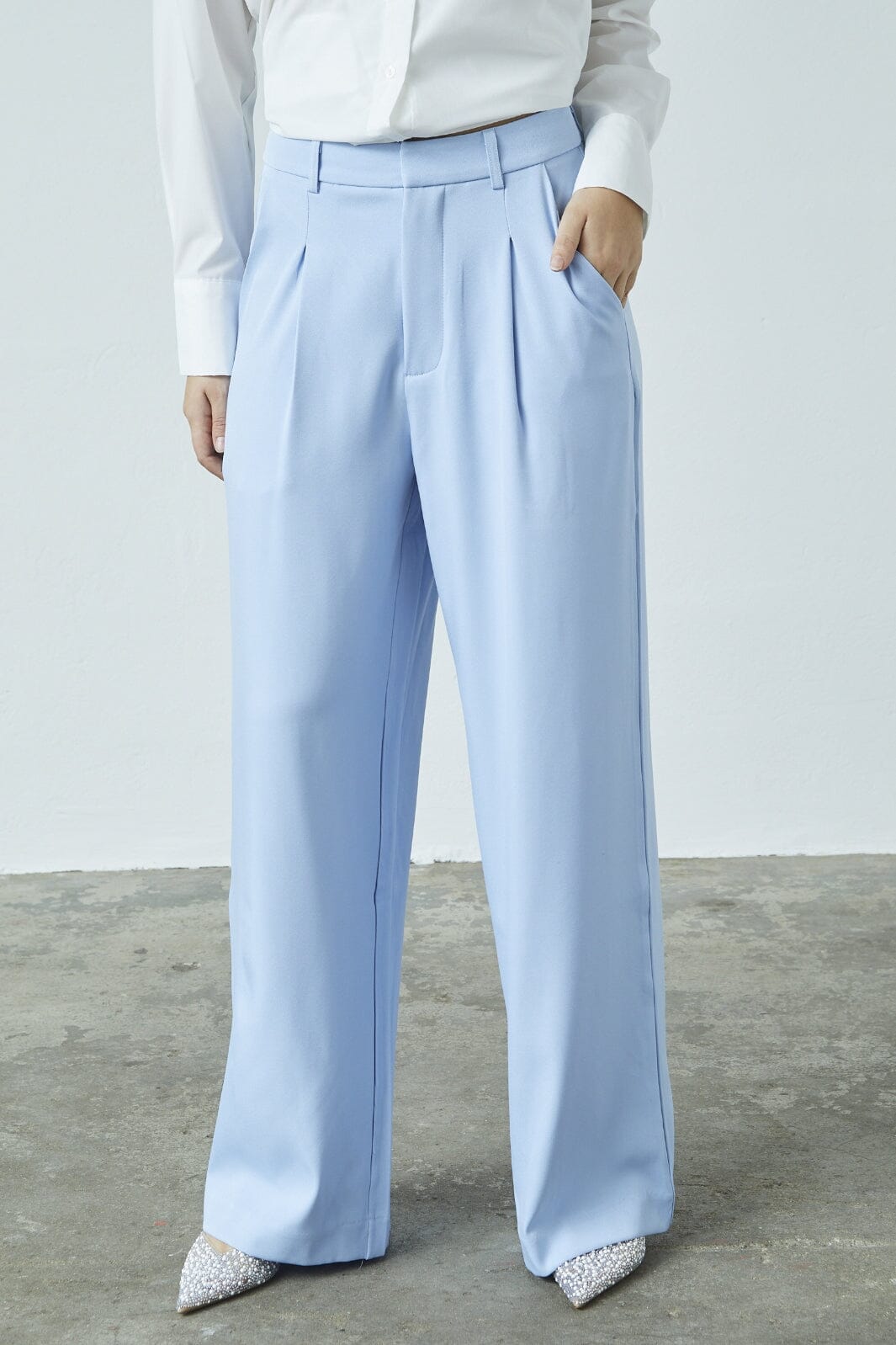 Vaaleansiniset housut Sisters Pointilta, joissa on leveät lahkeet ja pleatatut yksityiskohdat. Housuissa on normaali vyötärö ja vetoketjusuljenta.