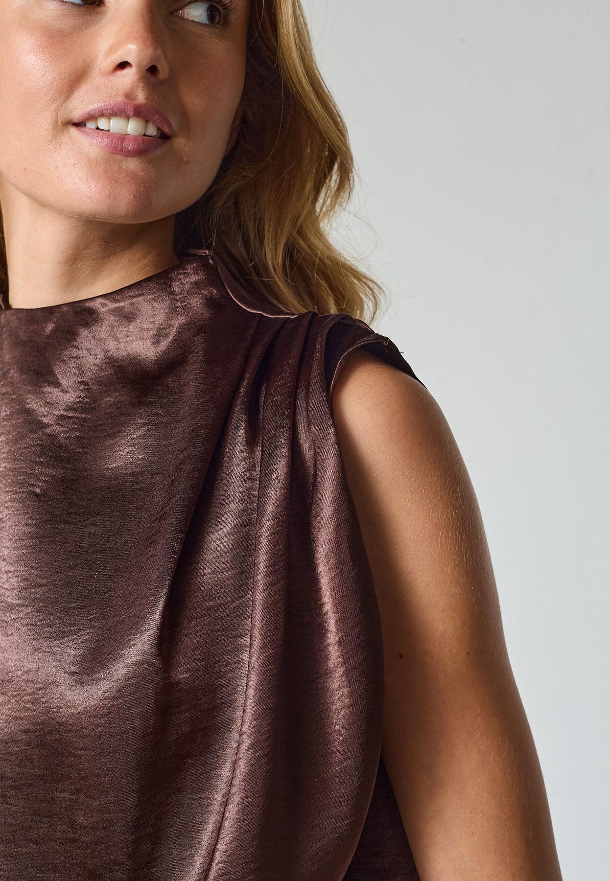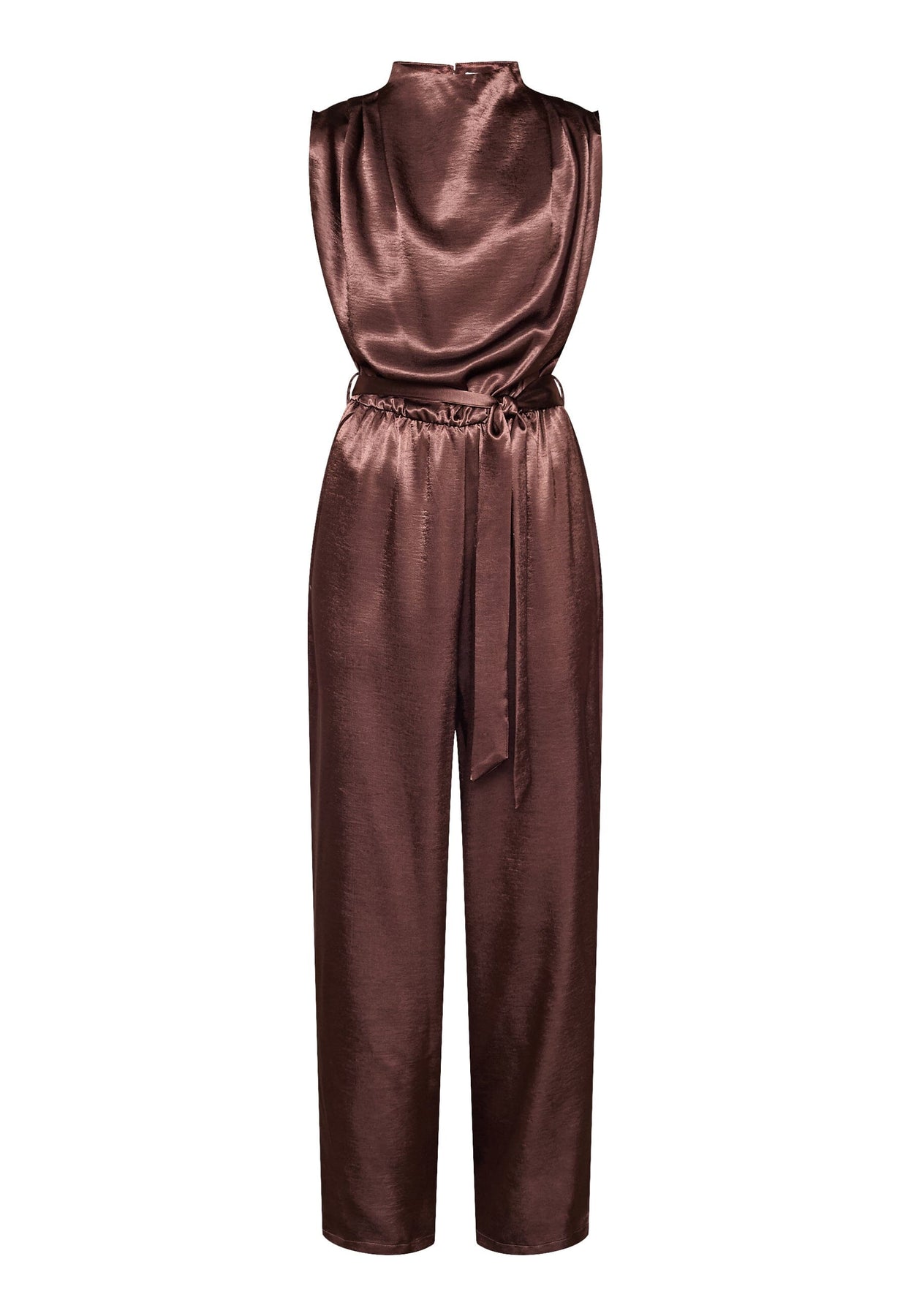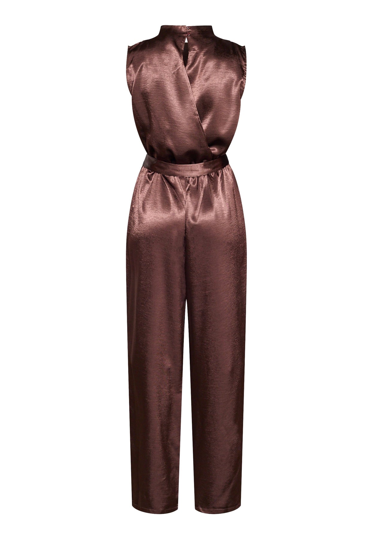 Ruskea jumpsuit Sisters Pointilta, valmistettu satiinista. Jumpsuit sopii muodollisiin ja juhlaviin tilaisuuksiin lattiaan ulottuvan pituutensa ja korkean pääntiensä ansiosta.