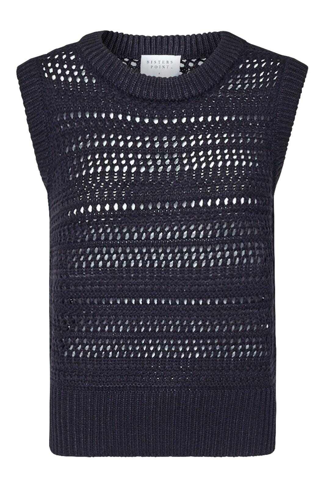 Musta hihaton liivi Sisters Pointilta, jossa on rei’itetty kuvio neulotussa akryyli- ja puuvillamateriaalissa. Liivissä on pyöreä pääntie ja se sopii jokapäiväiseen käyttöön.