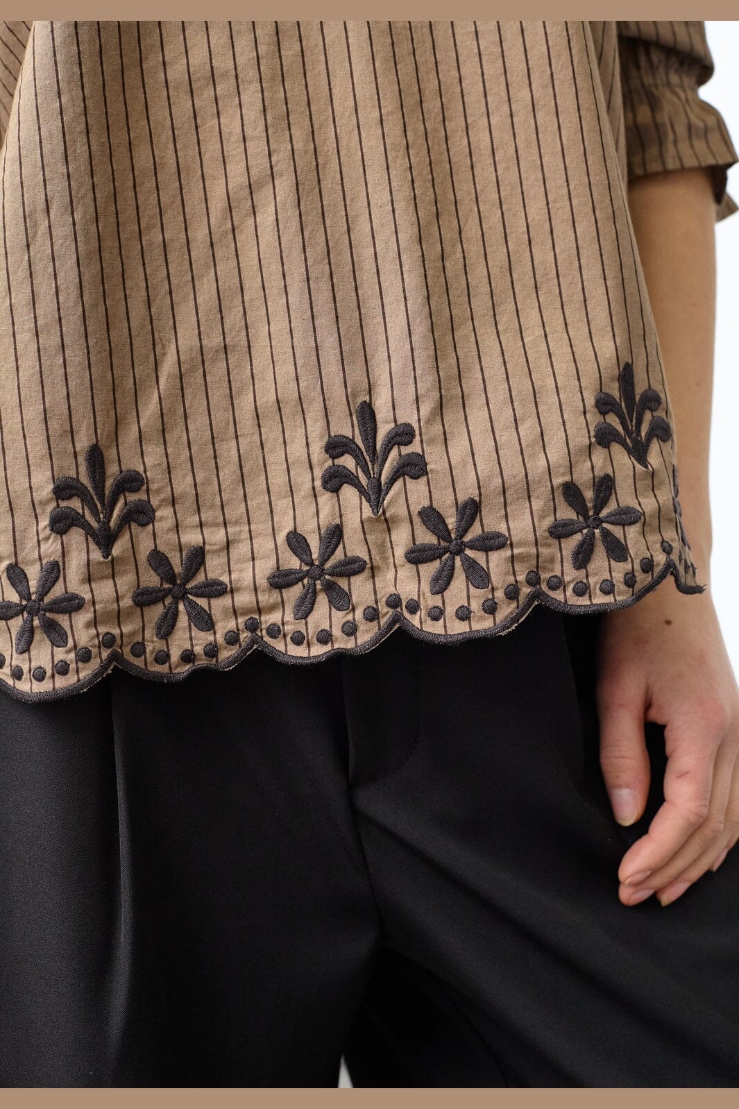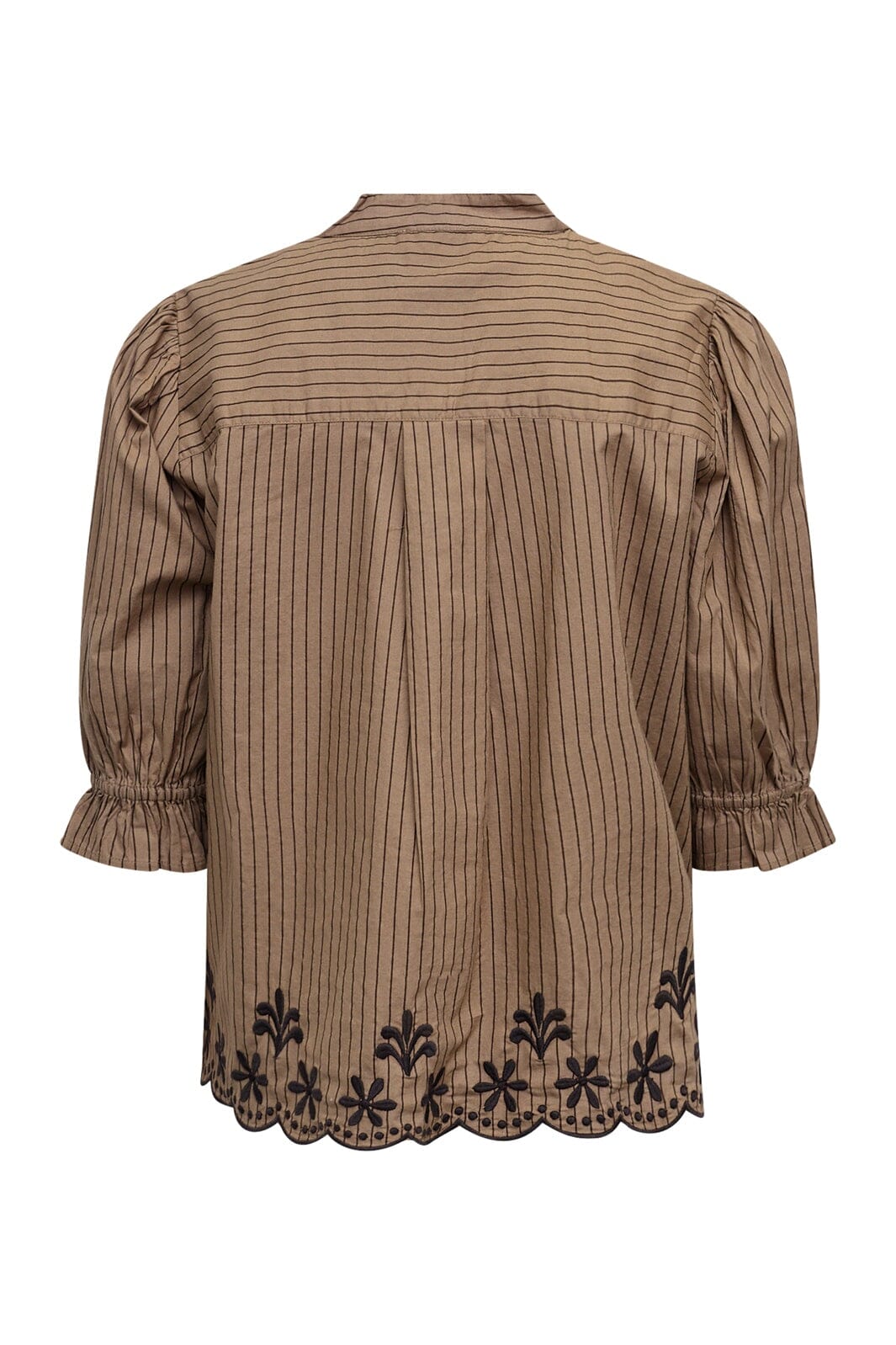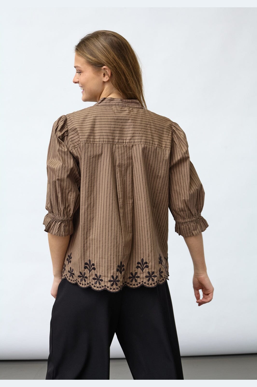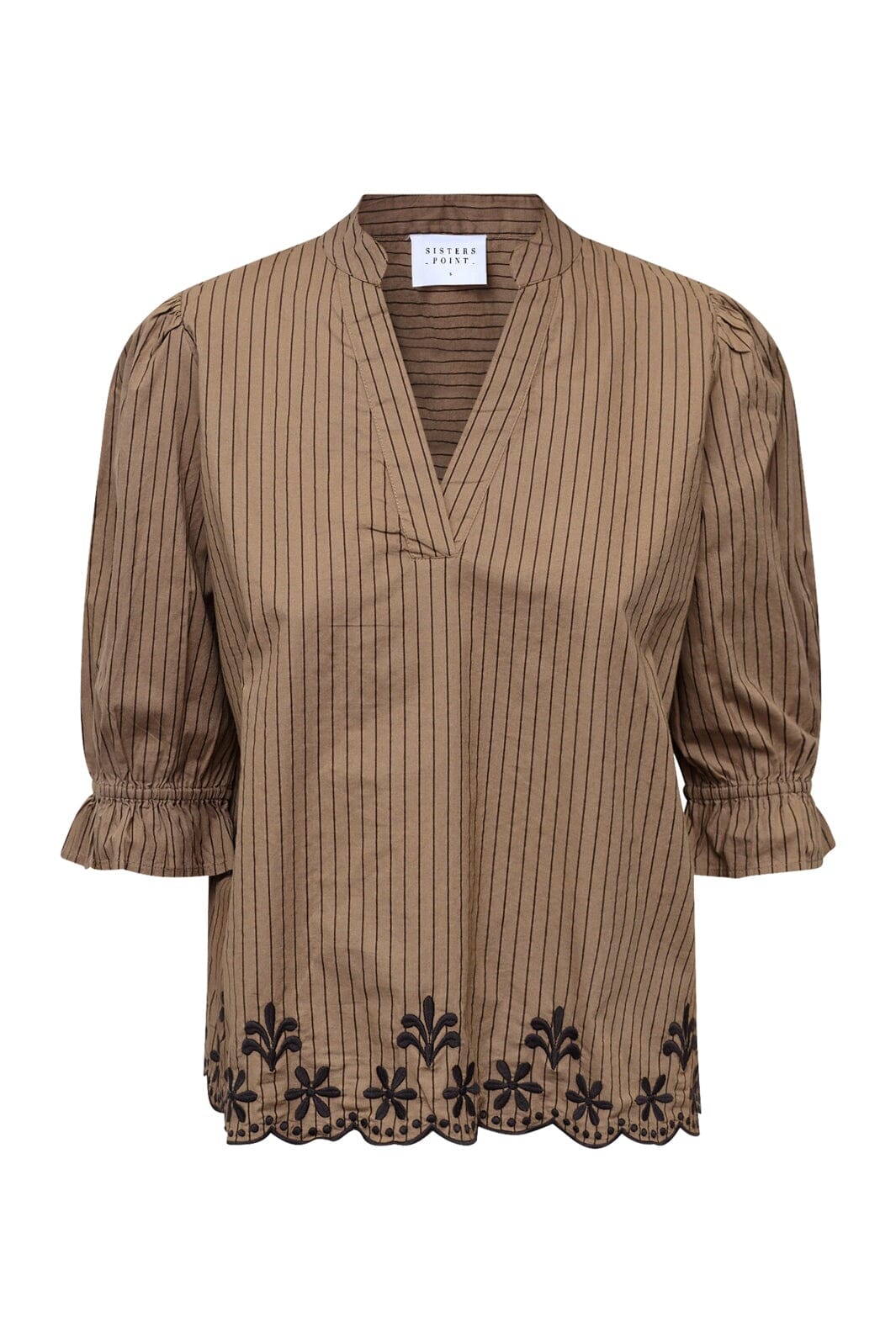 Sisters Point -pusero, jossa on ruskeat pystysuuntaiset raidat ja väljä istuvuus. Puserossa on 3/4-hihat ja V-pääntie, jossa on pieni kaulus.
