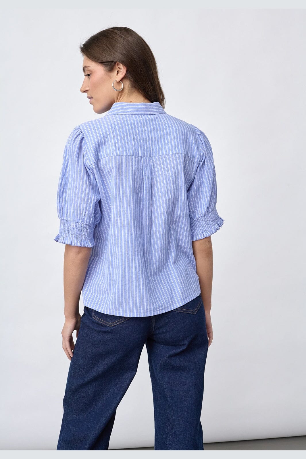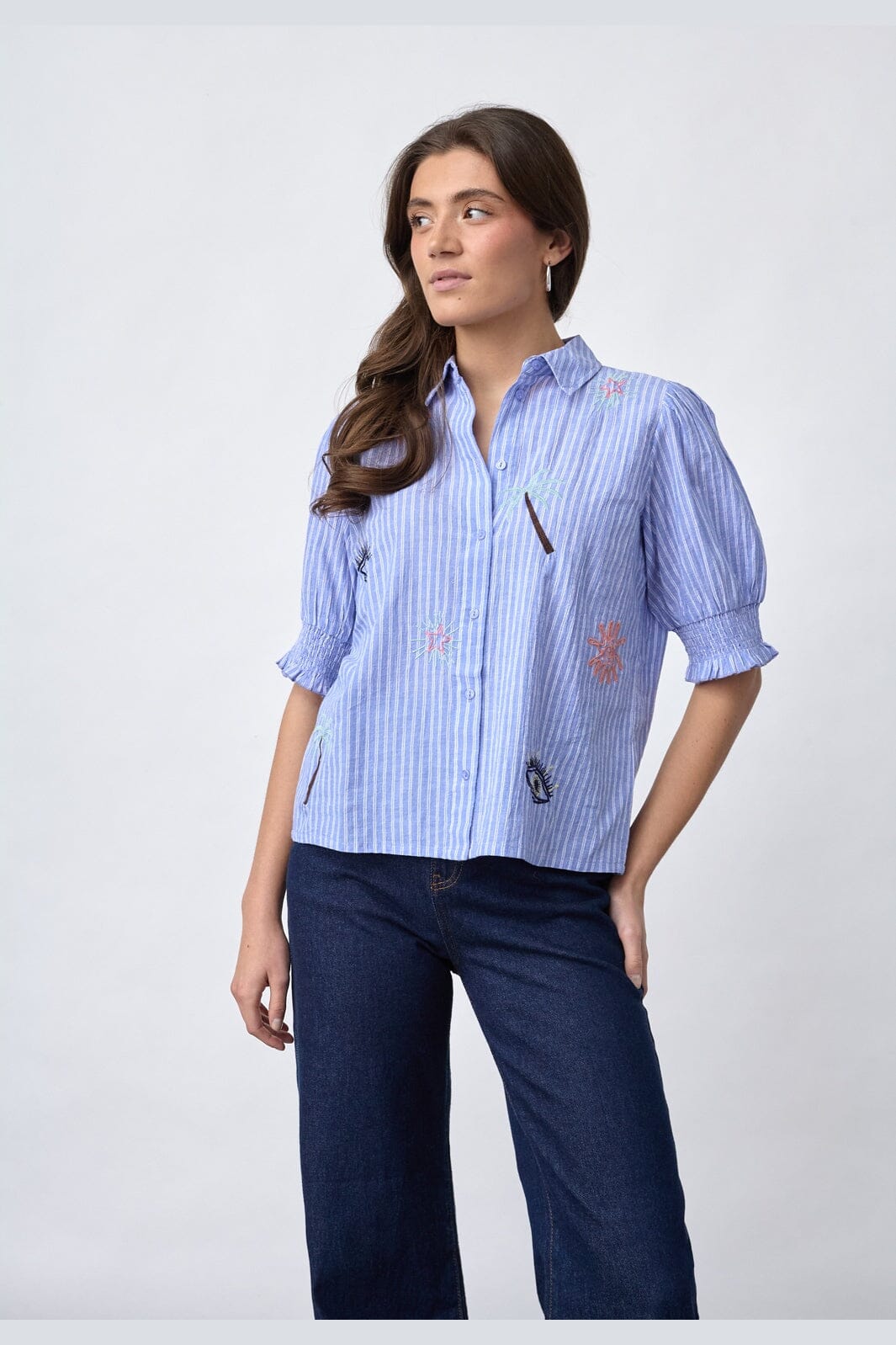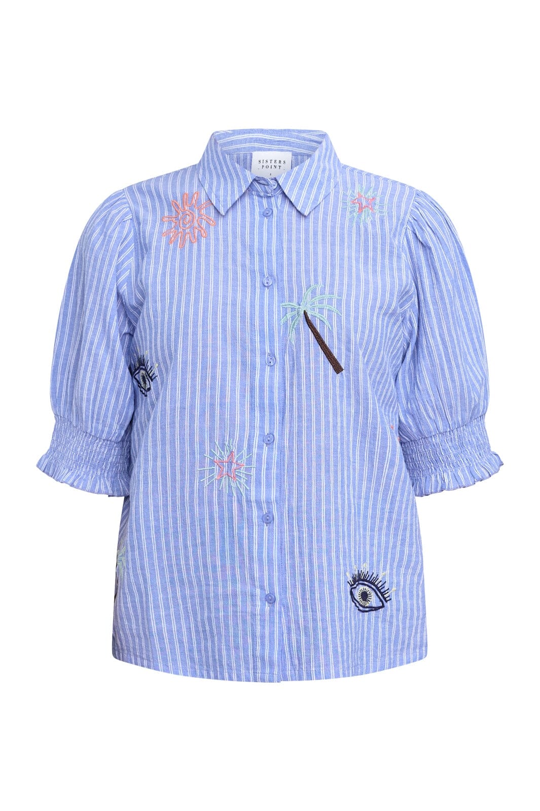 Raidallinen paita Sisters Pointilta sinisillä ja valkoisilla raidoilla. Siinä on edessä kirjailtuja palmu- ja aurinkokuvioita.