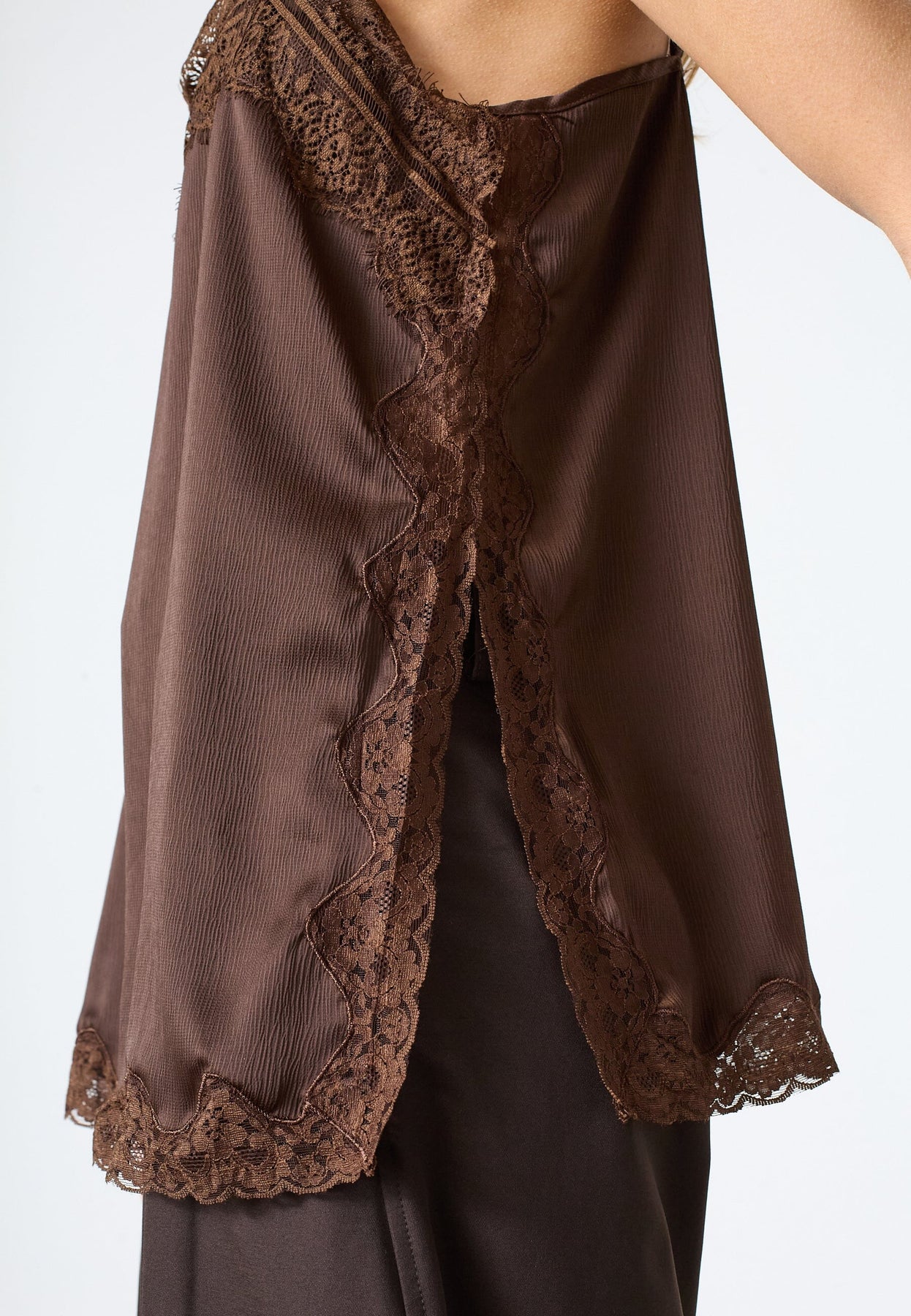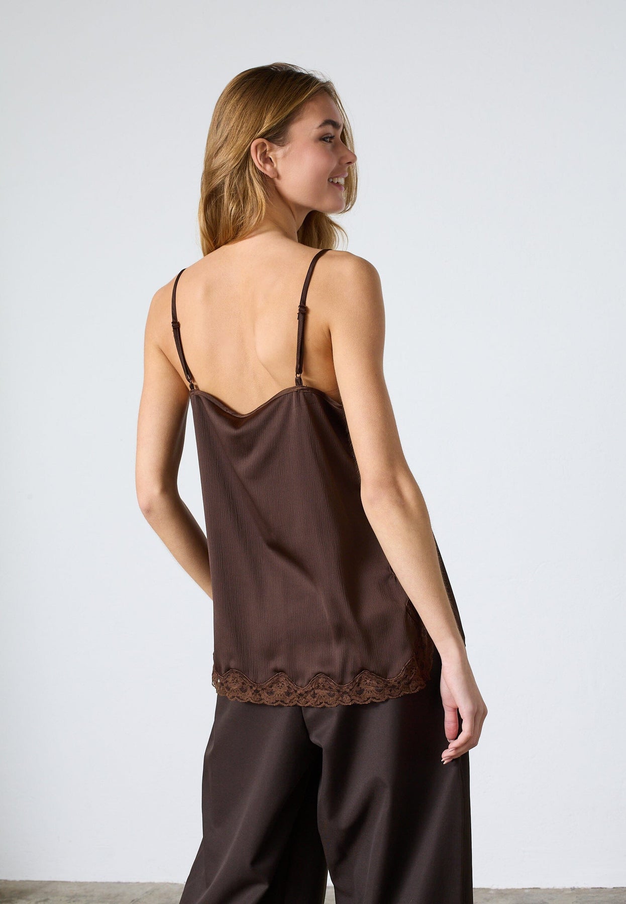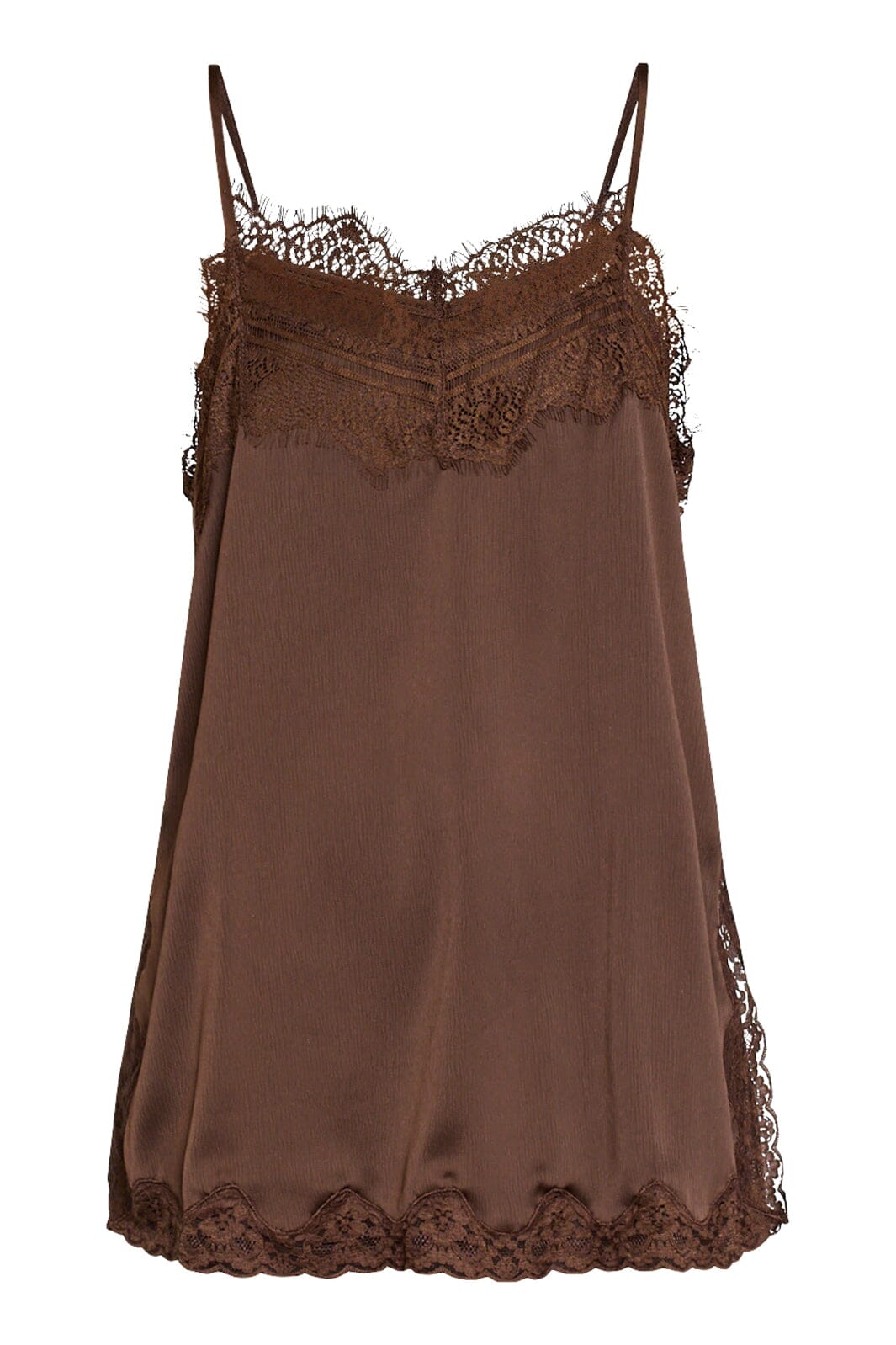 Ruskea toppi Sisters Pointilta, jossa on ohuet olkaimet ja pitsiyksityiskohtia. Topissa on V-pääntie ja väljä istuvuus, materiaali 100 % polyesteriä.