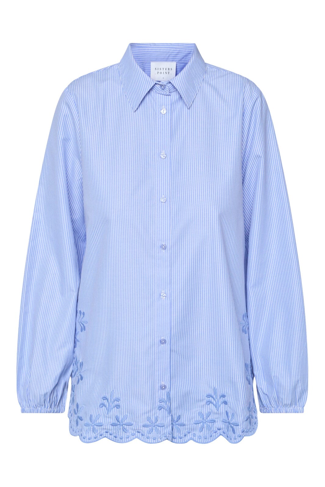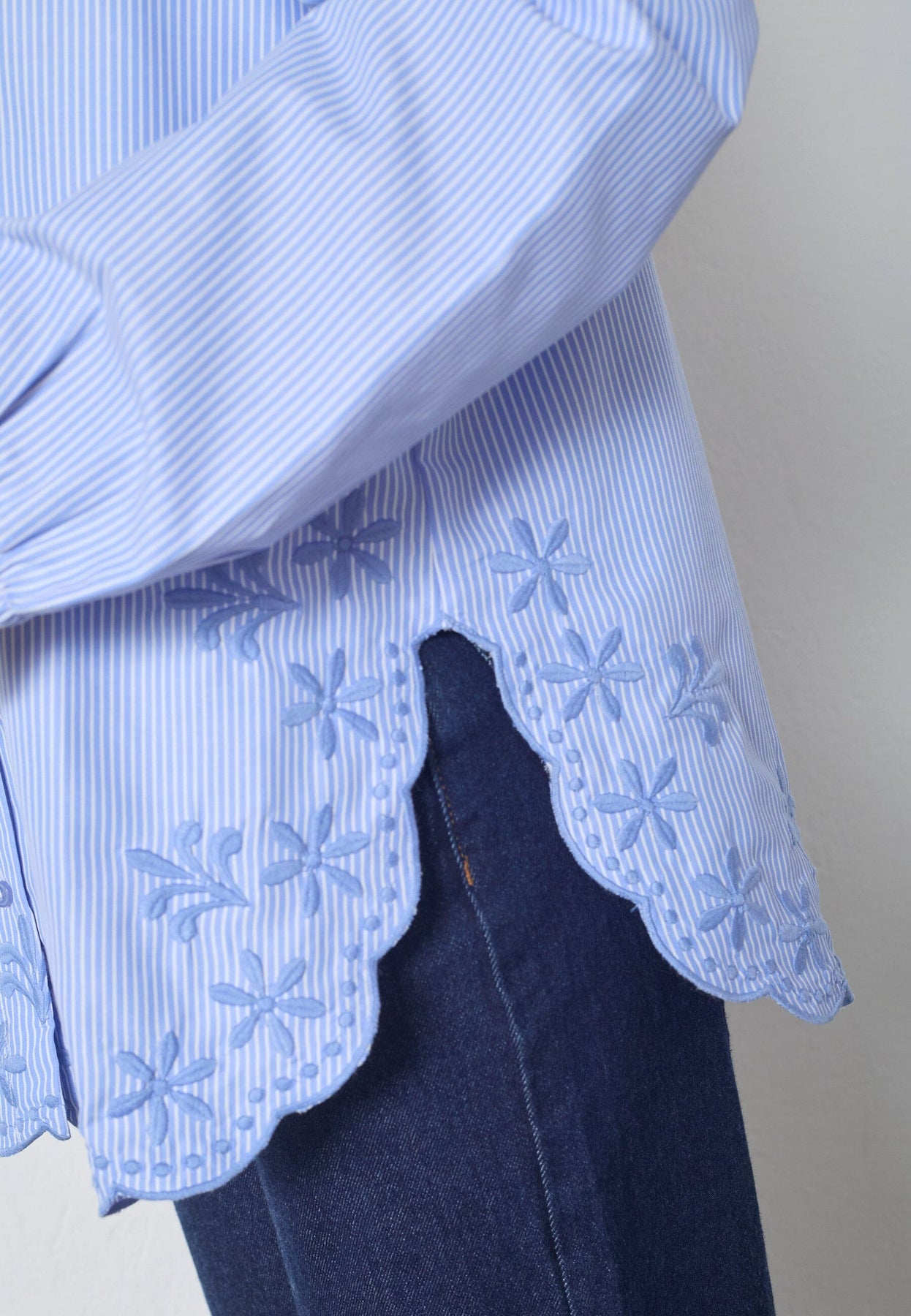 Raidallinen paita Sisters Pointilta, jossa on vaaleansiniset ja valkoiset raidat. Paidassa on kirjailtuja kukkia alahelman reunassa.