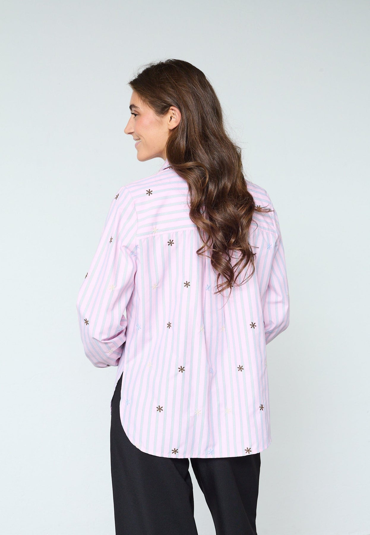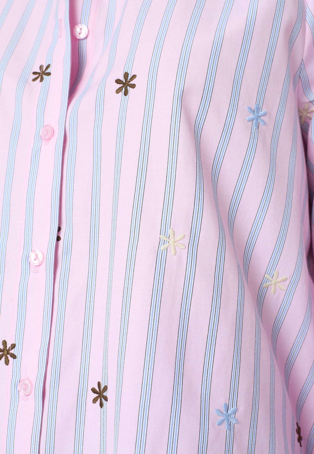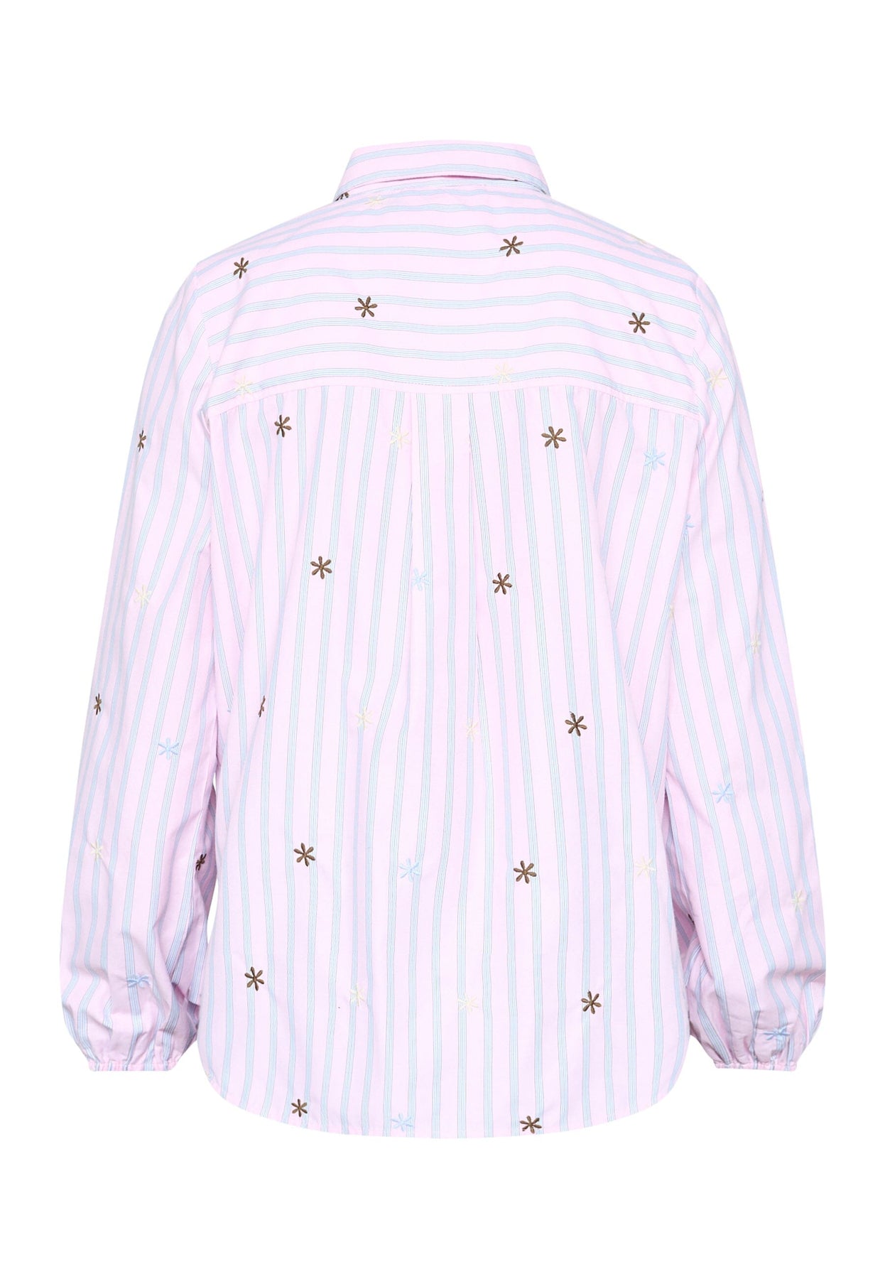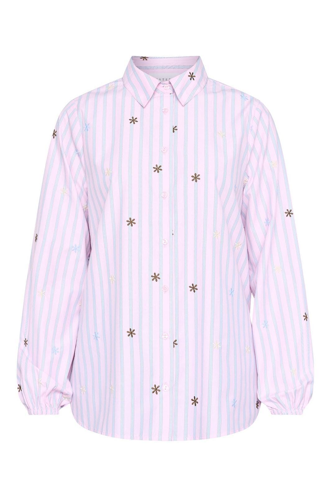Raidallinen paita Sisters Pointilta, jossa on brodeerattuja kukkayksityiskohtia. Paidassa on vaaleansiniset ja vaaleanpunaiset raidat valkoisella pohjalla.