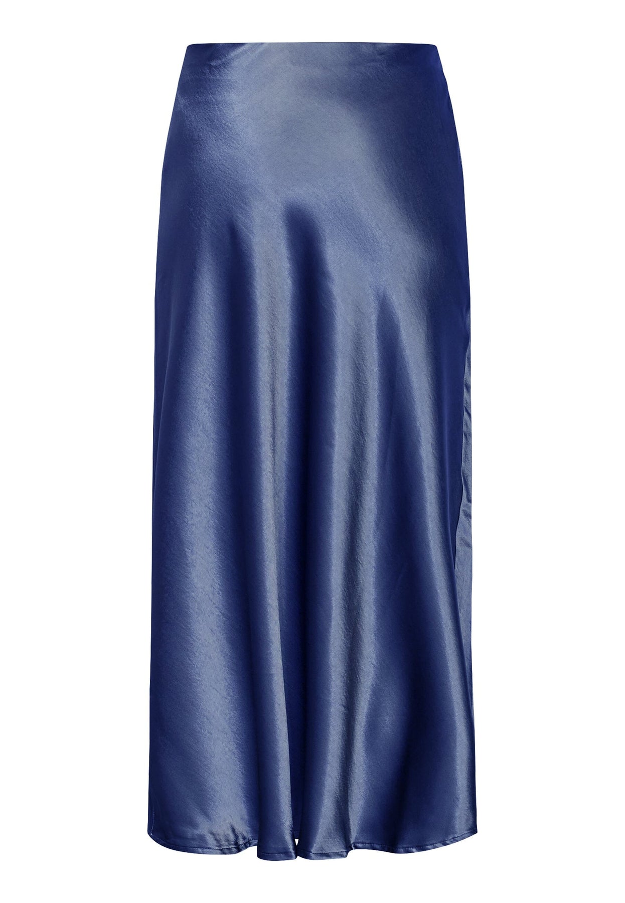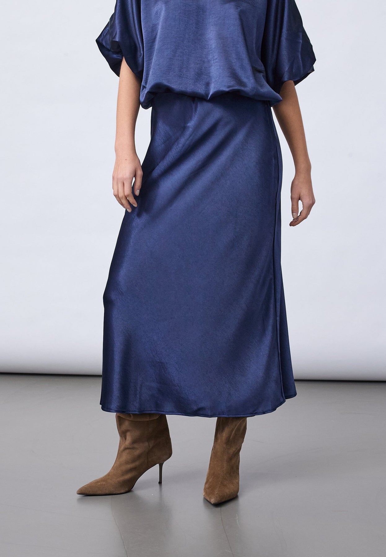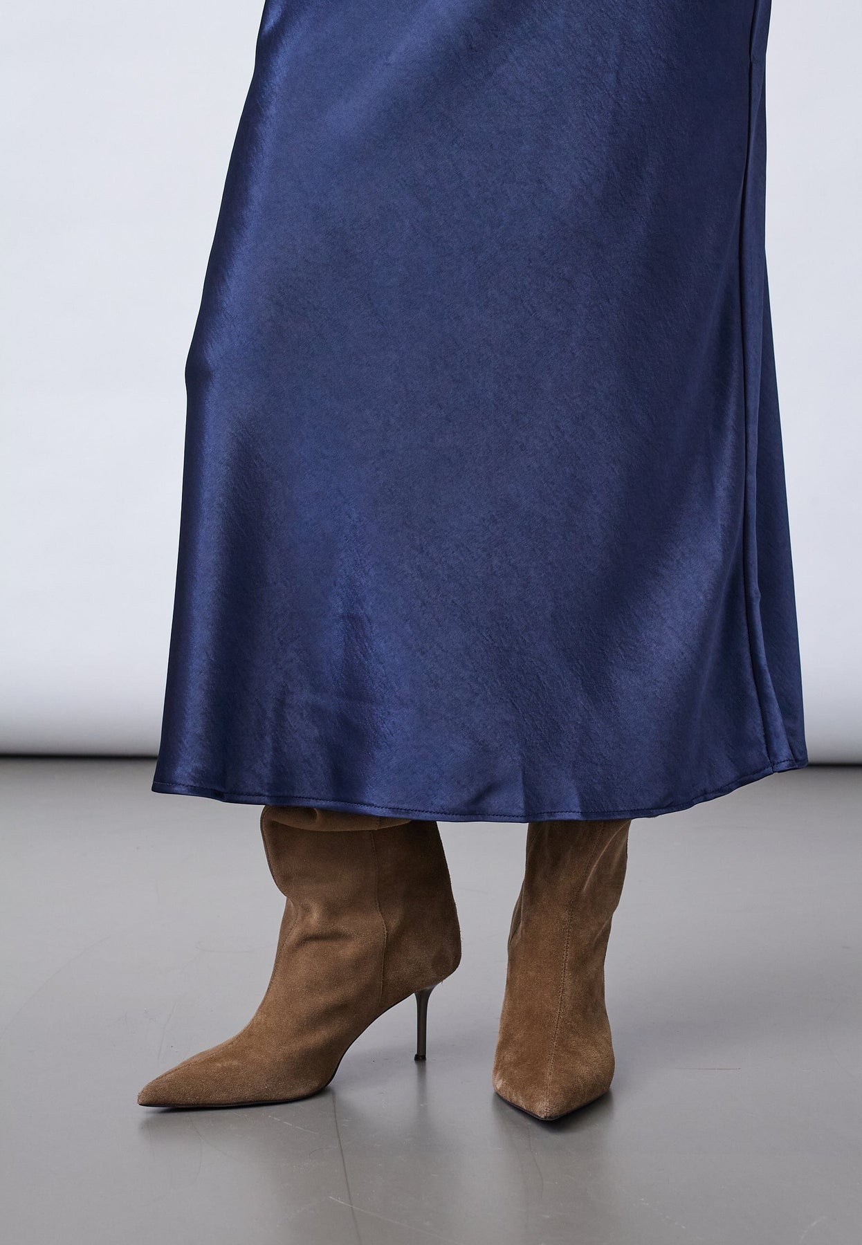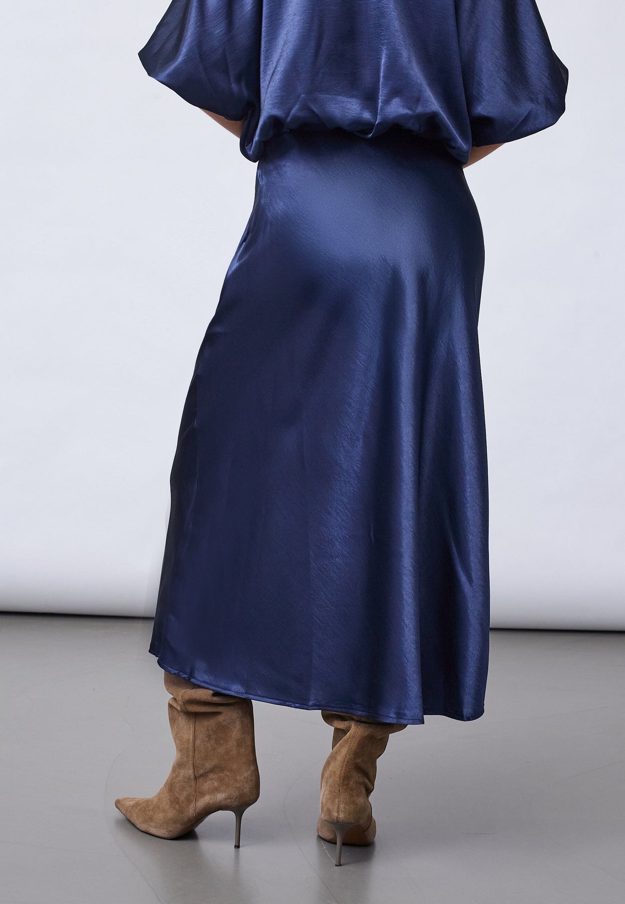 Hame Sisters Pointilta tummansinisestä 100 % polyesteristä. Hameen pituus ulottuu pohkeen keskikohtaan ja siinä on A-linjainen malli.