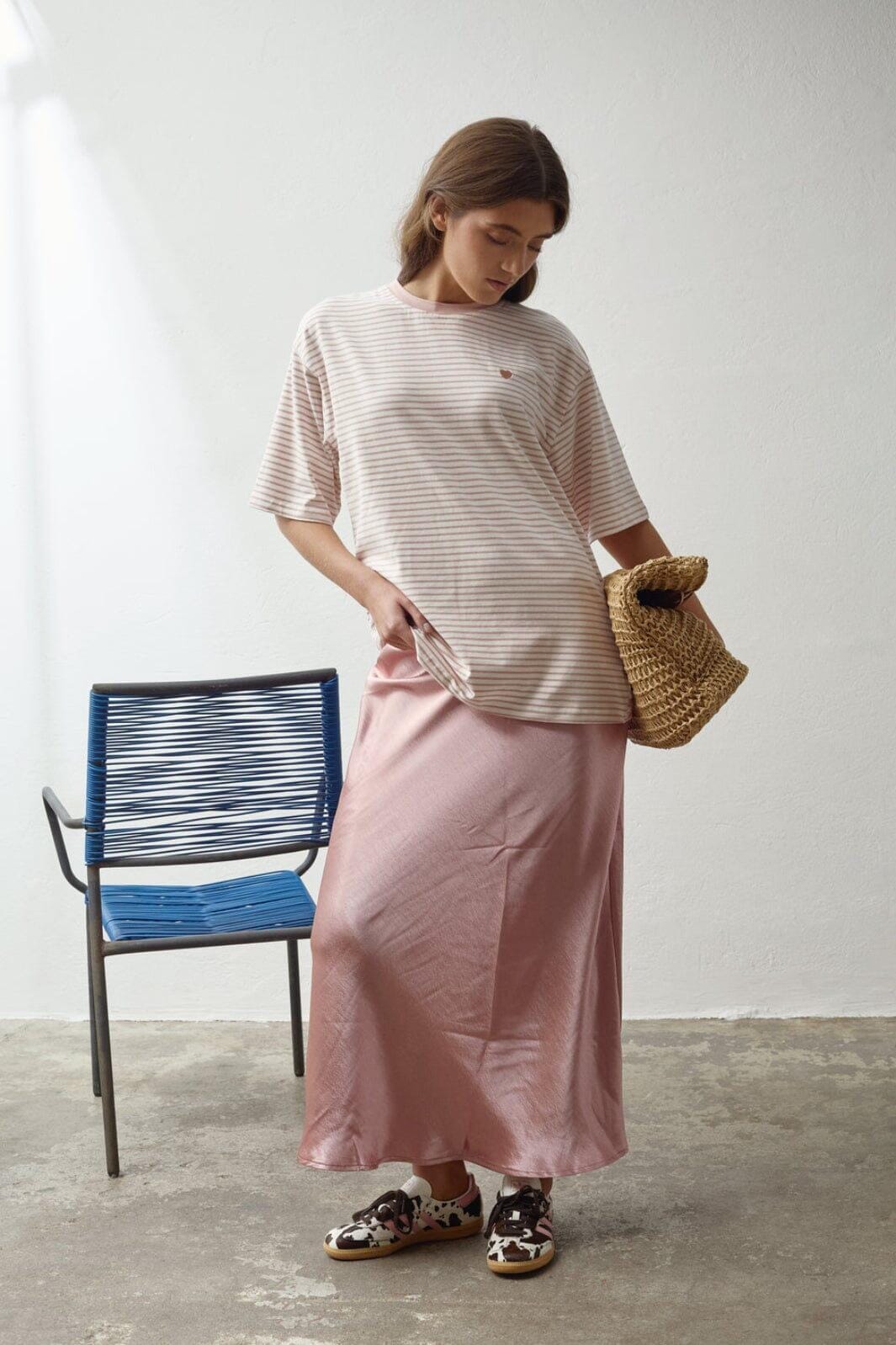 Hame Sisters Pointilta lila-vaaleanpunaisesta satiinista. Valmistettu polyesteristä, jossa on kiiltävä pinta. Hame ulottuu pohkeeseen ja siinä on normaali vyötärönkorkeus.