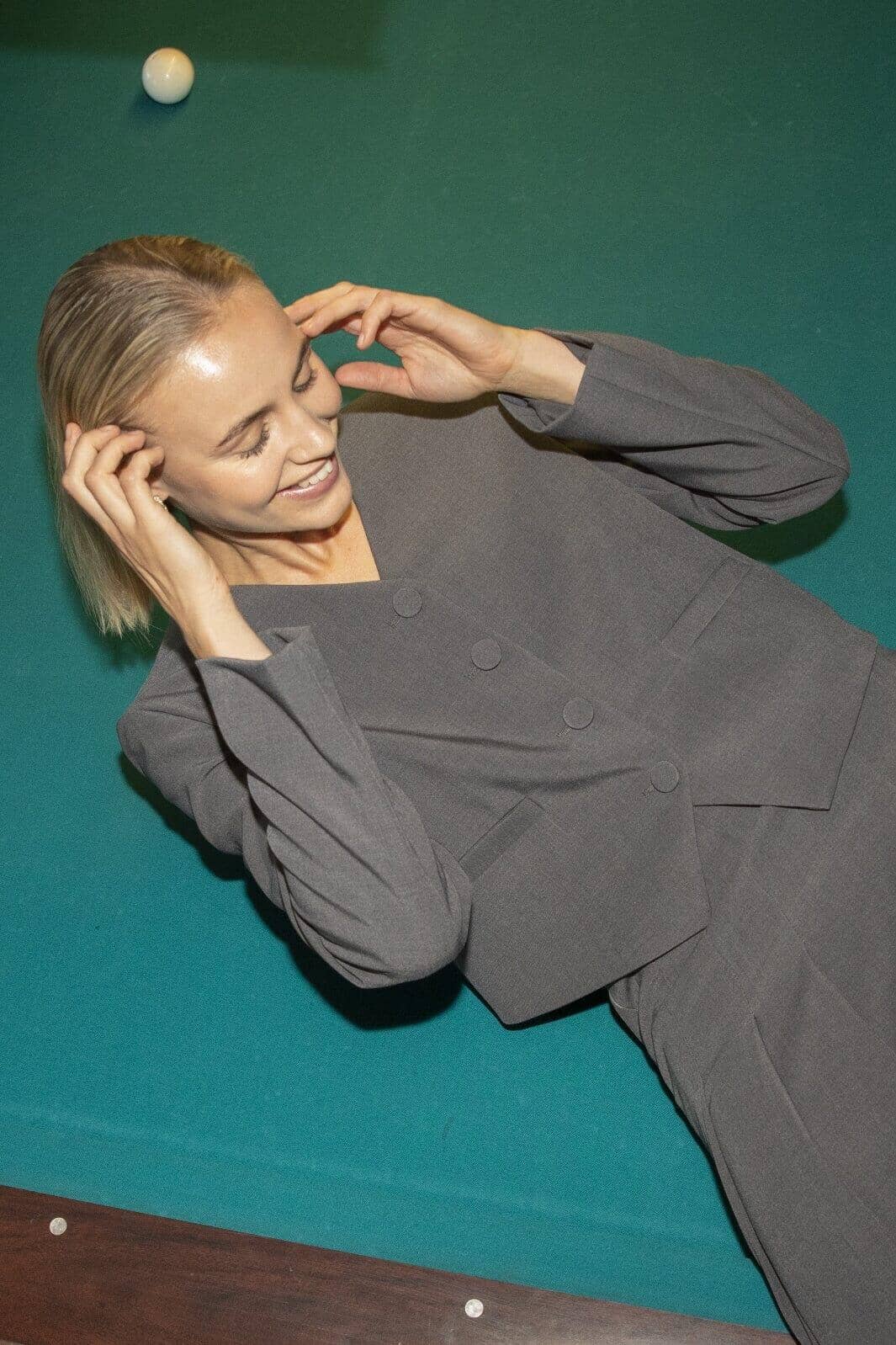 Harmaa bleiseri Sisters Pointilta, jossa on V-pääntie ja neljä nappia. Bleiserissä on pitkät hihat ja klassinen leikkaus, joka sopii sekä liiketoimintaan että muodollisiin tilaisuuksiin.