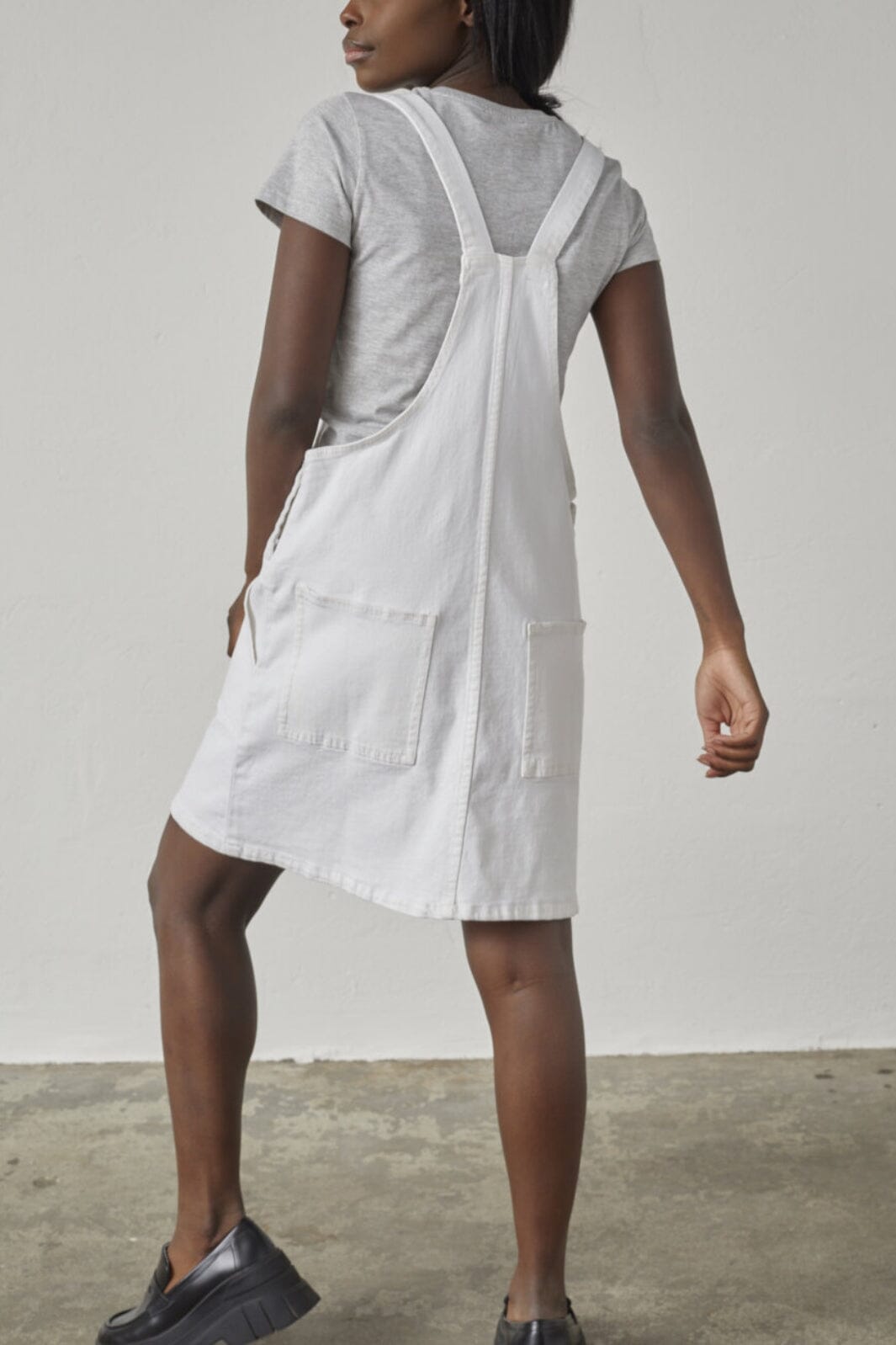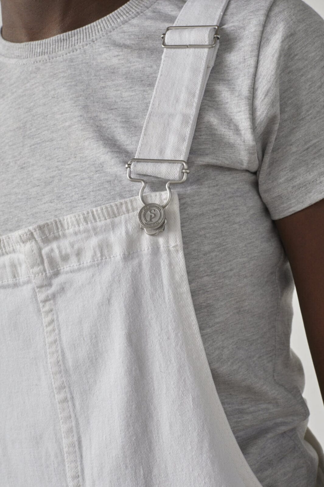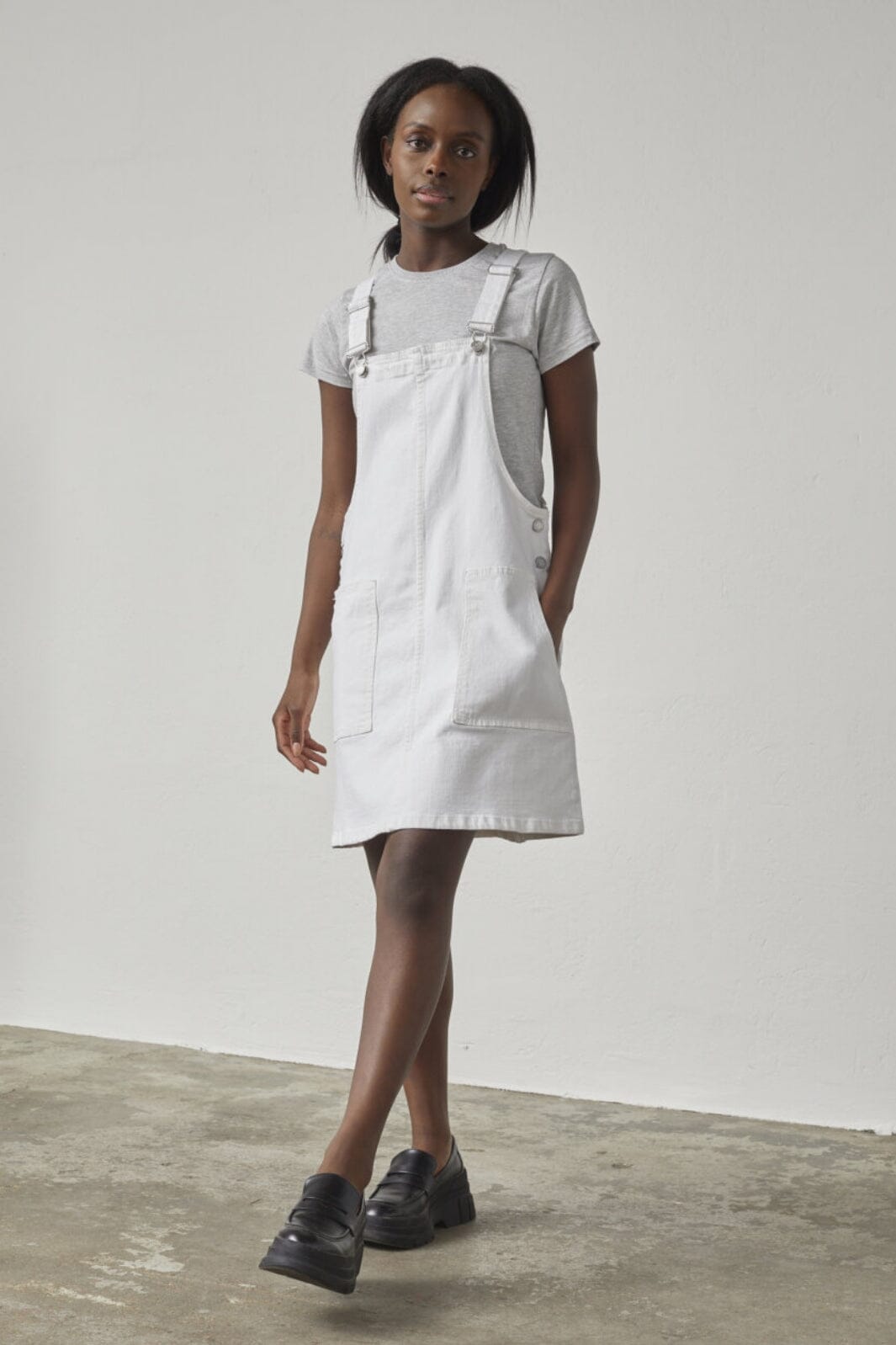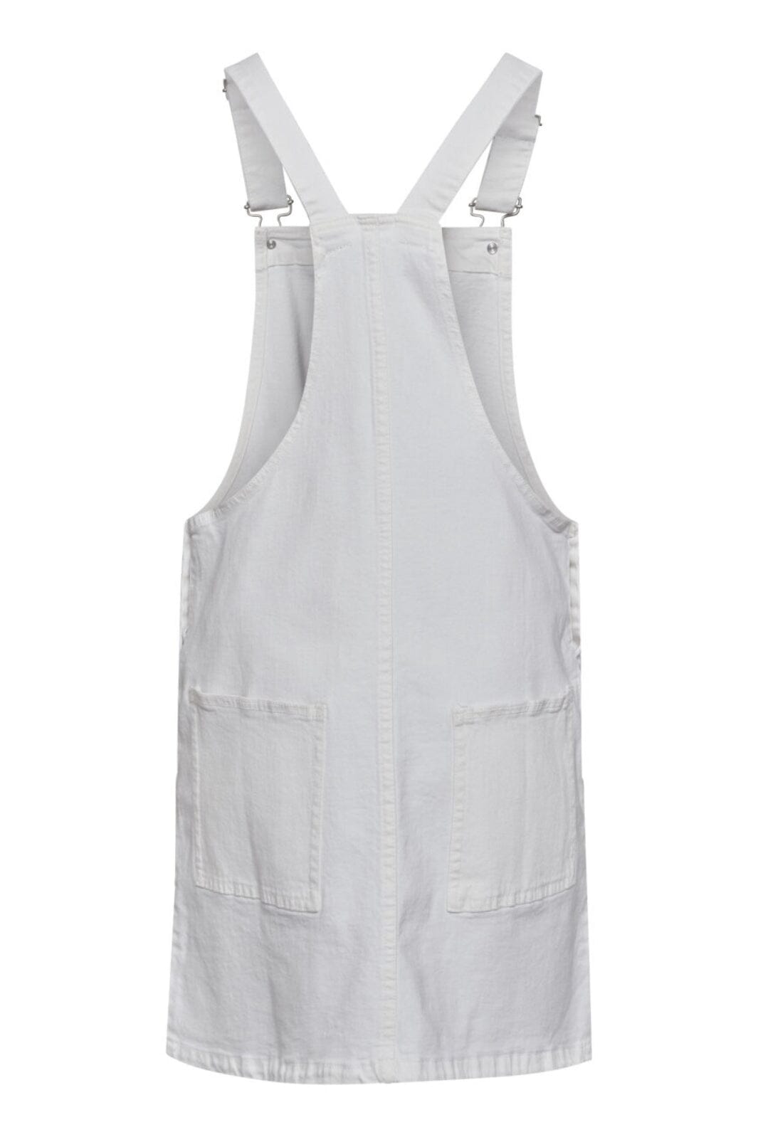 Valkoinen overallmekko Sisters Pointilta denimistä. Mekossa on helman franssit ja isot taskut edessä. Säädettävät hihnat metallisoljilla mahdollistavat istuvuuden säätämisen.