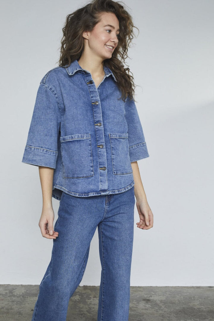 Denim-takki Sisters Pointilta sinisestä denimistä, jossa on kolmivartiset hihat. Takissa on kauluspaita, nappikiinnitys edessä ja kaksi käytännöllistä taskua sivuilla.