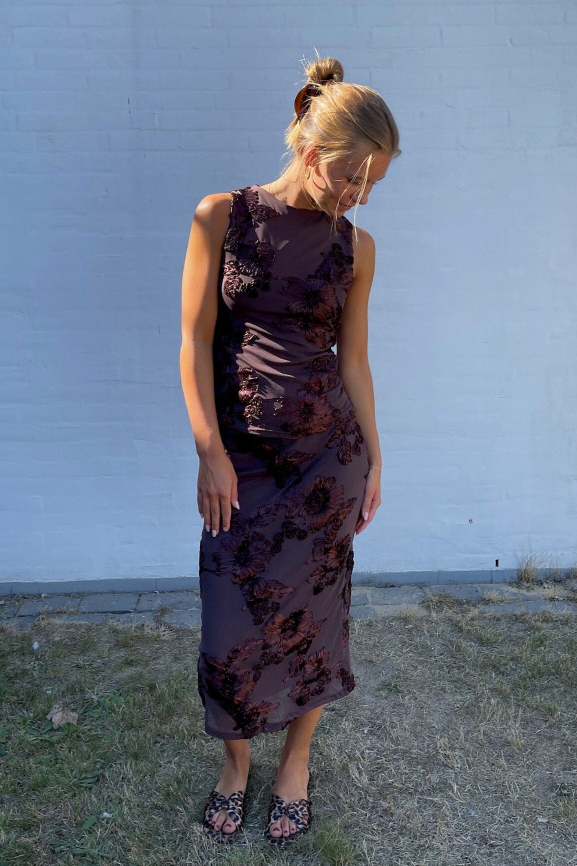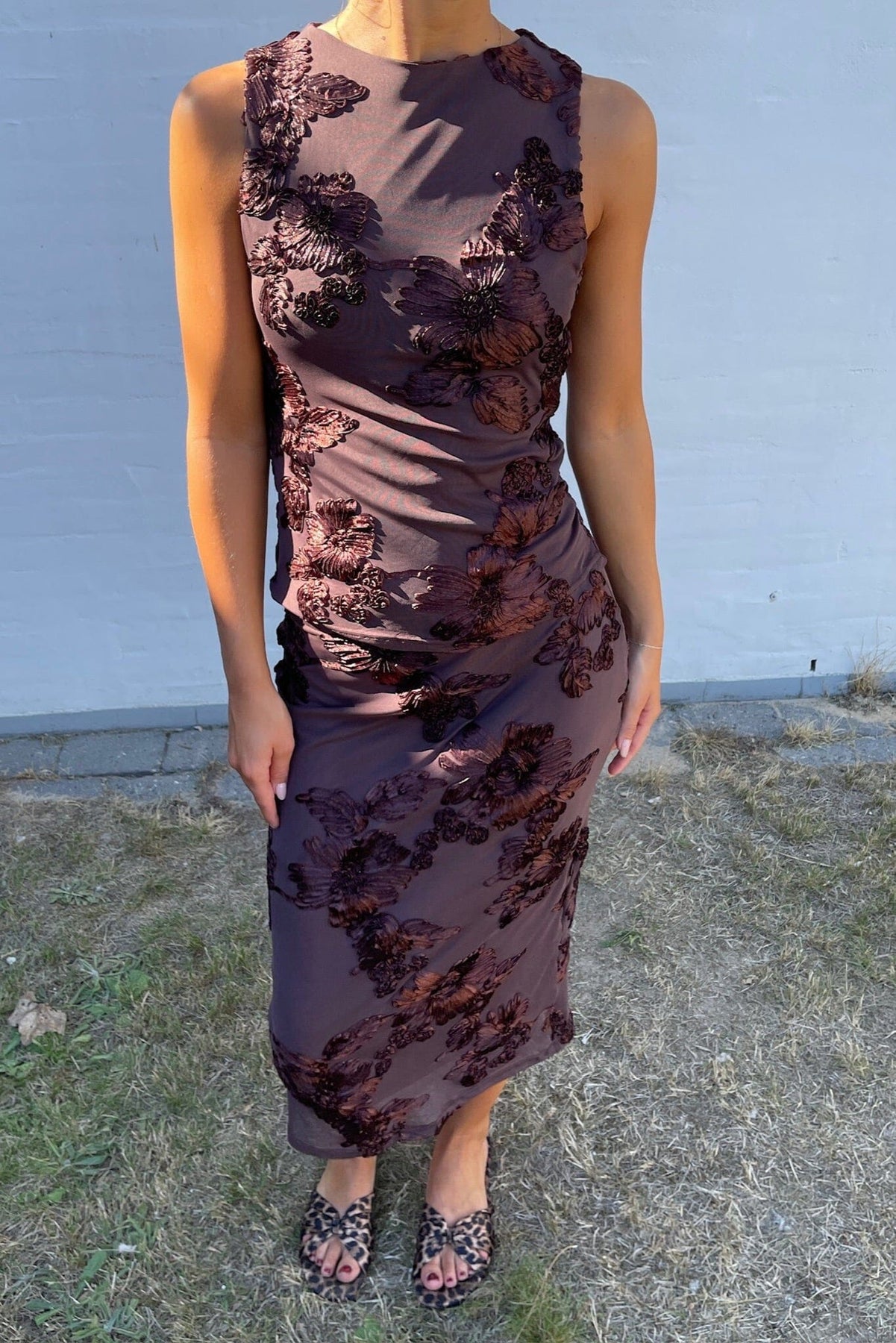 Ruskea mekko Sisters Pointilta, jossa on kirjailtuja kukkakuvioita ja paljetteja. Mekossa on vartaloa myötäilevä istuvuus ja se on hihaton, pyöreällä pääntiellä.