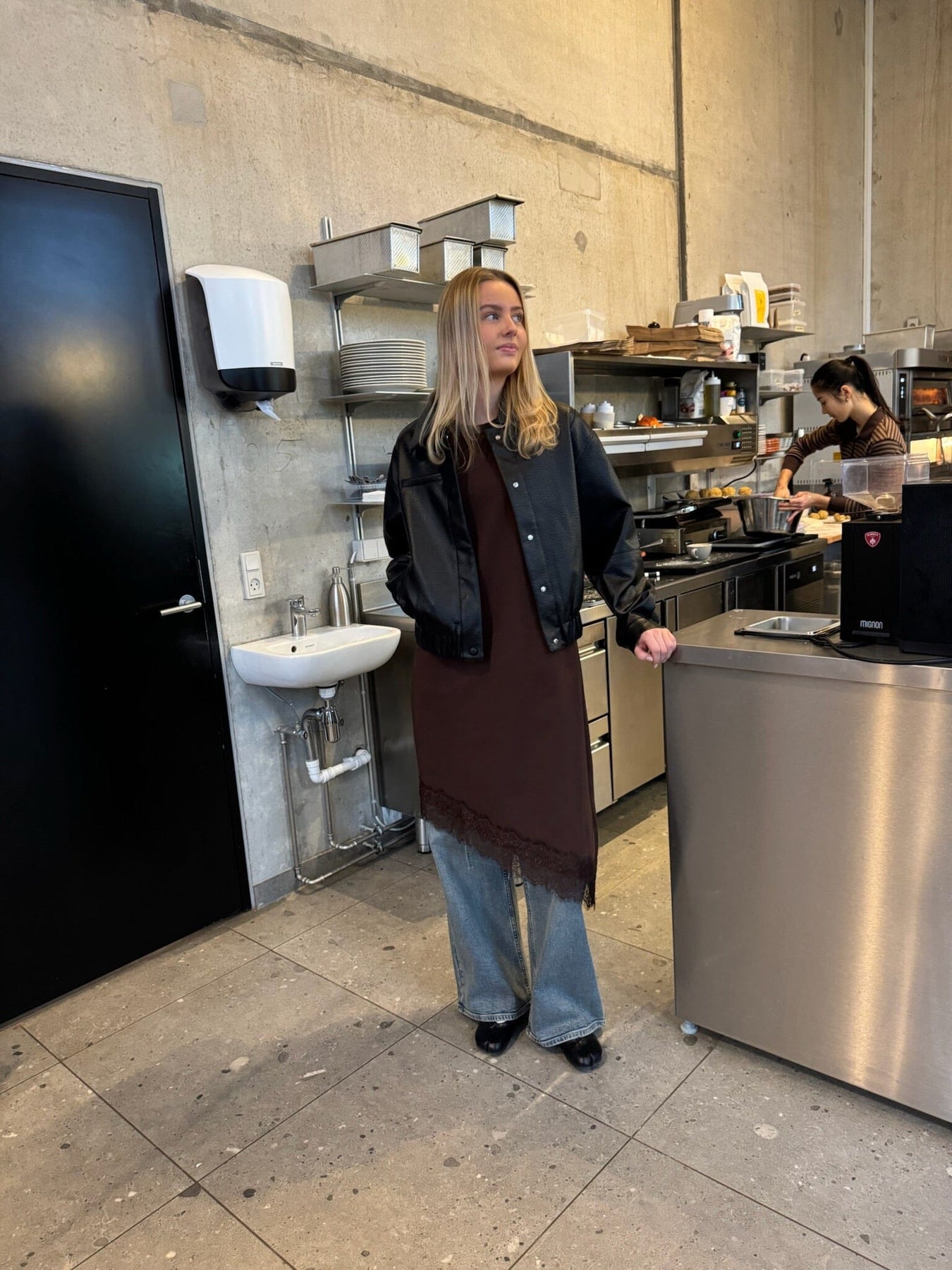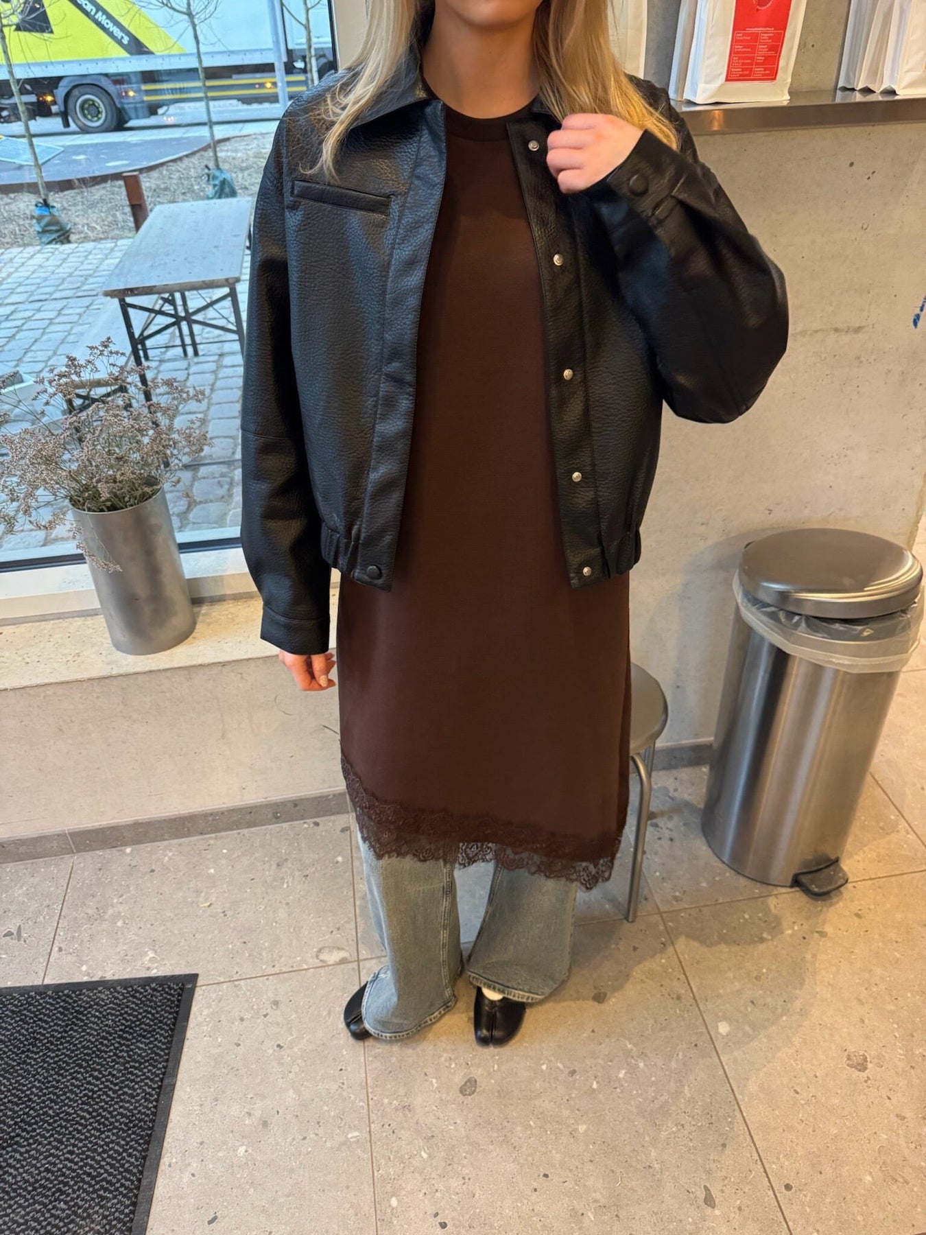 Sisters Point -mekko tumman suklaanruskeana. Mekossa on lyhyet hihat, pyöreä pääntie ja epäsymmetrinen helma pitsiyksityiskohdilla.