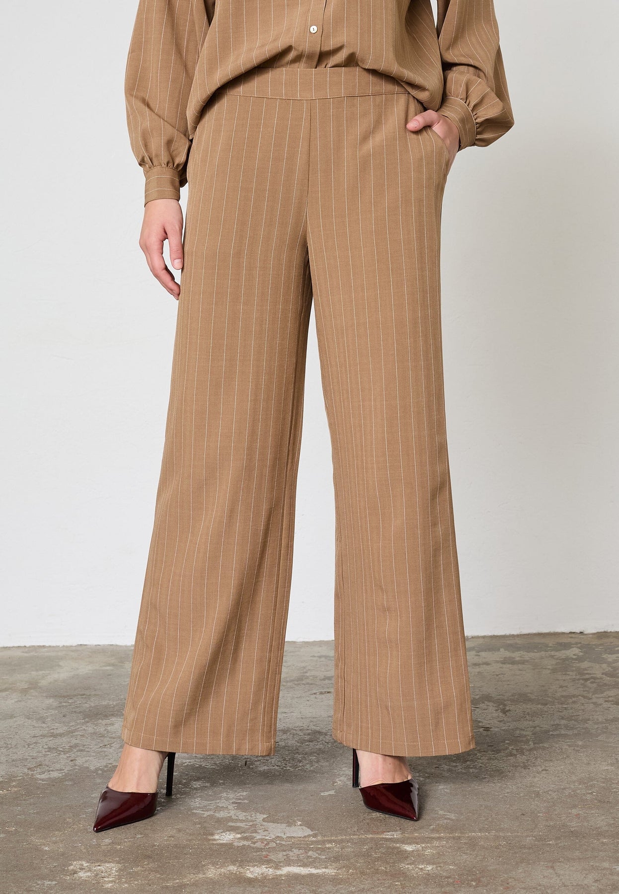 Ruskeat neularaidalliset housut Sisters Pointilta, leveillä lahkeilla ja korkealla vyötäröllä. Housut sopivat juhlaan, arkeen ja muodollisiin tilaisuuksiin.