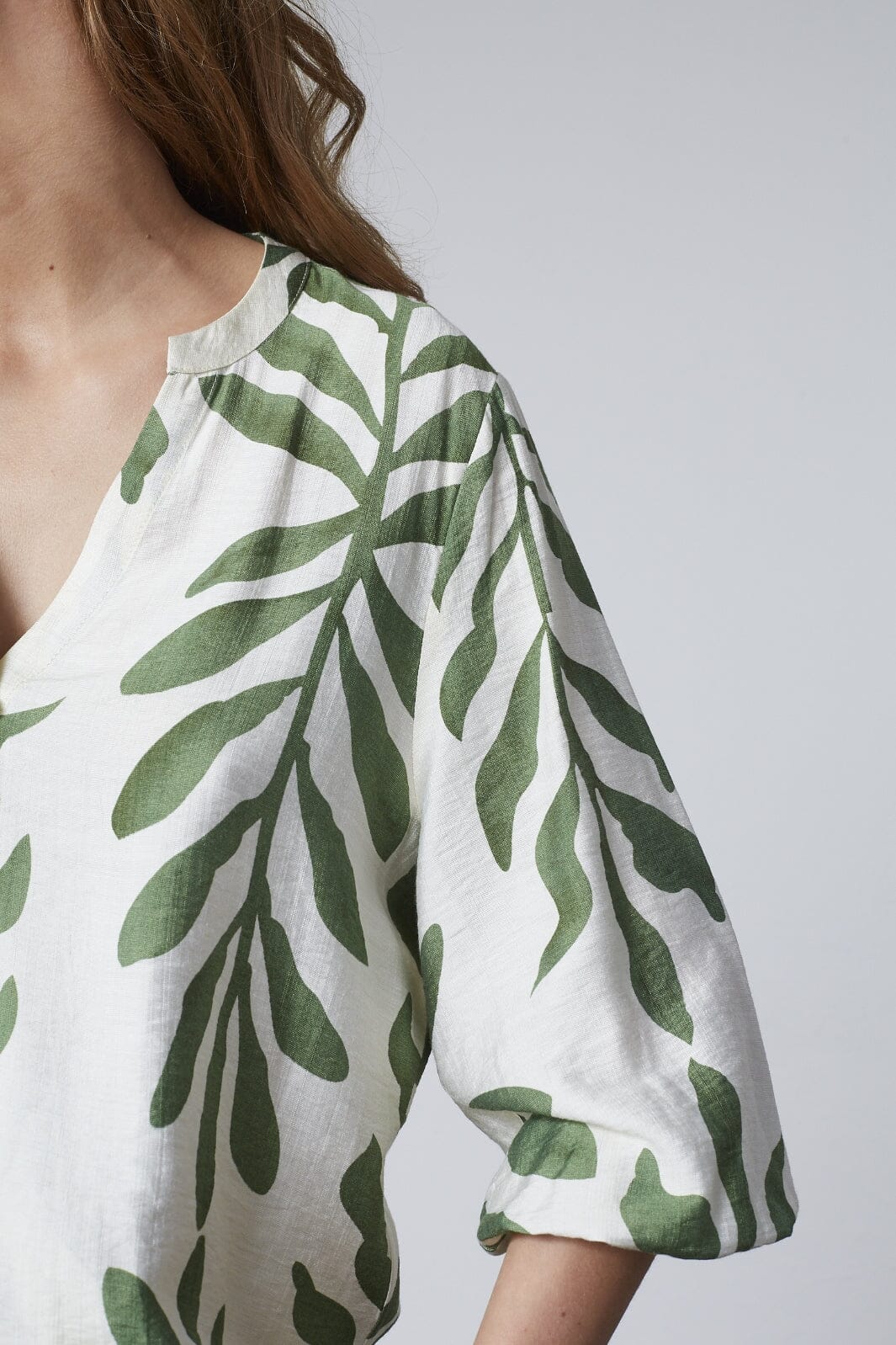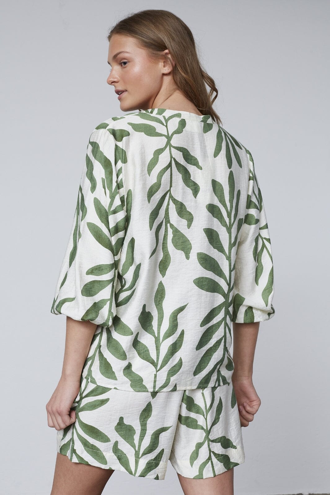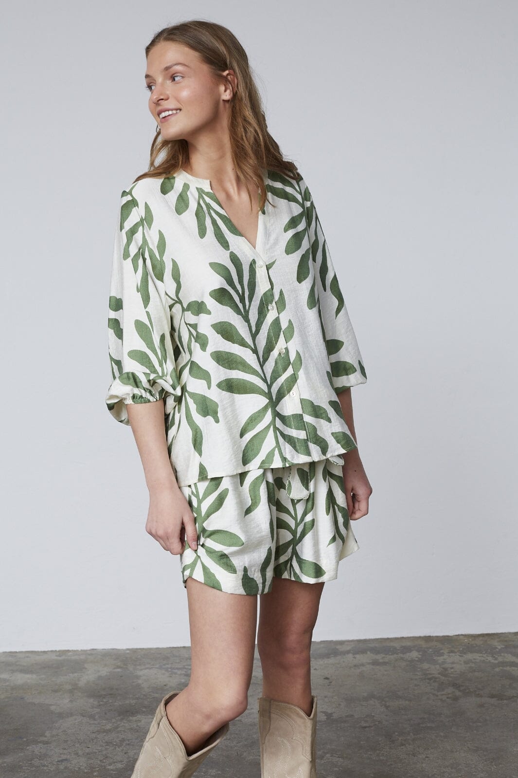 Paidat Sisters Pointilta, jossa on lehtikuvio khakivärillä kermanvalkoisella taustalla. Siinä on kolmen neljänneksen hihat ja V-pääntie nappilukolla edessä.