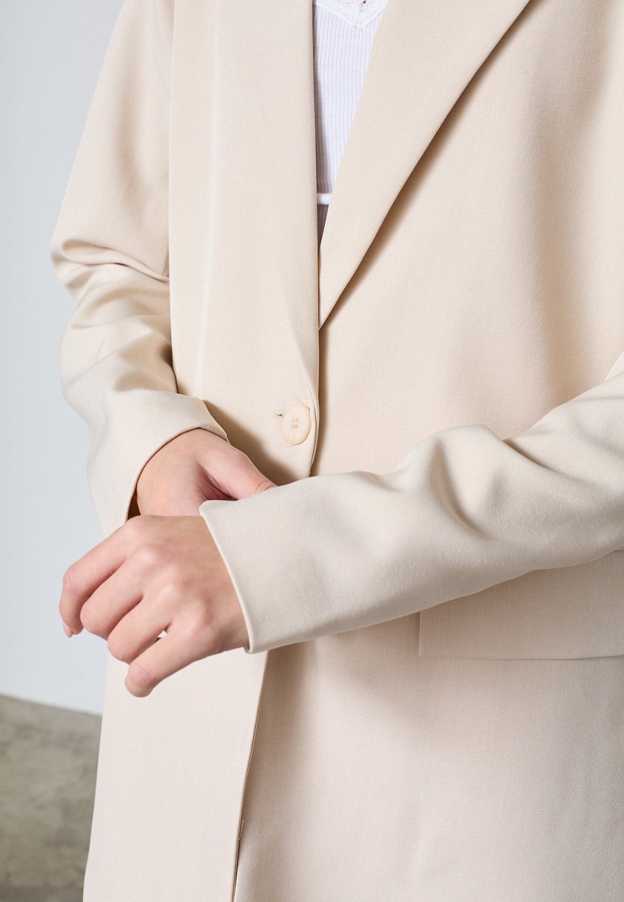 Vaalea bleiseri Sisters Pointilta värissä Fog, neutraali beige sävy. Bleiserissä on lovikaulus, nappikiinnitys edessä ja kaksi taskua.