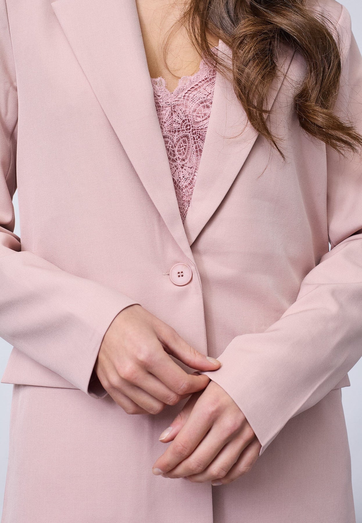 Bleiseri Sisters Pointilta vaaleanpunaisen ja violetin sävyssä. Bleiserissä on lovikaulus ja nappikiinnitys edessä sekä kolme koristepainiketta hihoissa.