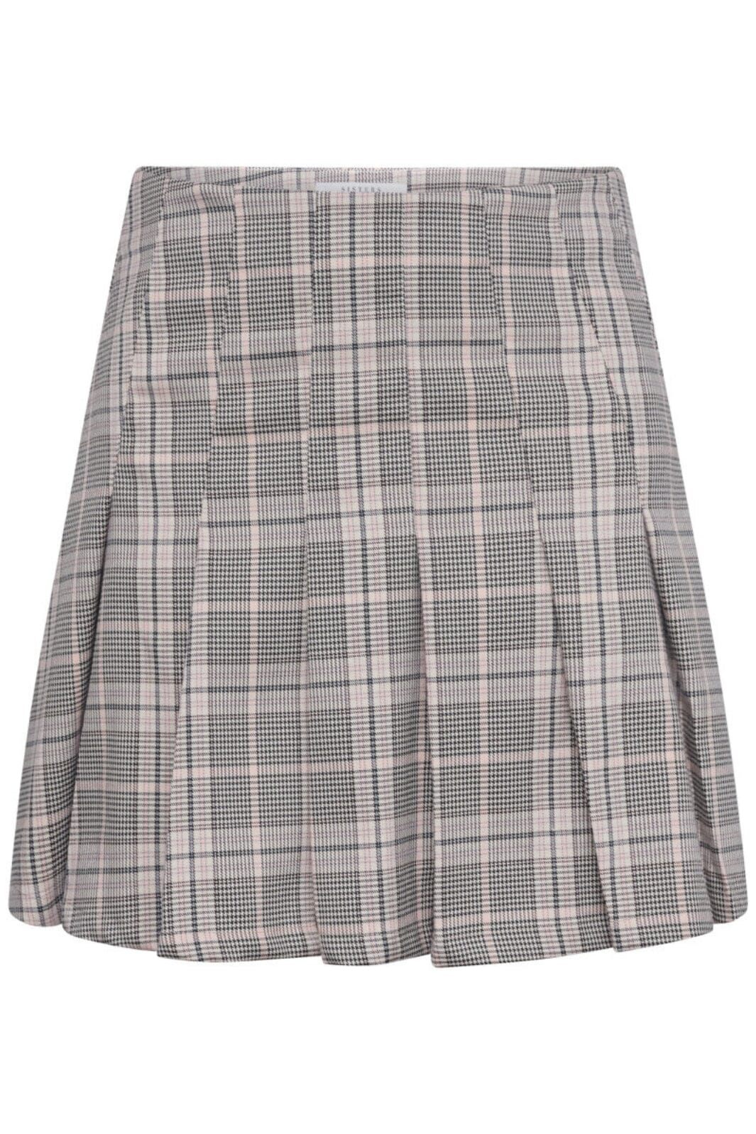 Ruudullinen hame Sisters Pointilta, jossa on laskostettu muotoilu polven pituudelle. Korkea vyötärö ja harmaan, vaaleanpunaisen ja vihreän sävyjen ruudullinen kuvio antavat hameelle pehmeän ja naisellisen ilmeen.