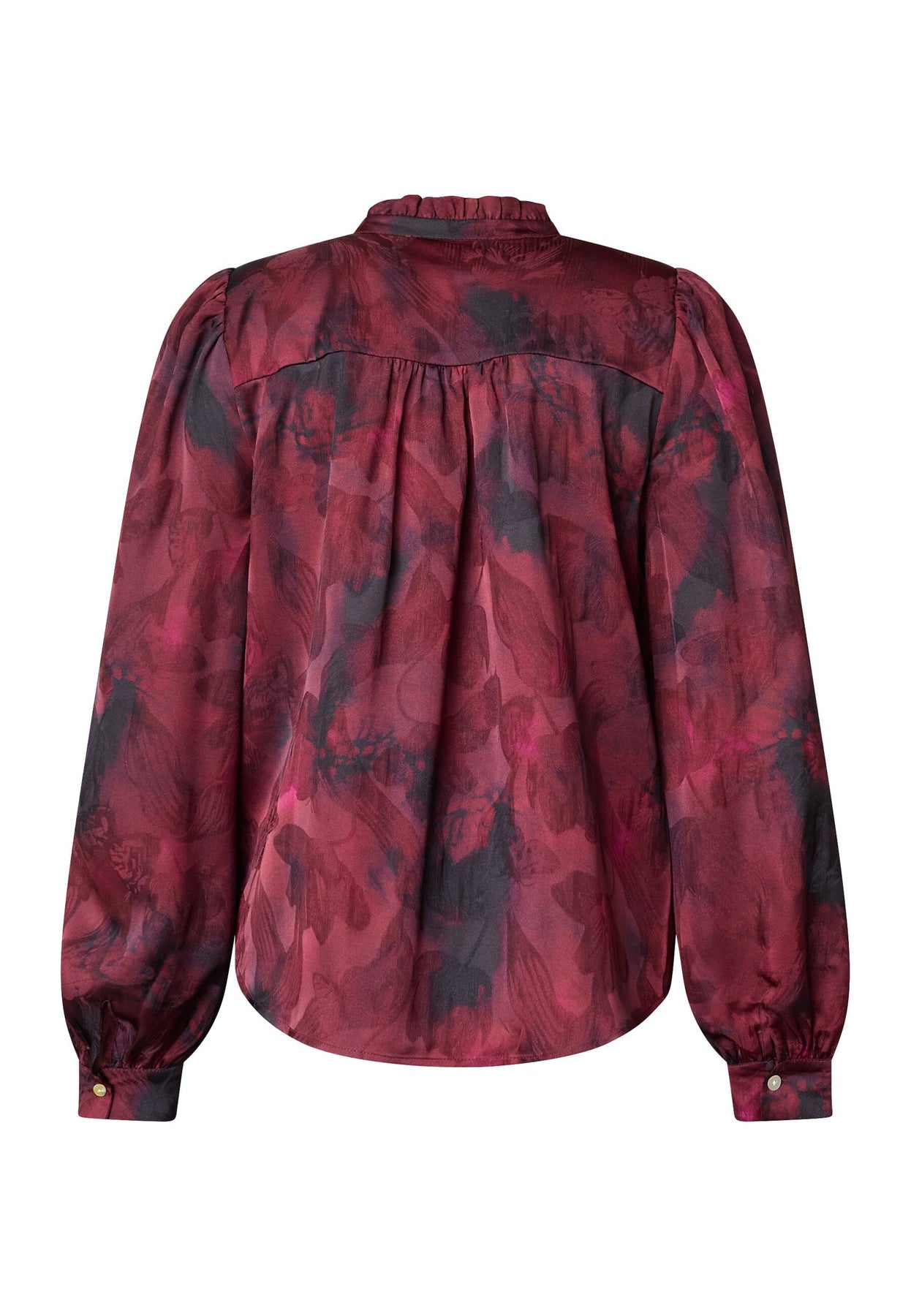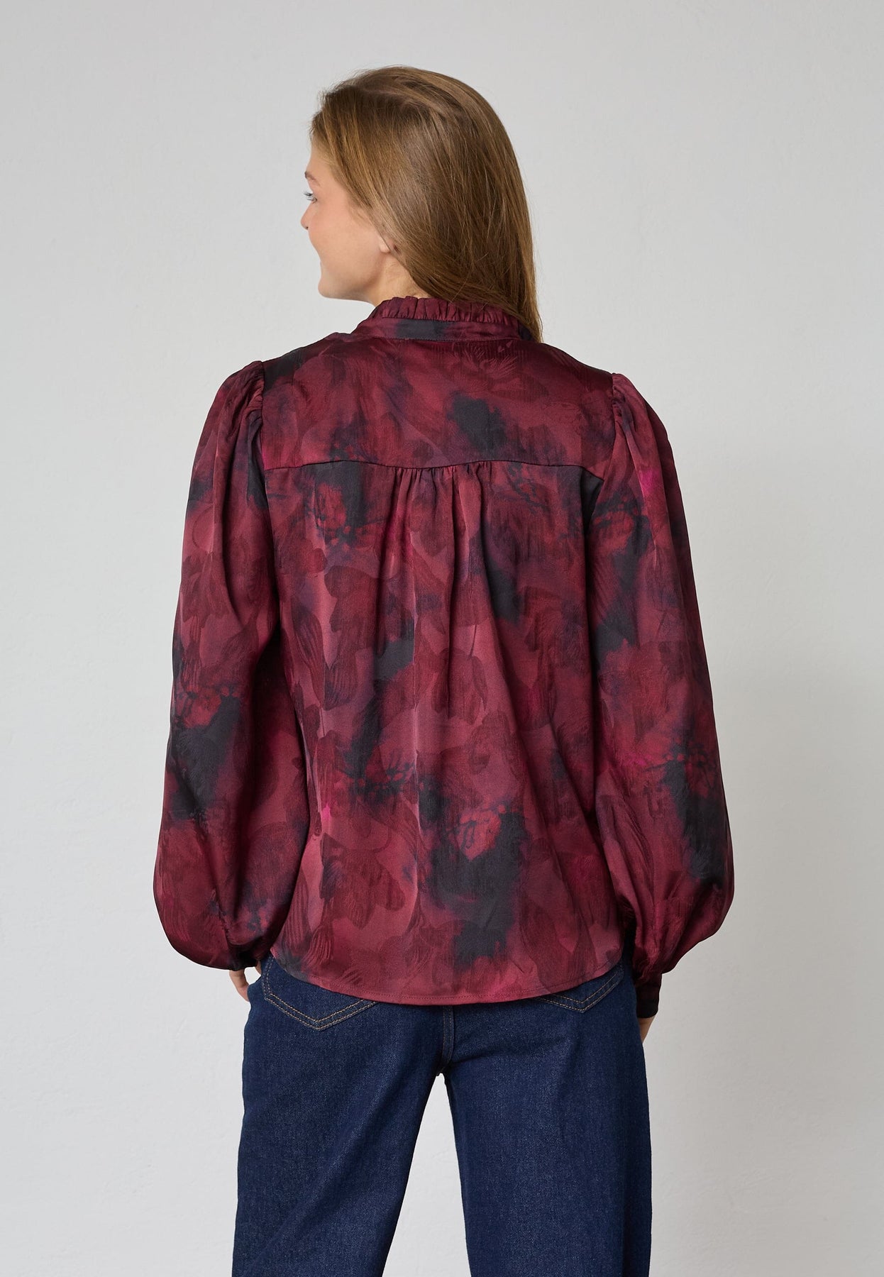 Paita Sisters Pointilta bordeaux-värissä, jossa on häilyvä kukkakuosi. Paidassa on korkea kaulus, jossa on röyhelöitä, ja edessä nappikiinnitys valkoisilla napeilla.