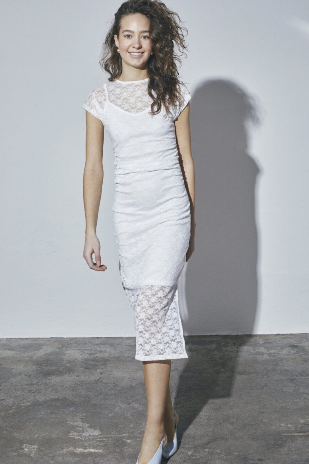 Valkoinen pitsimekko Sisters Pointilta, jossa on pyöreä pääntie ja lyhyet hihat. Mekko on tiukasti istuva ja siinä on alushame.