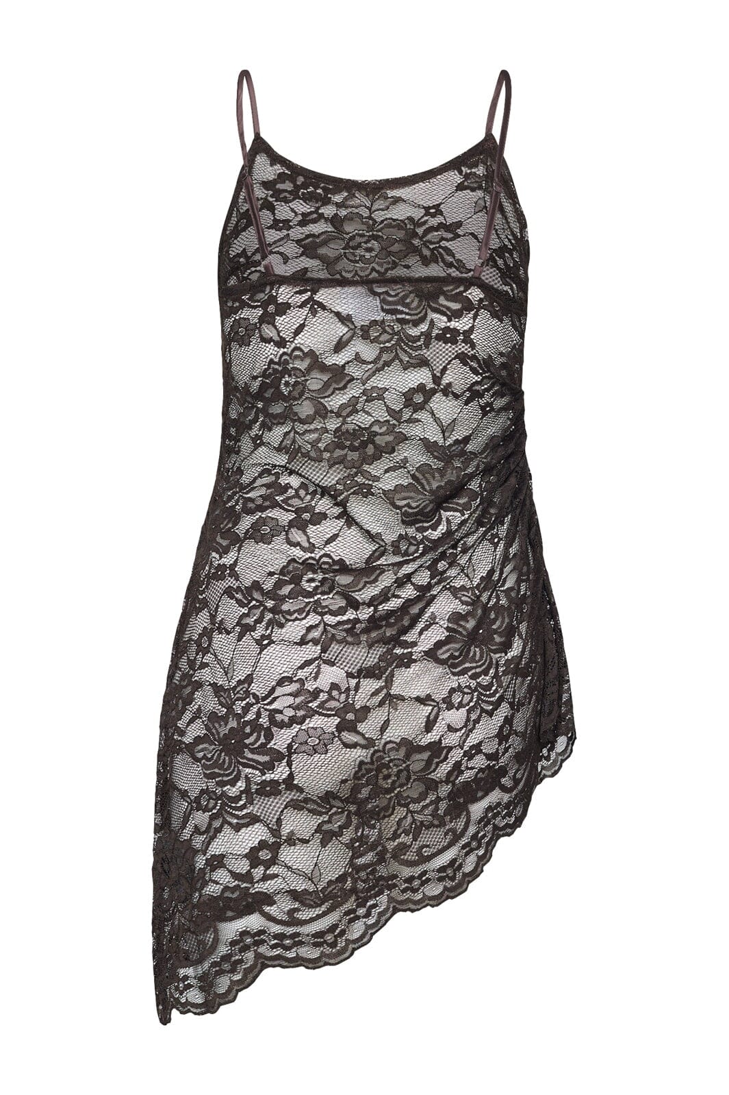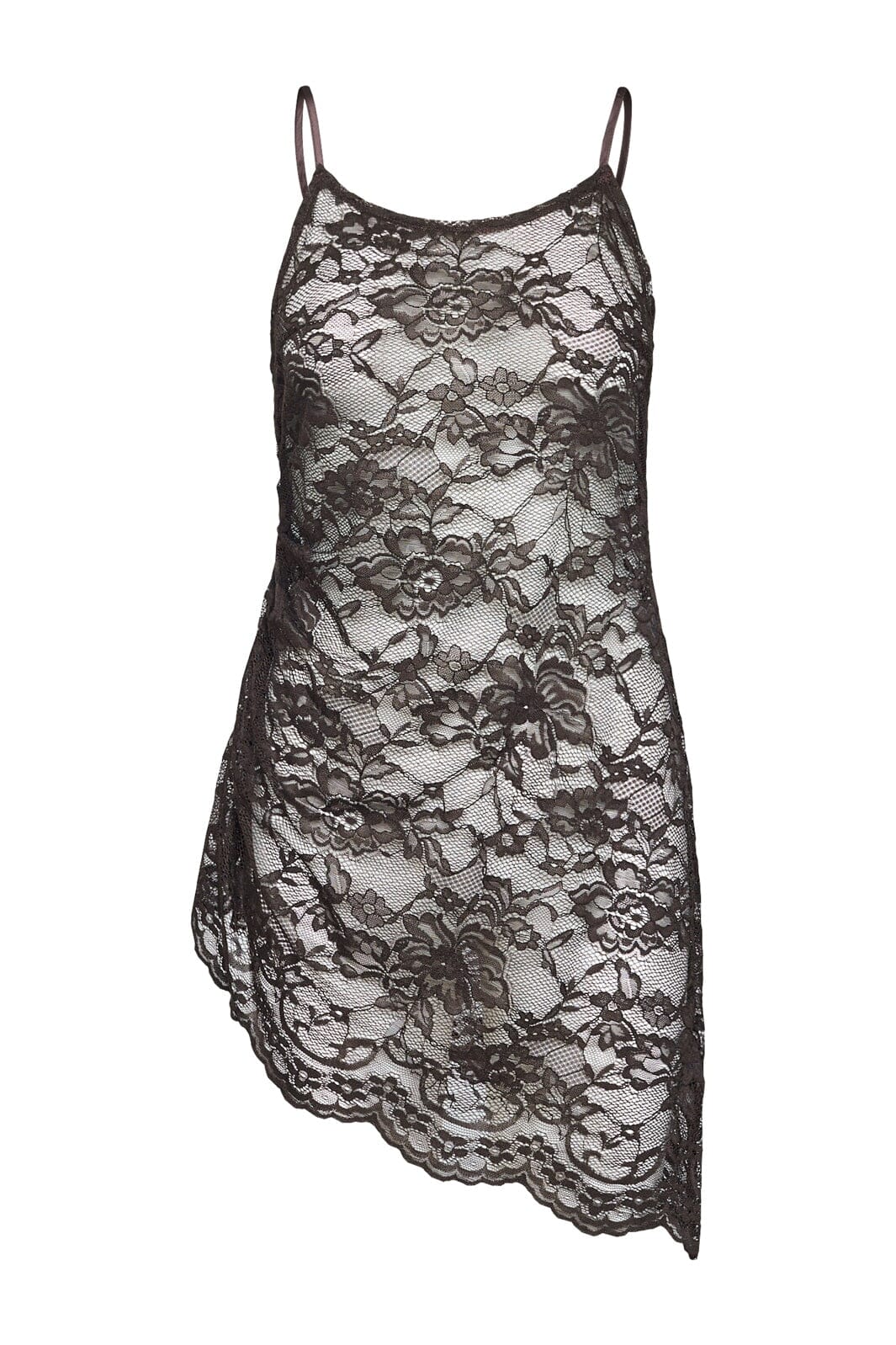 Blondimekko Sisters Pointilta syvässä ruskeassa sävyssä. Mekko on läpinäkyvä ja siinä on kokonaan peittävä kukkakuvioinen pitsi.