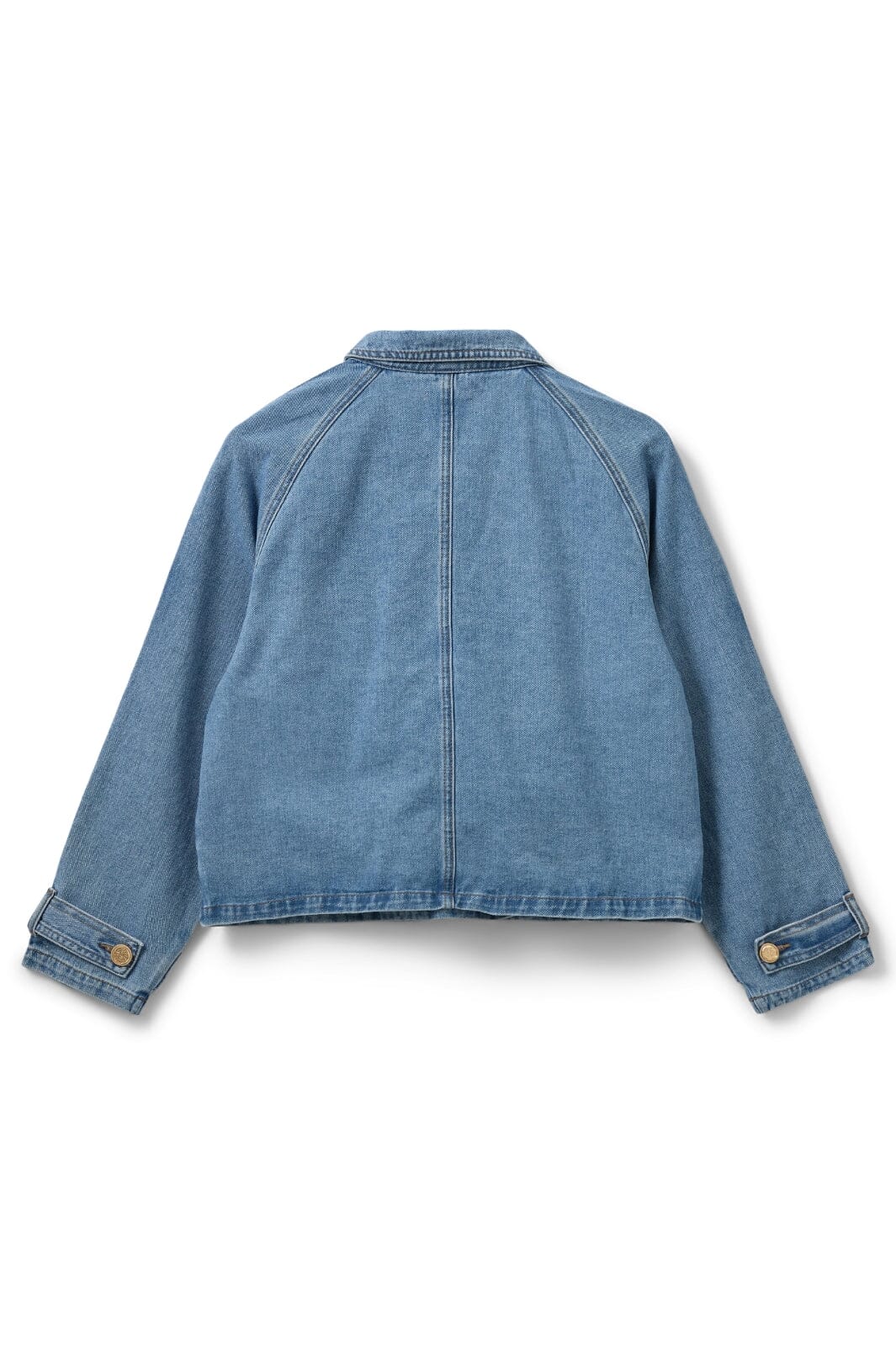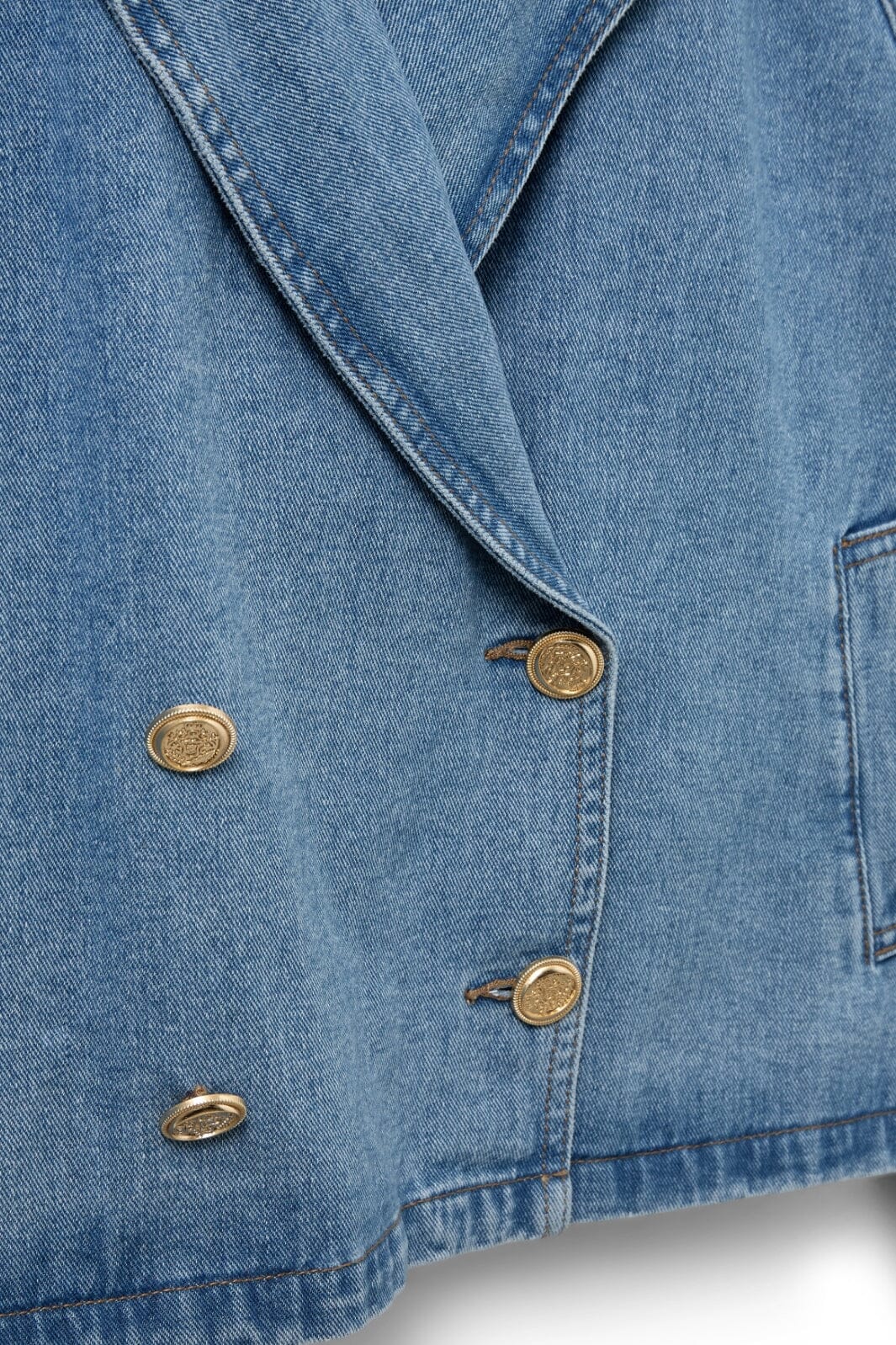 Denimsininen takki Sofie Schnoorilta, jossa on lyhyt pituus ja kauluspaita. Kaksoisnapitus edessä, ja takissa on koristeellisia saumoja.