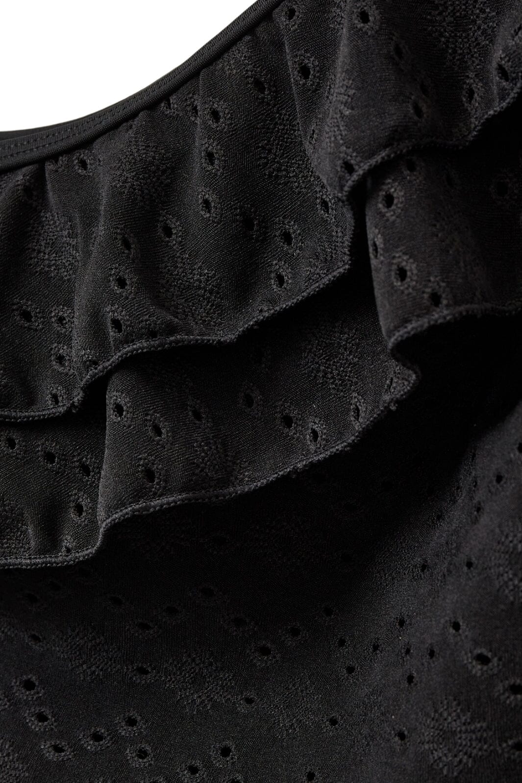 Musta uimapuku Sofie Schnoorilta yhdellä olkapäällä. Siinä on rakenteellinen kuvio, jossa on pieniä reikiä ja röyhelöreuna olkapään ympärillä.