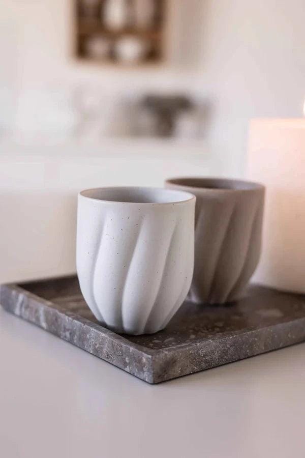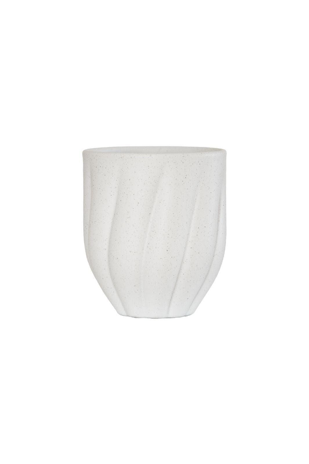 Keraaminen muki Specktrumilta, jossa on aaltoilevia viivoja pinnassa. Off-white mukilla on hieman kapeneva muoto pohjaa kohti, ja se on suunniteltu ilman kahvaa puhtaan ilmeen saavuttamiseksi.
