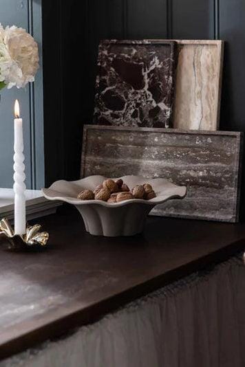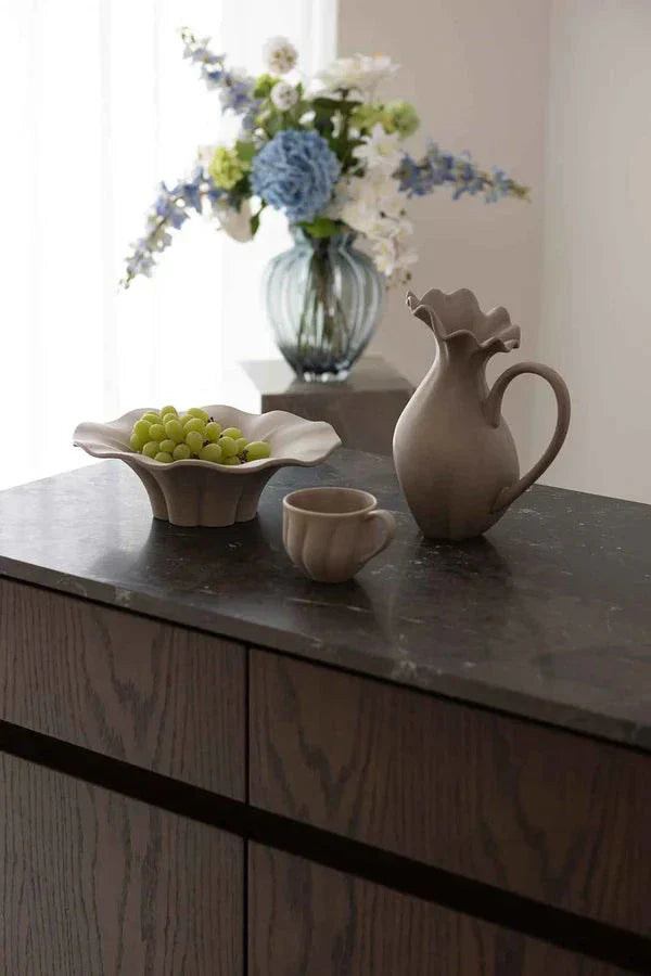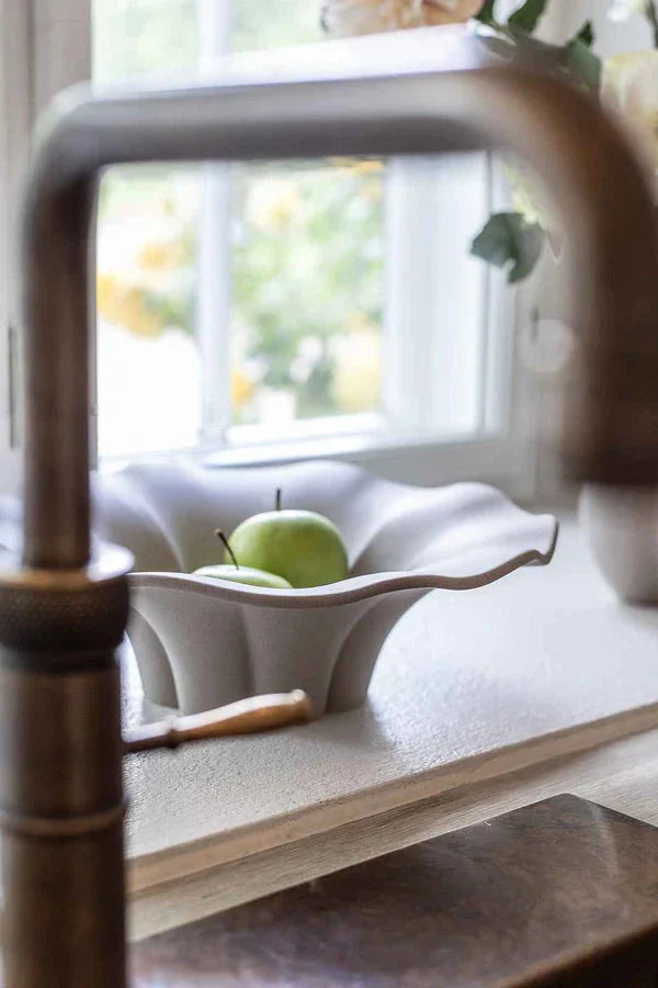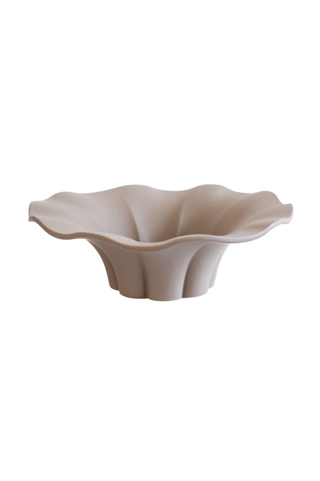 Hiekka värinen keramiikkakulho Specktrumilta, jossa on aaltoileva reuna ja matta pinta. Kulho on valmistettu perinteisellä käsityötekniikalla, mikä antaa jokaiselle kappaleelle oman luonteen.