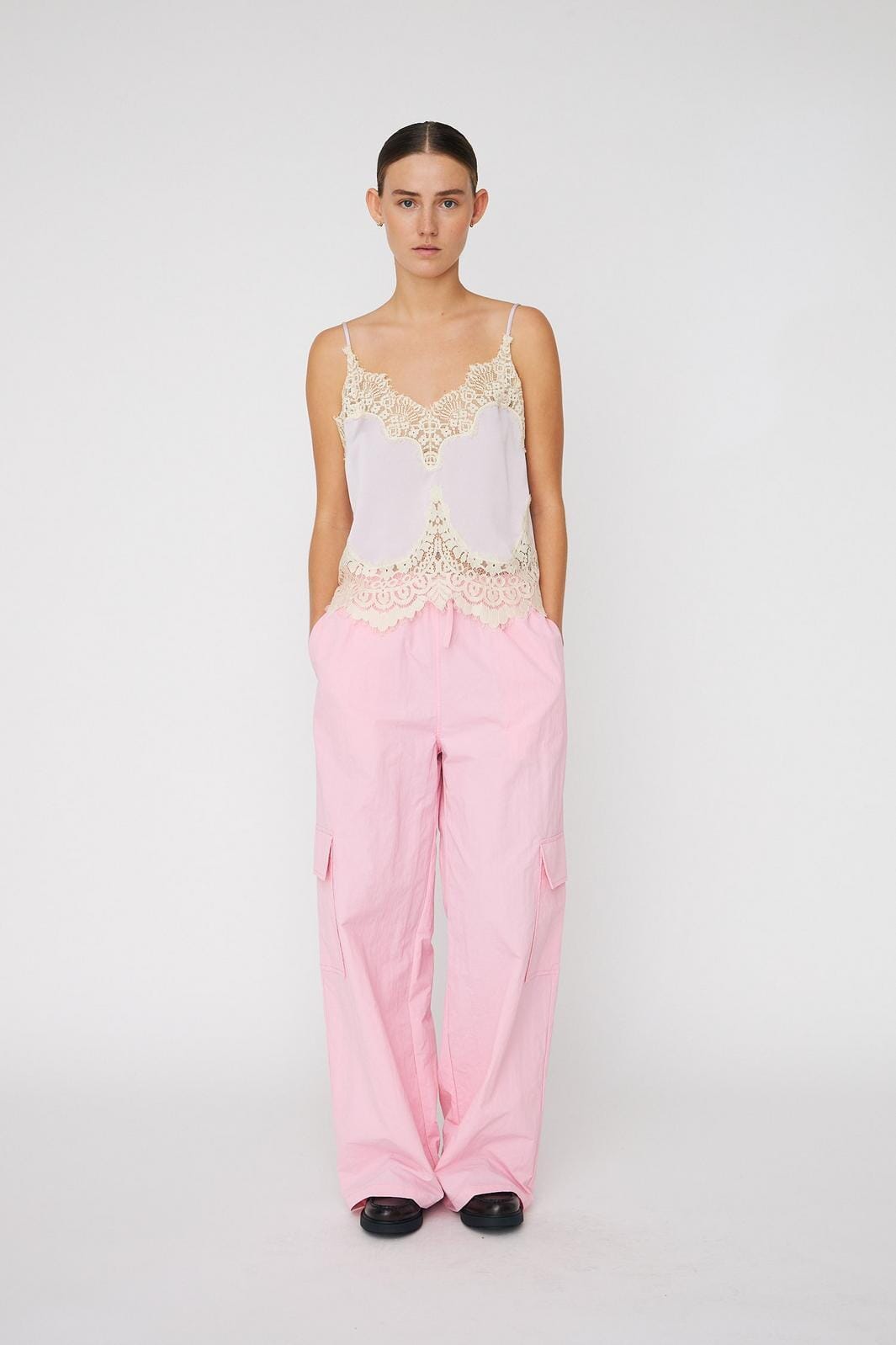 Vaaleanliila toppi Stella Novalta, jossa on pitsiyksityiskohtia pääntien ja helman reunassa. Toppi on valmistettu kierrätetystä polyesteristä ja siinä on ohuet spagettiolkaimet.