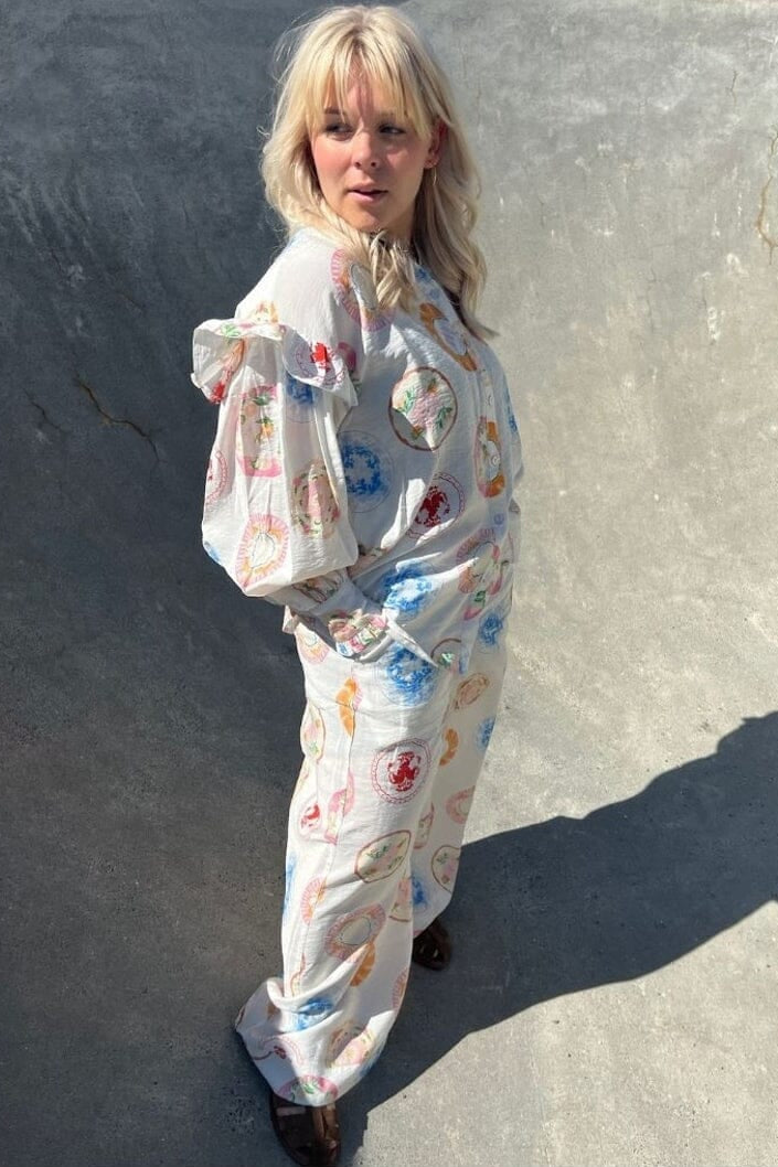 Housut merkiltä Stories From The Atelier By Copenhagen Shoes, joissa on posliinista inspiroitu monivärinen printti. Leveät lahkeet ja väljä istuvuus luovat rennon ilmeen.