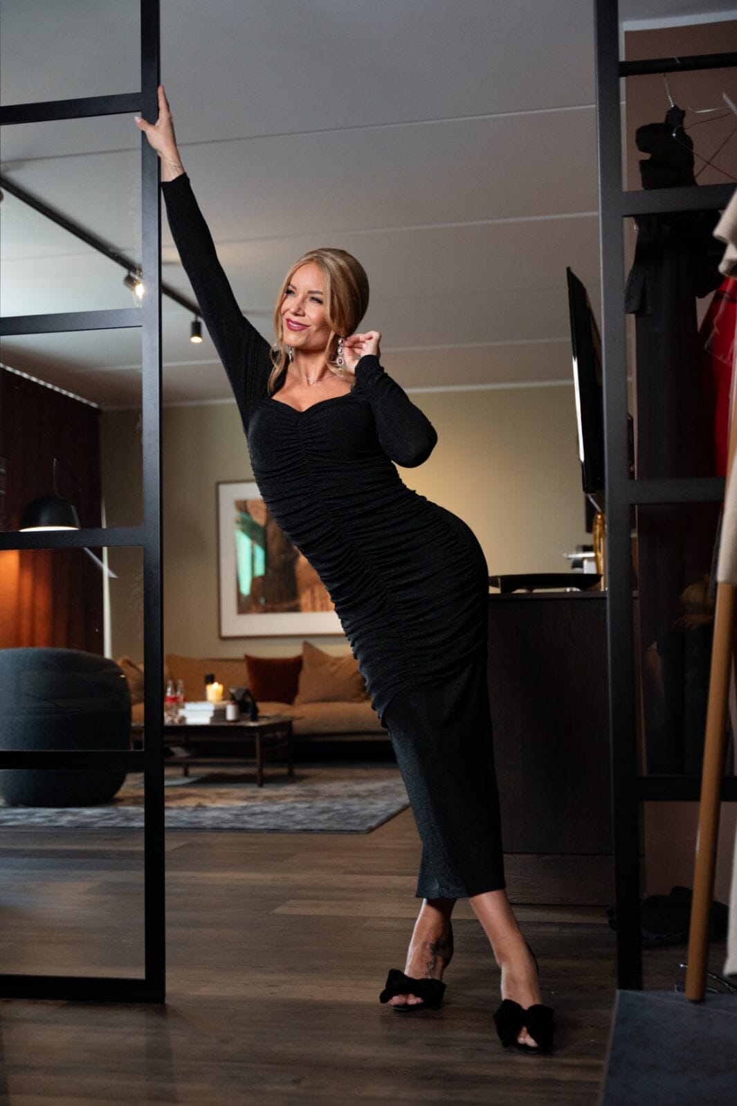 Musta juhlapuku Valentin Studiolta, jossa on rypytys yksityiskohtia koko puvussa. Siinä on pitkät hihat ja sydänaukko, joka korostaa kehon luonnollisia linjoja.