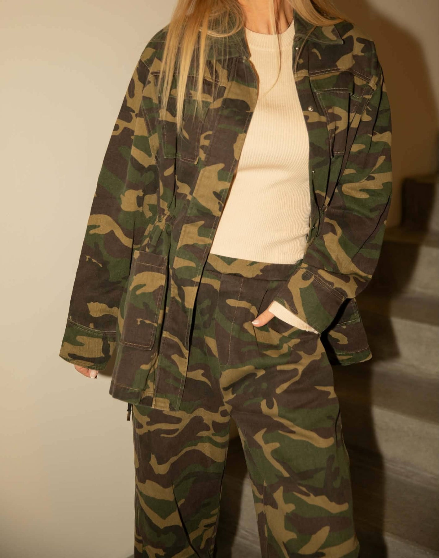 Väljä takki Valentin Studiolta, valmistettu 100 % puuvillasta armeijanvihreällä maastokuviolla. Takissa on rento istuvuus ja se on suunniteltu arkikäyttöön.